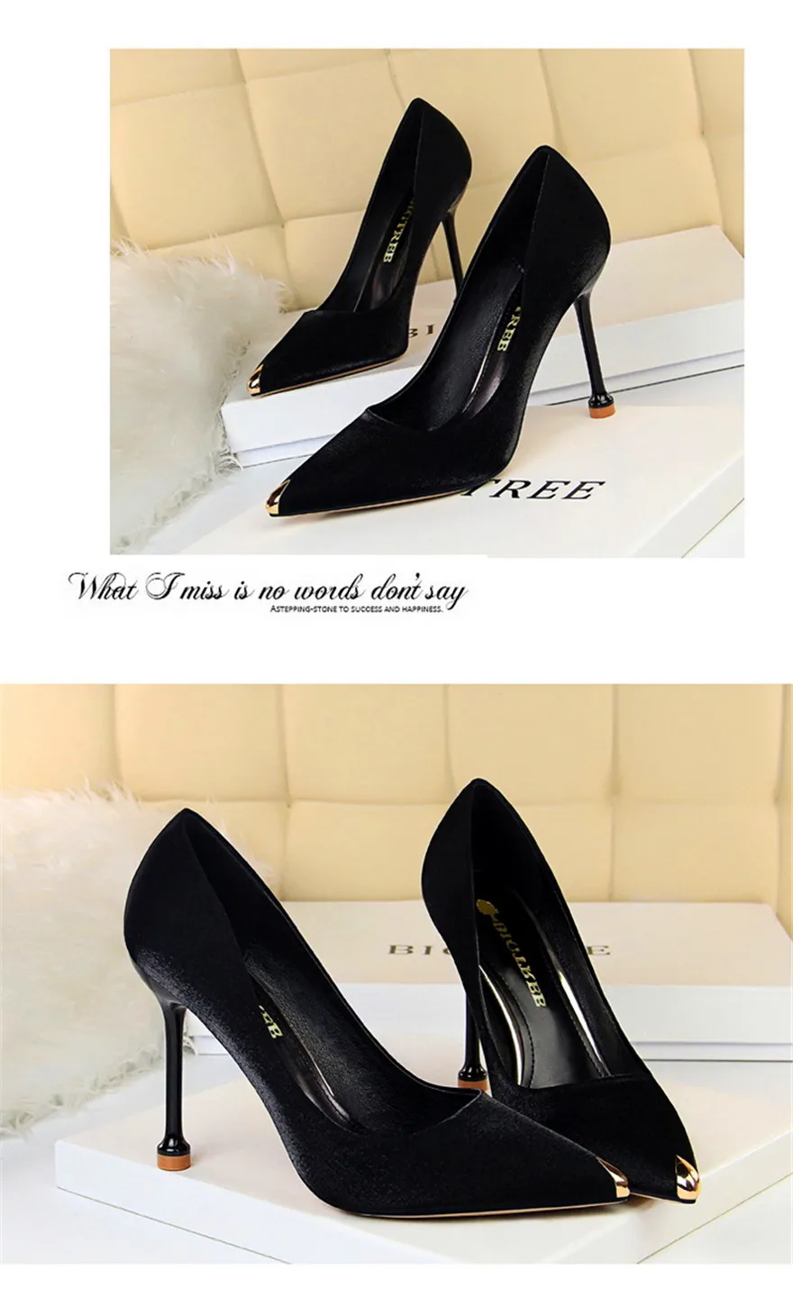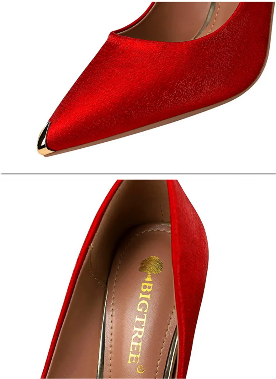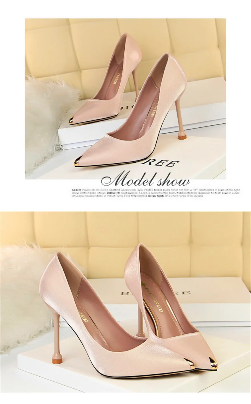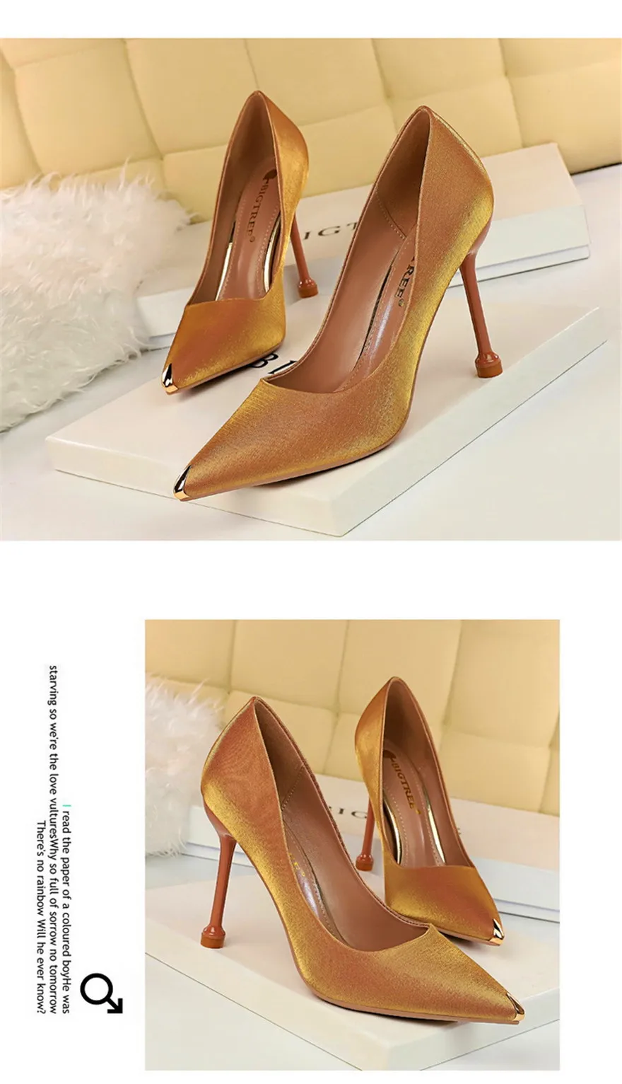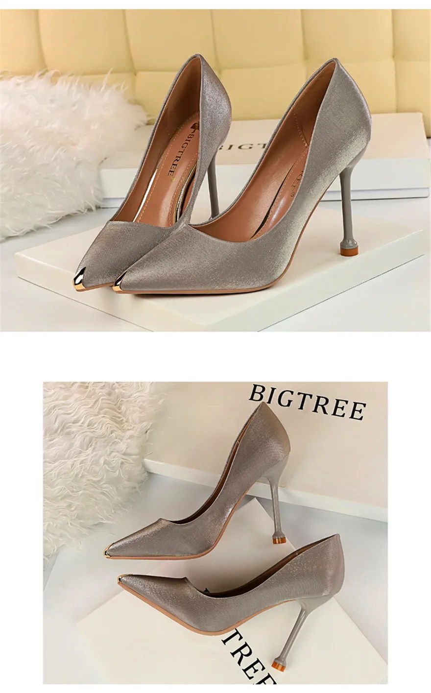BIGTREE Shoes Metal Pointed Toe Elegent Women Pumps Stilettos High Heels Party Soft Silk Fashion Woman Office Shoes Blue Apricot