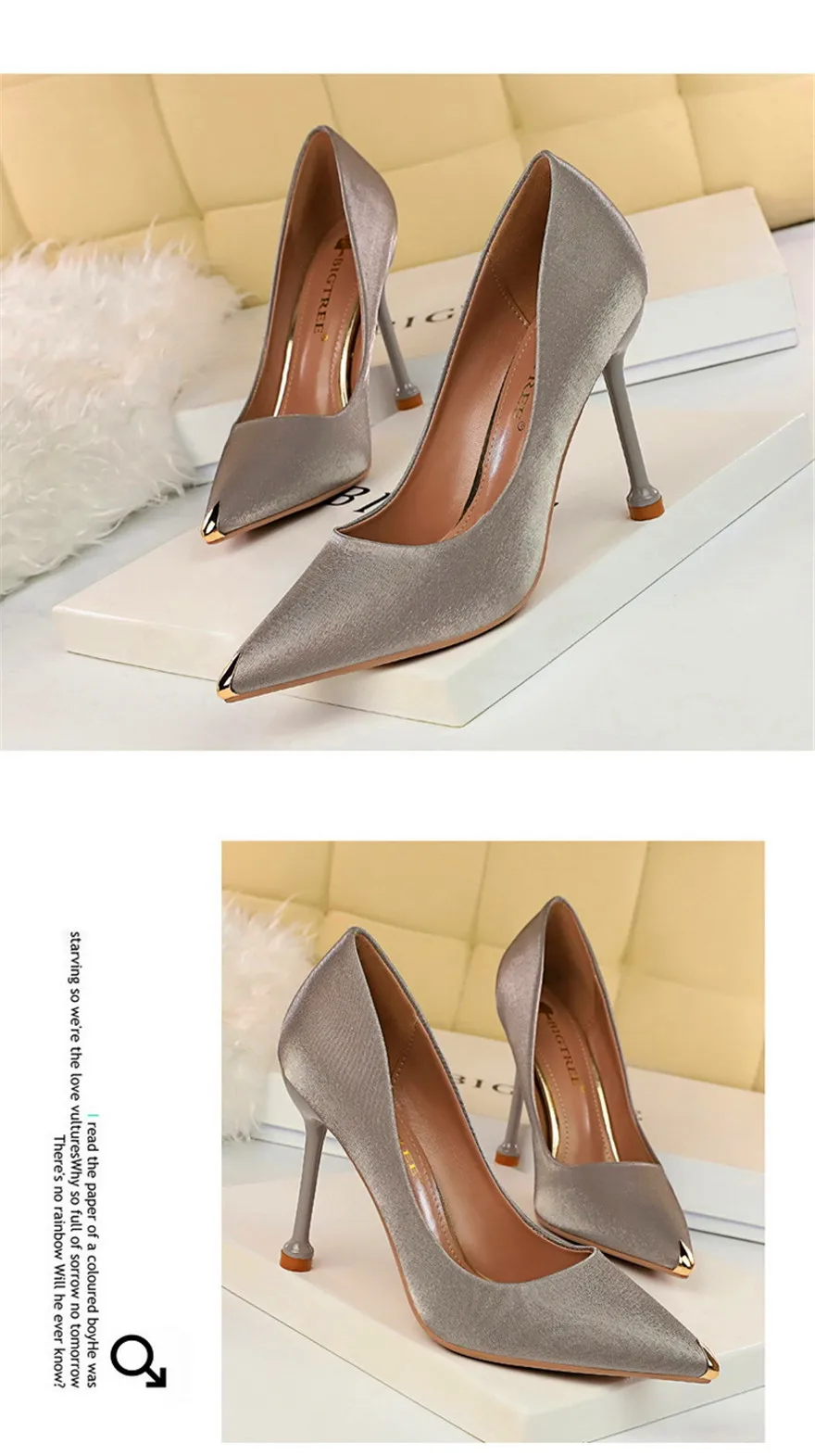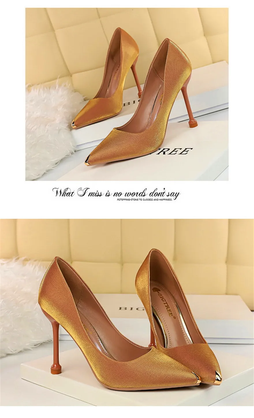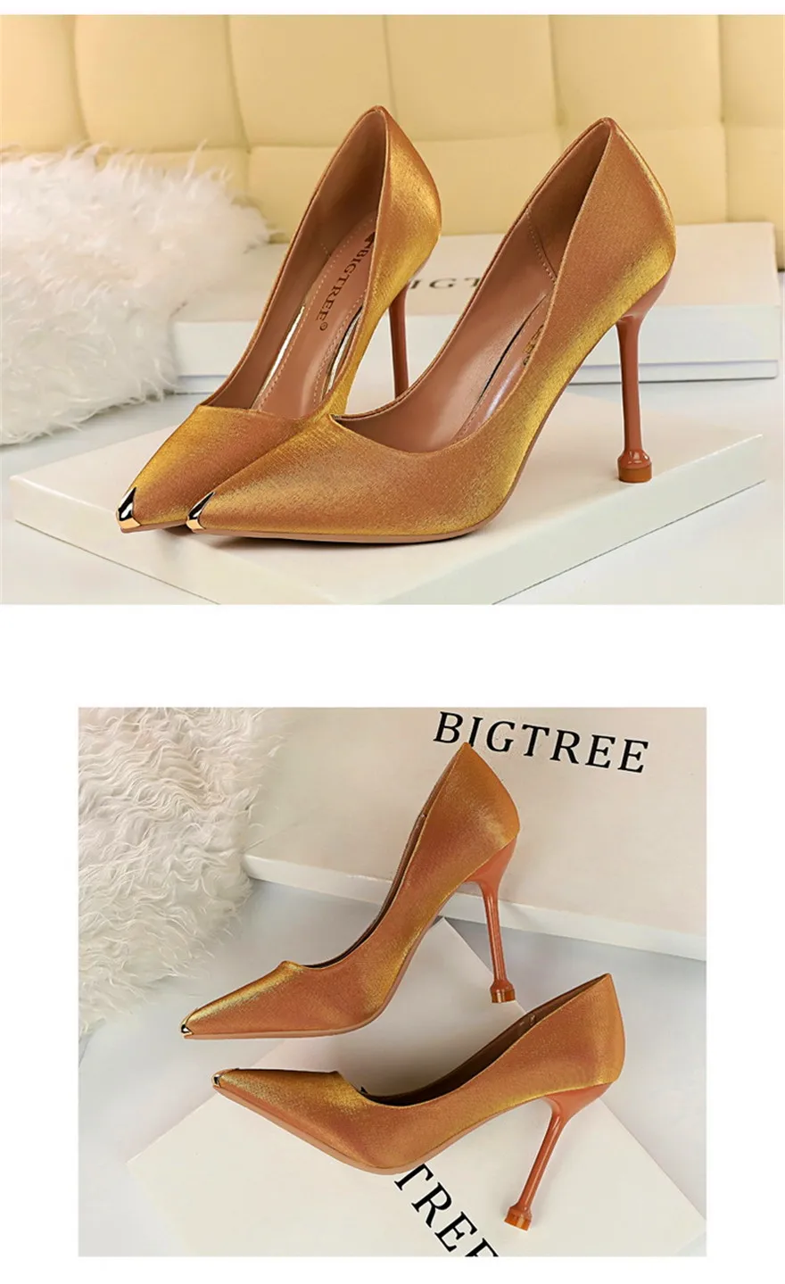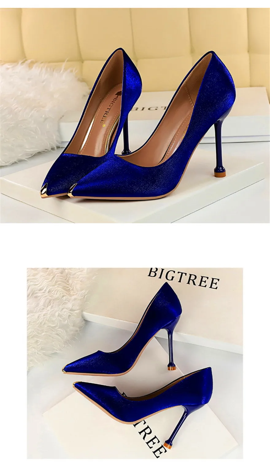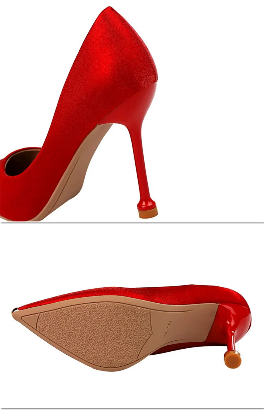 BIGTREE Shoes Metal Pointed Toe Elegent Women Pumps Stilettos High Heels Party Soft Silk Fashion Woman Office Shoes Blue Apricot