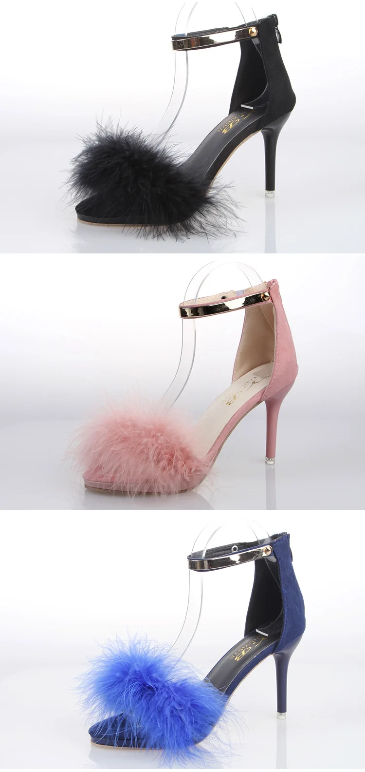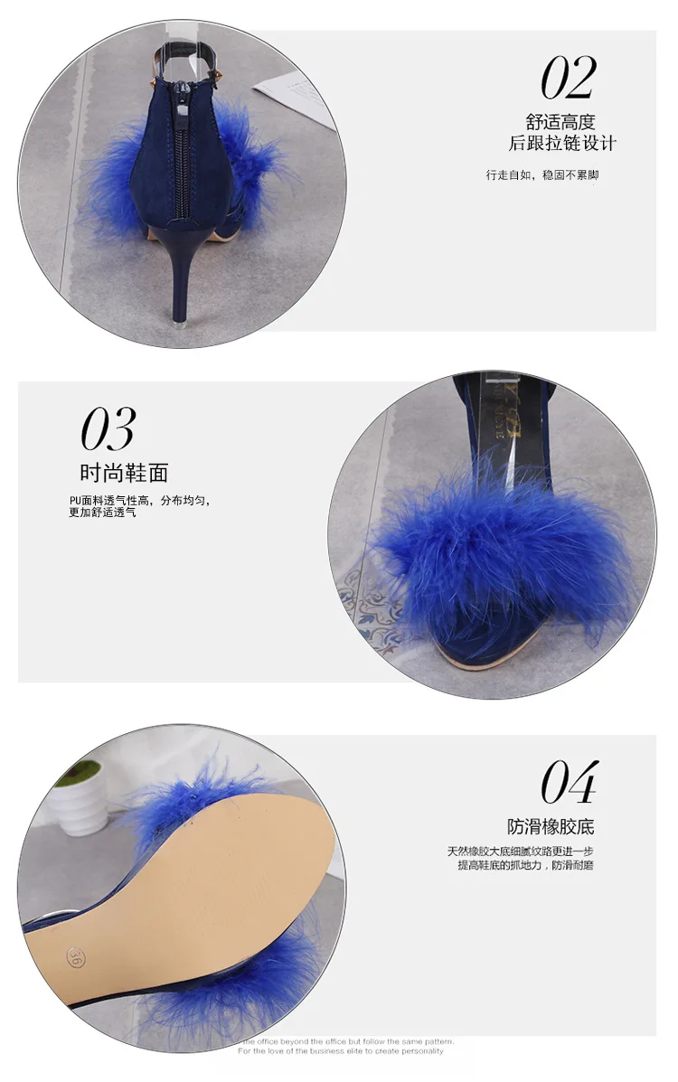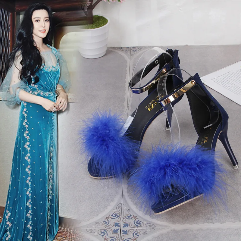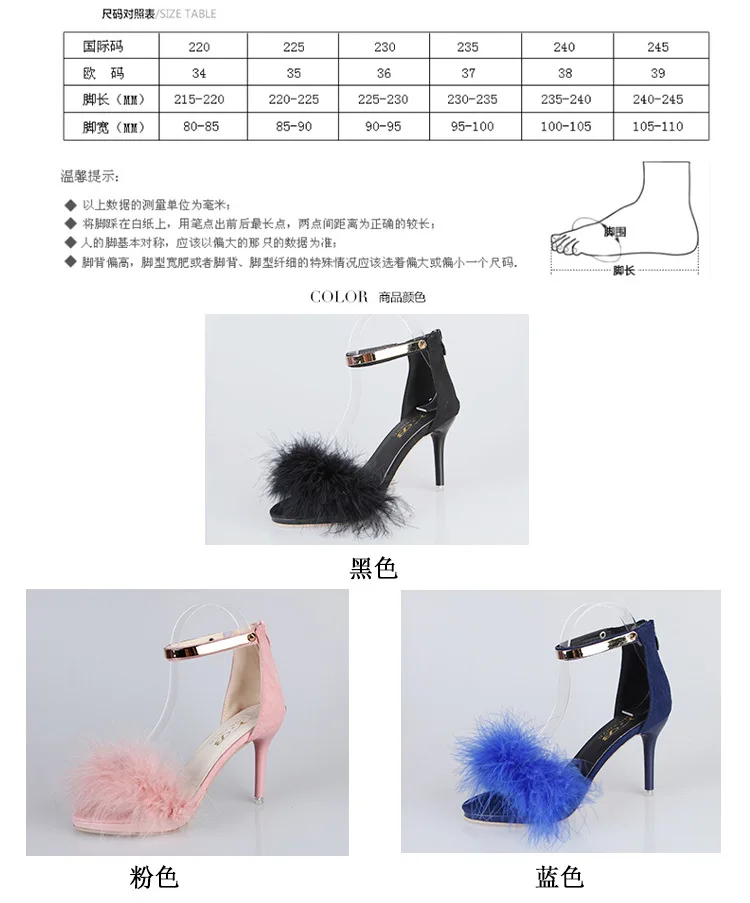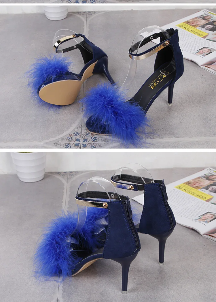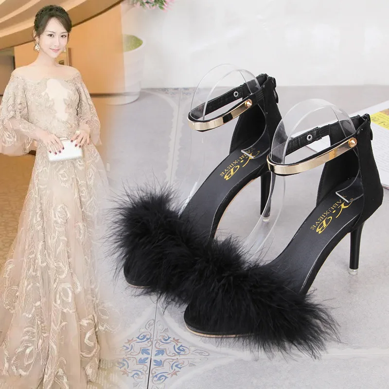 Black hairy summer new high-heeled sandals fashion female stiletto fish mouth high-heeled sandals cute style pink hairy shoes