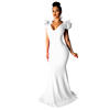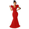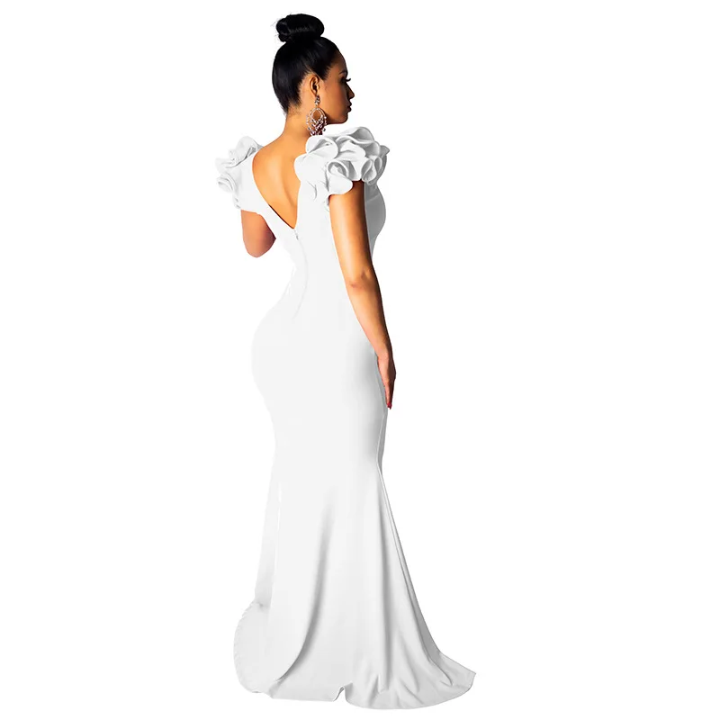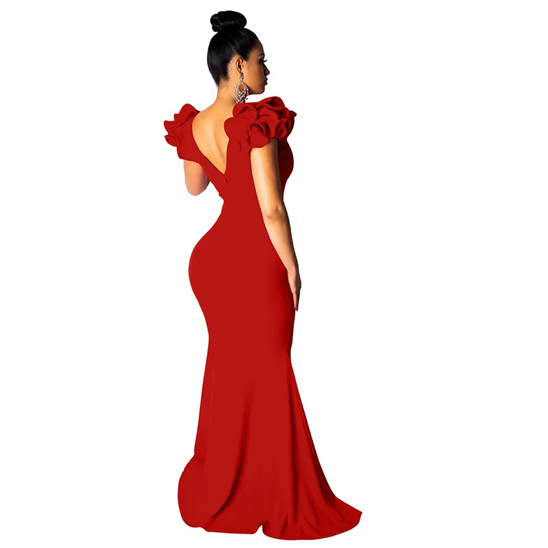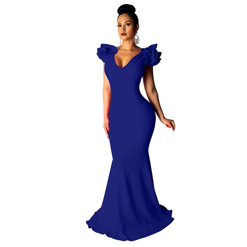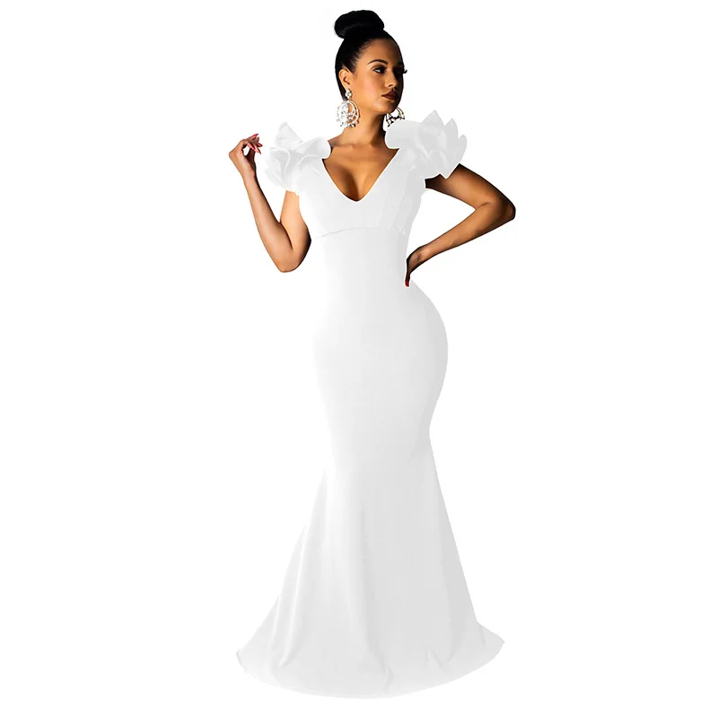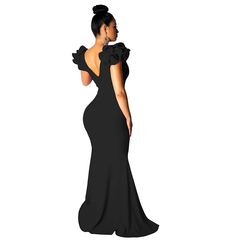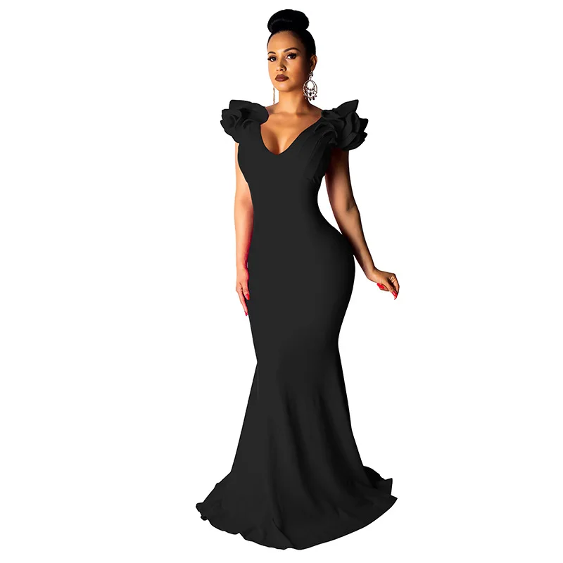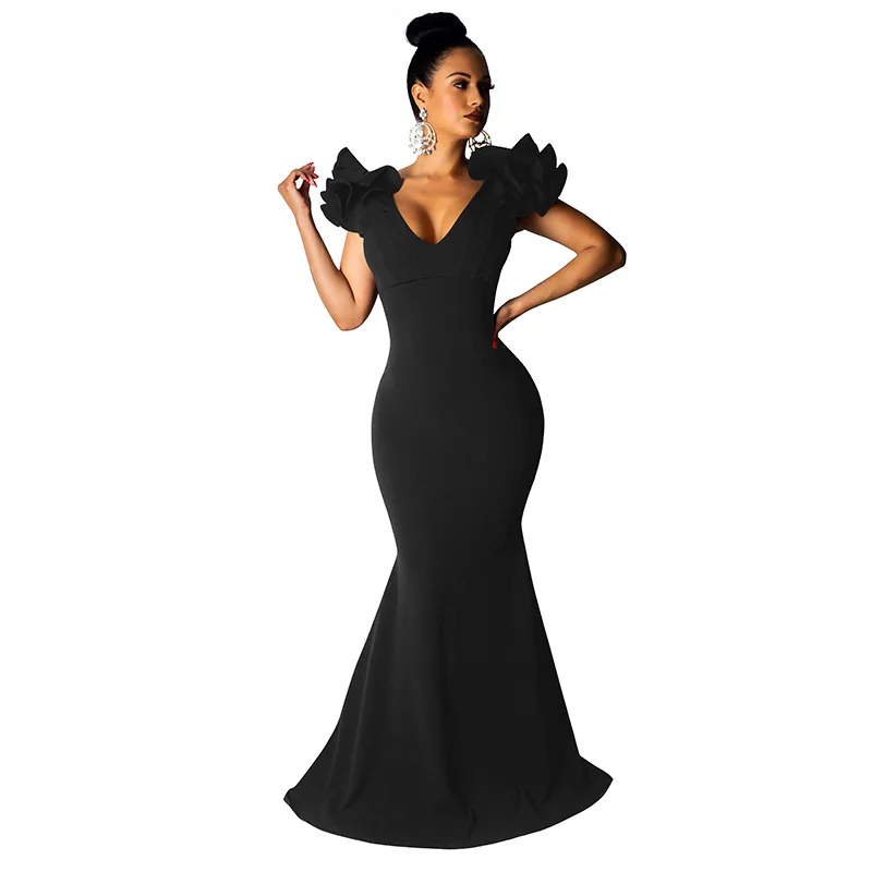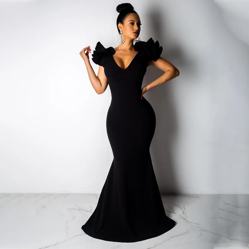 Black Women Long Maxi Dress Ruffle Sleeve Deep V Neck Sexy Bodycon Evening Party Dress Elegant Sheer Mermaid Festival Vestidos