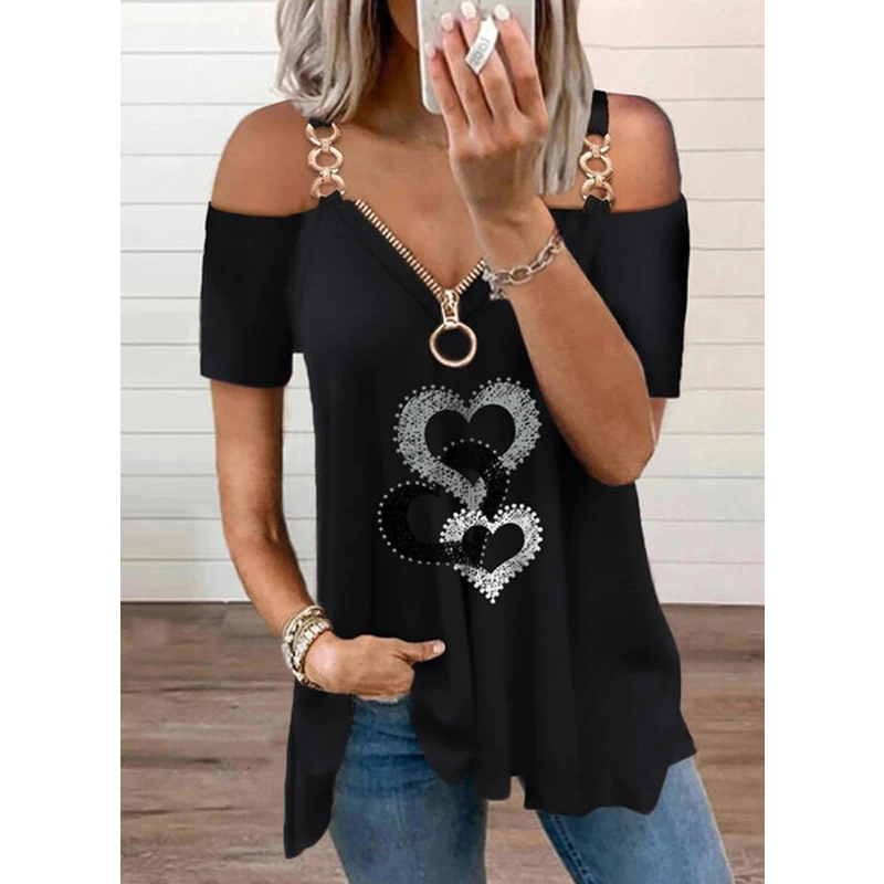 Blouse Women Sexy Cold Shoulder Heart Print Strap Tops V-neck Summer Vest Casual Short Sleeve Shirts Top Blouse Plus Size