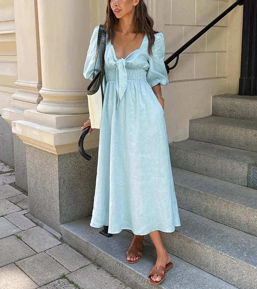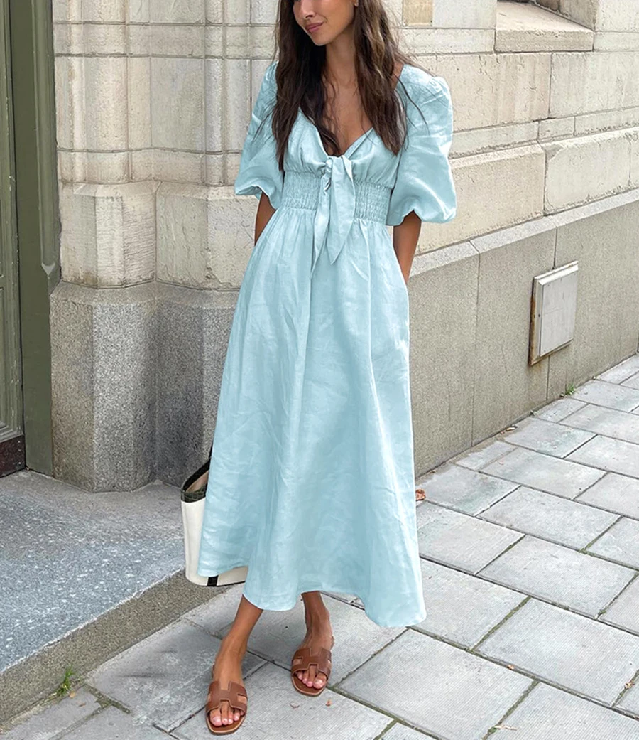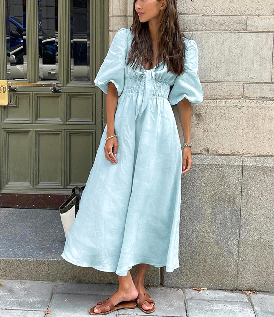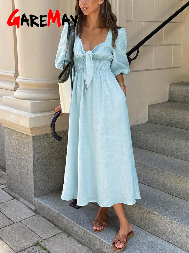 Blue Women’s Summer Cotton Linen Dress Sexy A-line Casual Elegant Long Midi Dress Puff Sleeve Vintage Dresses for Women 2024