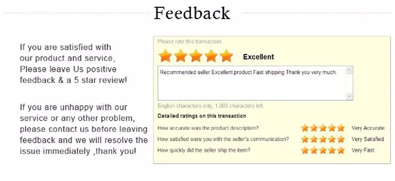 If there is anything wrong with the parcel after you receive it, please contact us first before you open dispute or leave negative feedback