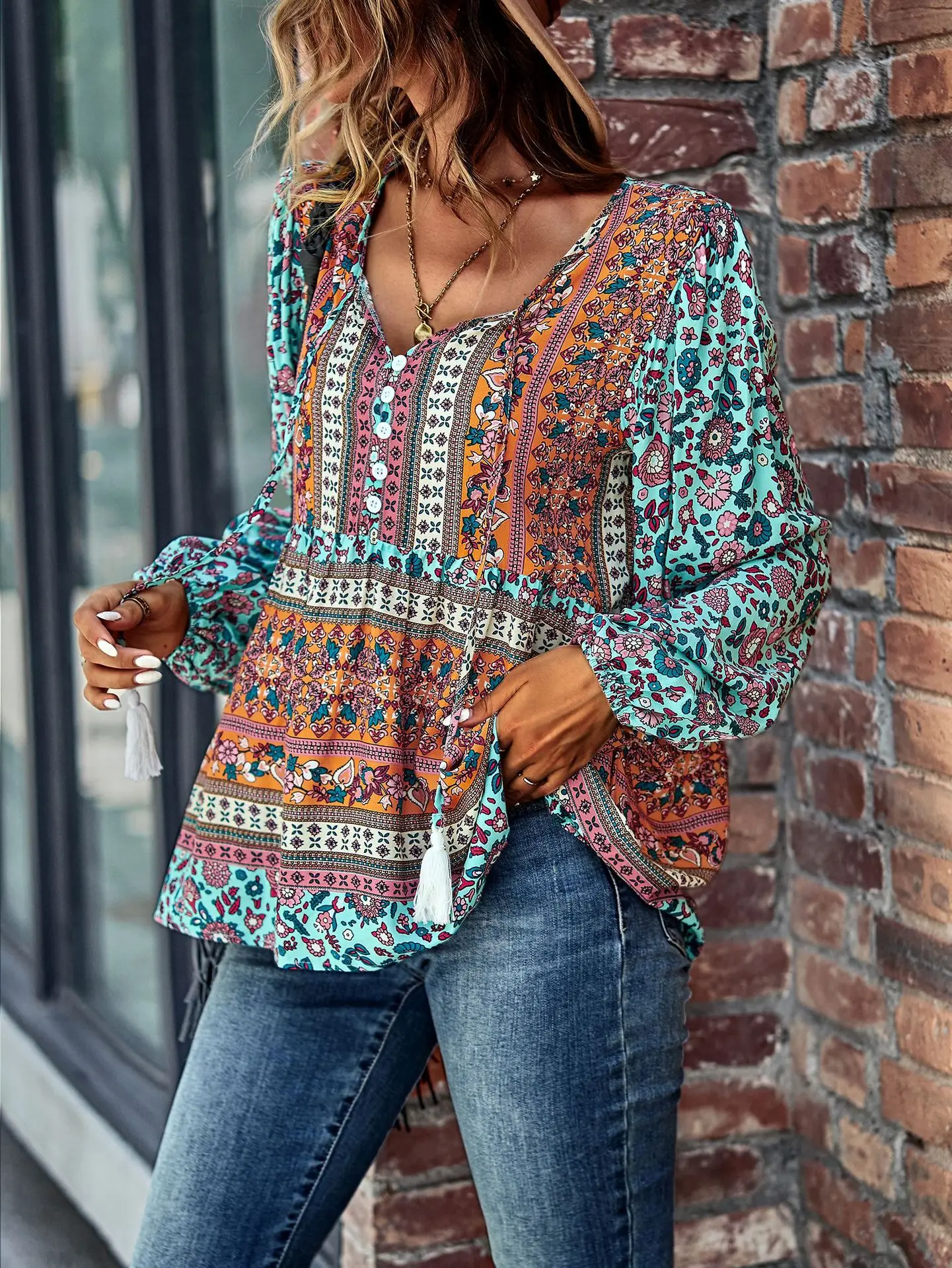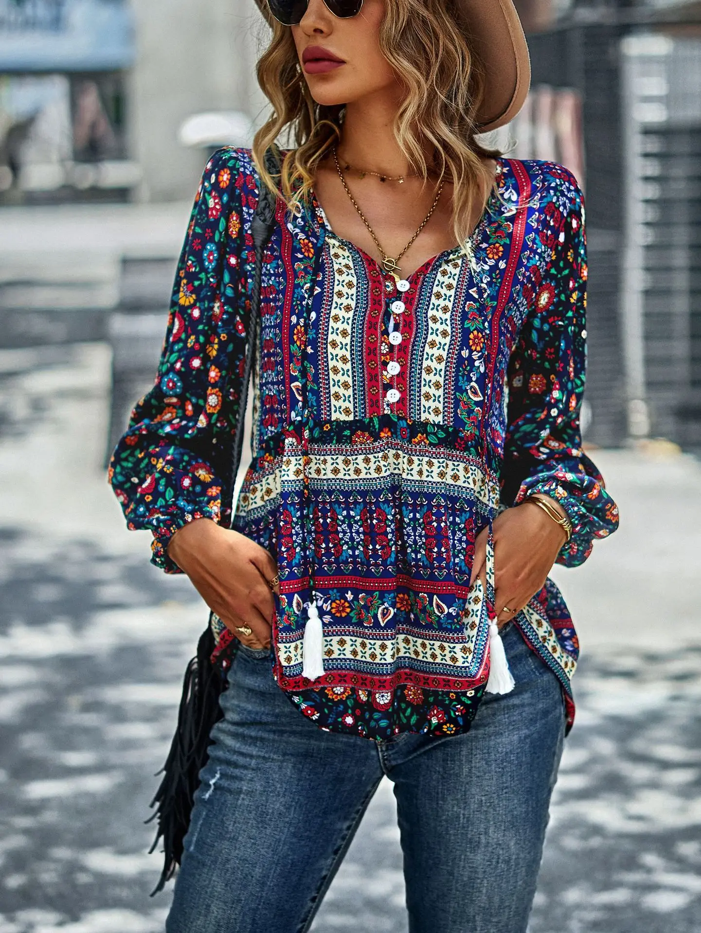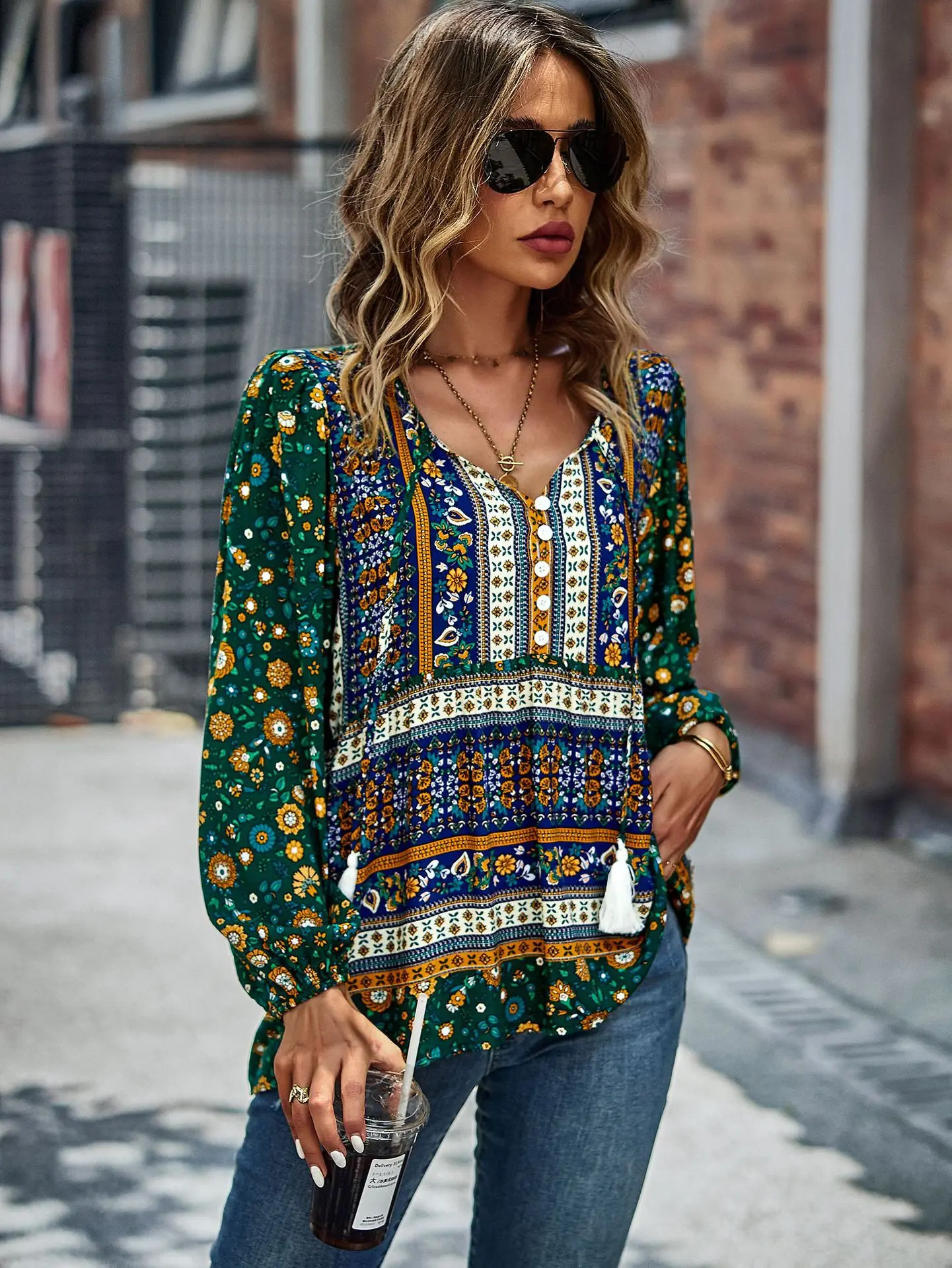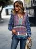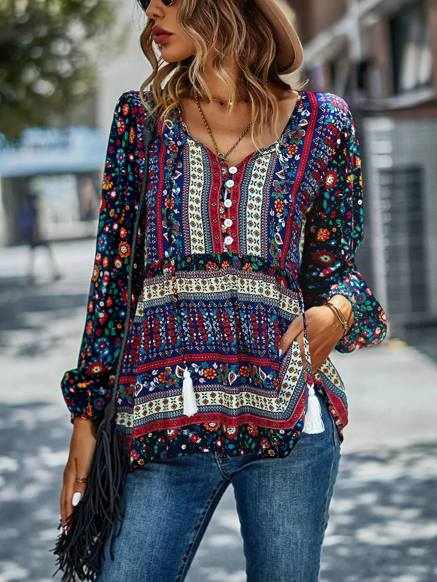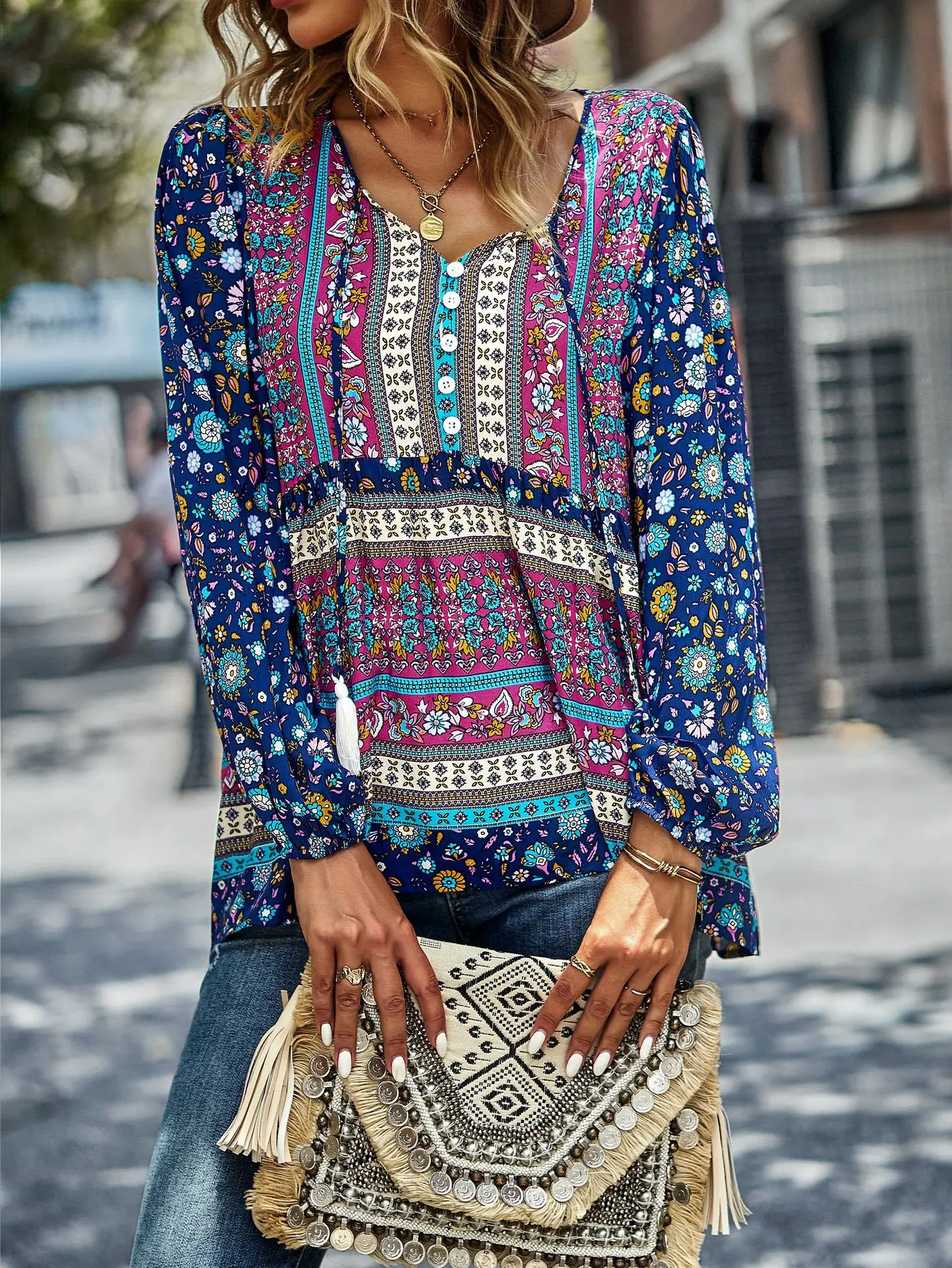 Bohemian Casual Vacation Tops Spring Autumn New Shirts Ladies Lace-up V Neck Pullover Loose Blouse Vintage Print Shirt Blusas