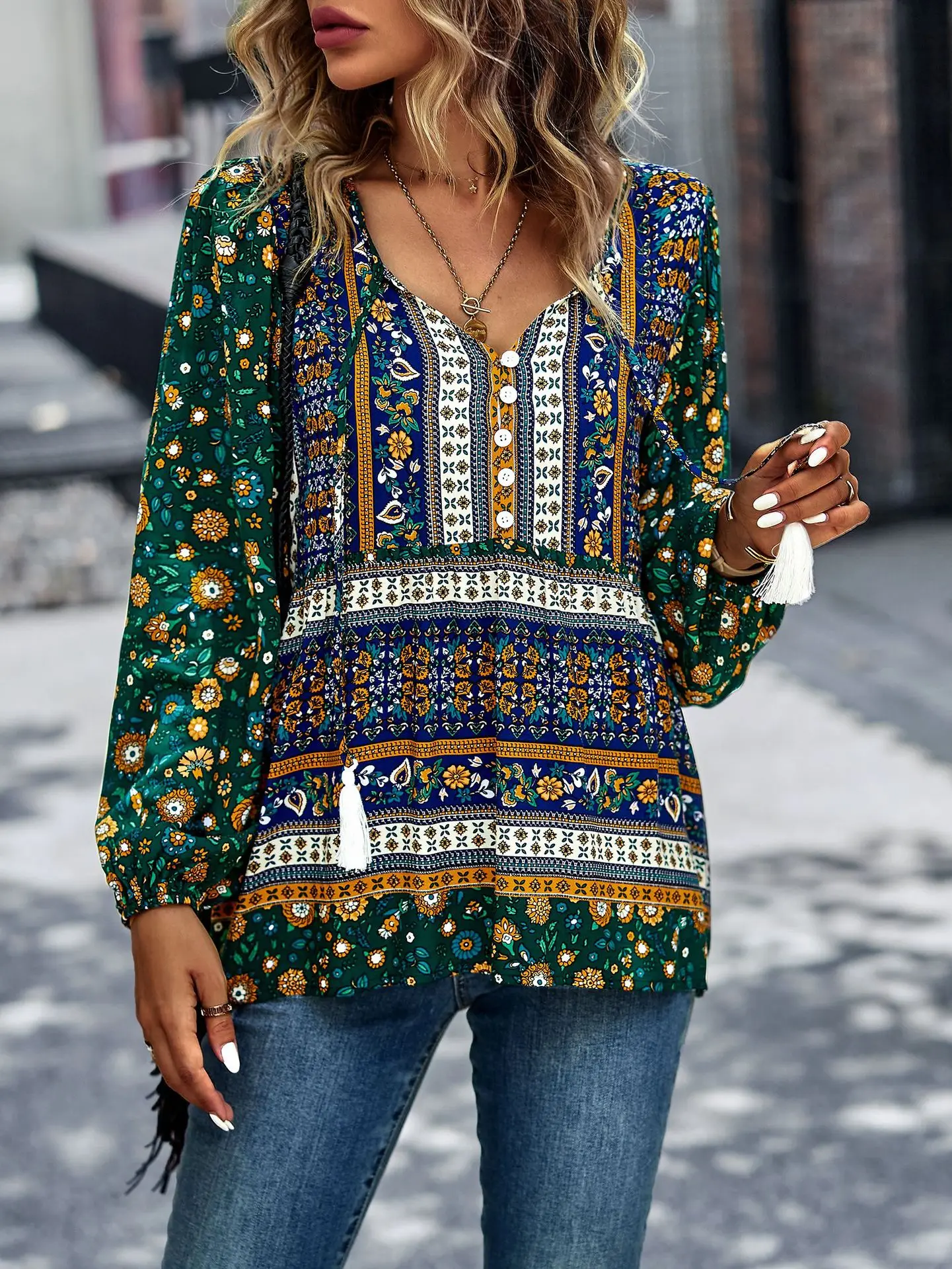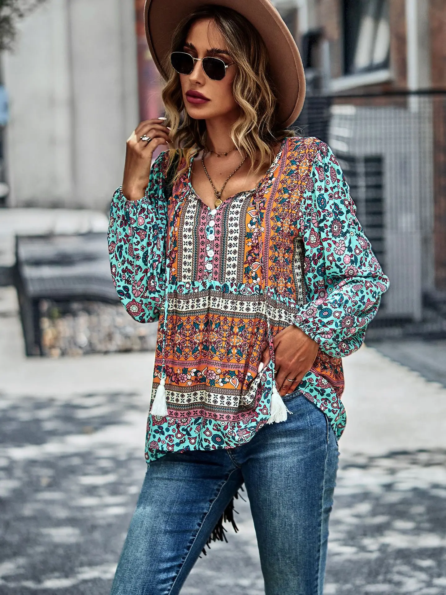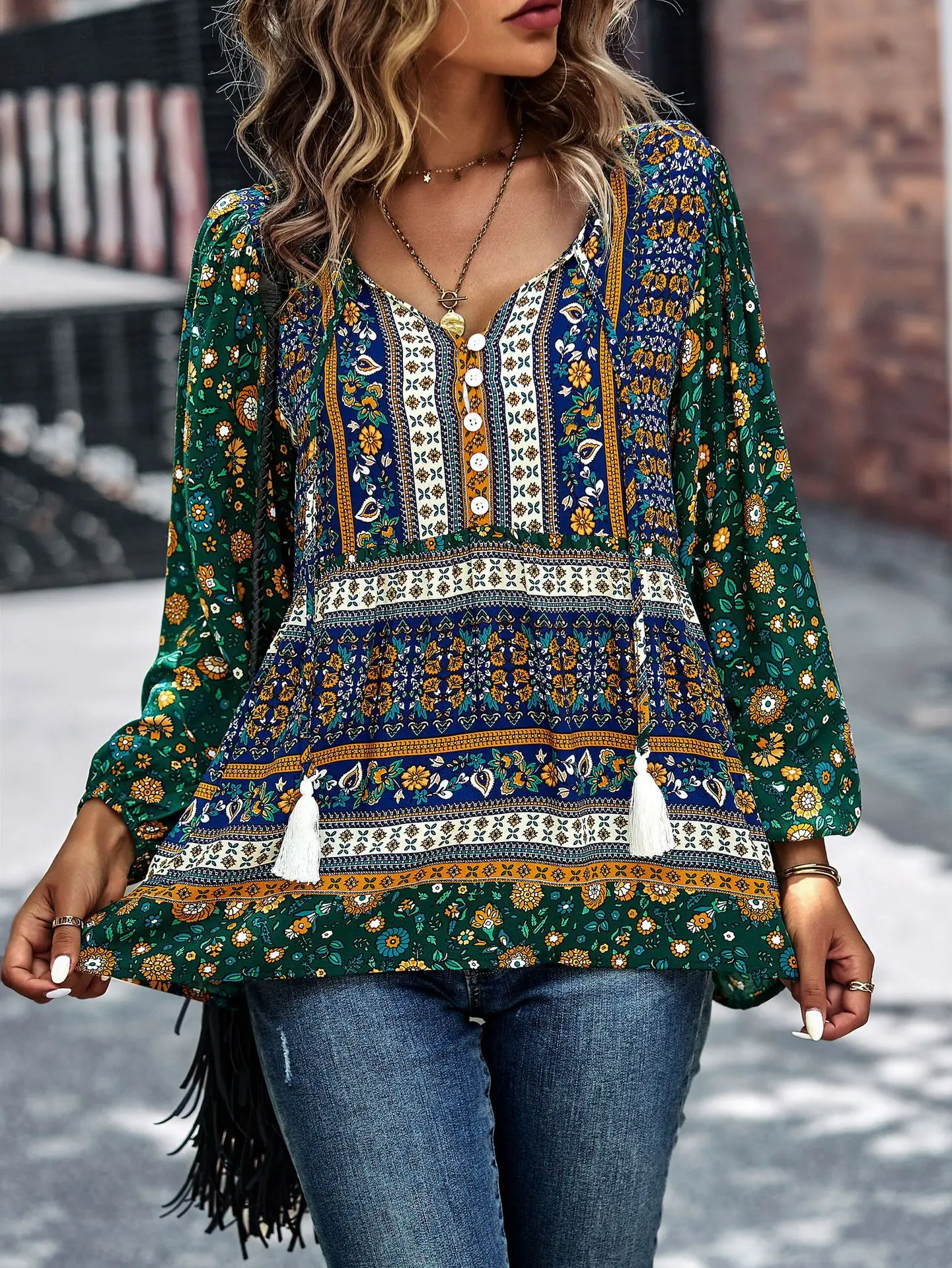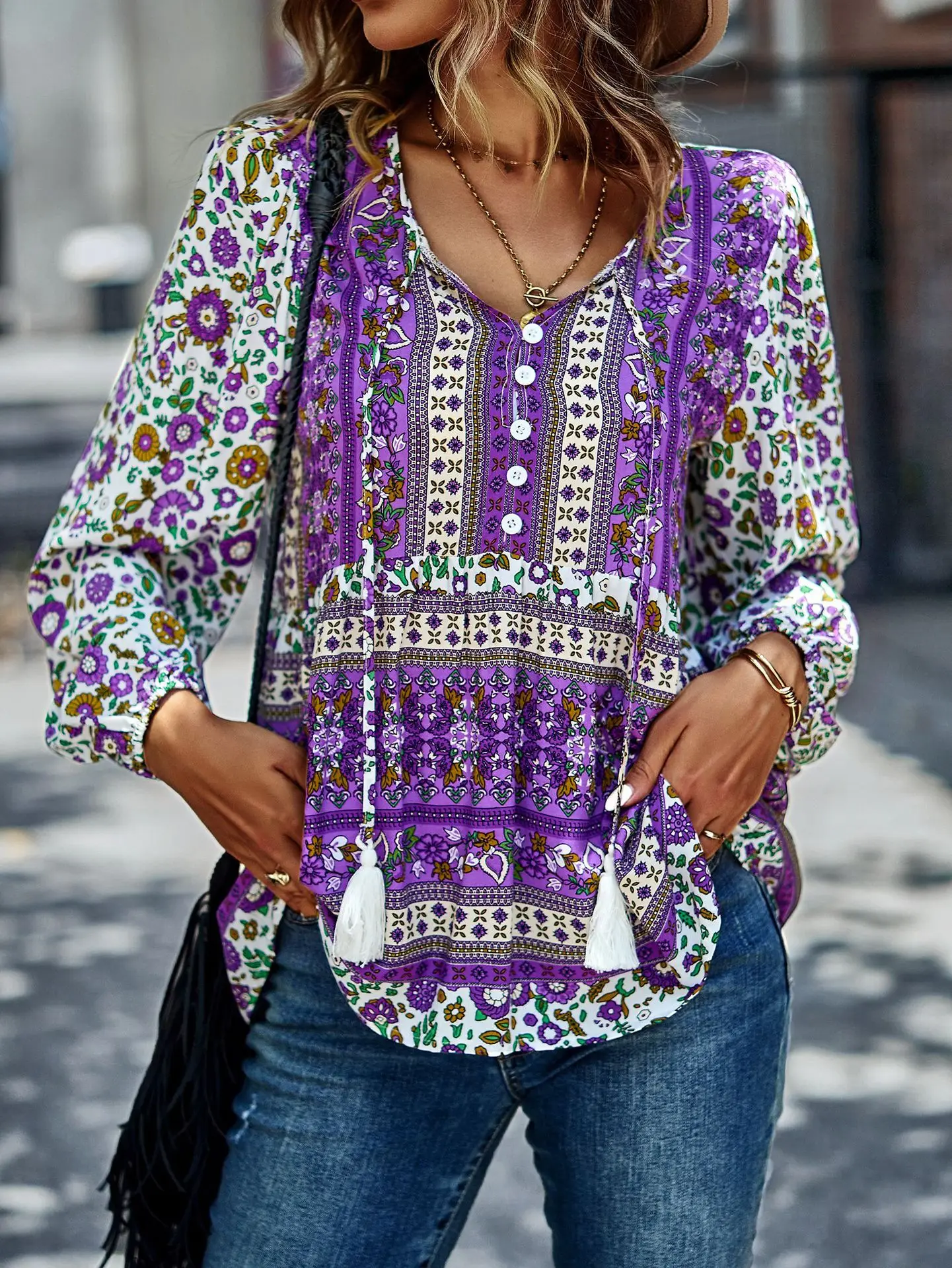 Bohemian Casual Vacation Tops Spring Autumn New Shirts Ladies Lace-up V Neck Pullover Loose Blouse Vintage Print Shirt Blusas