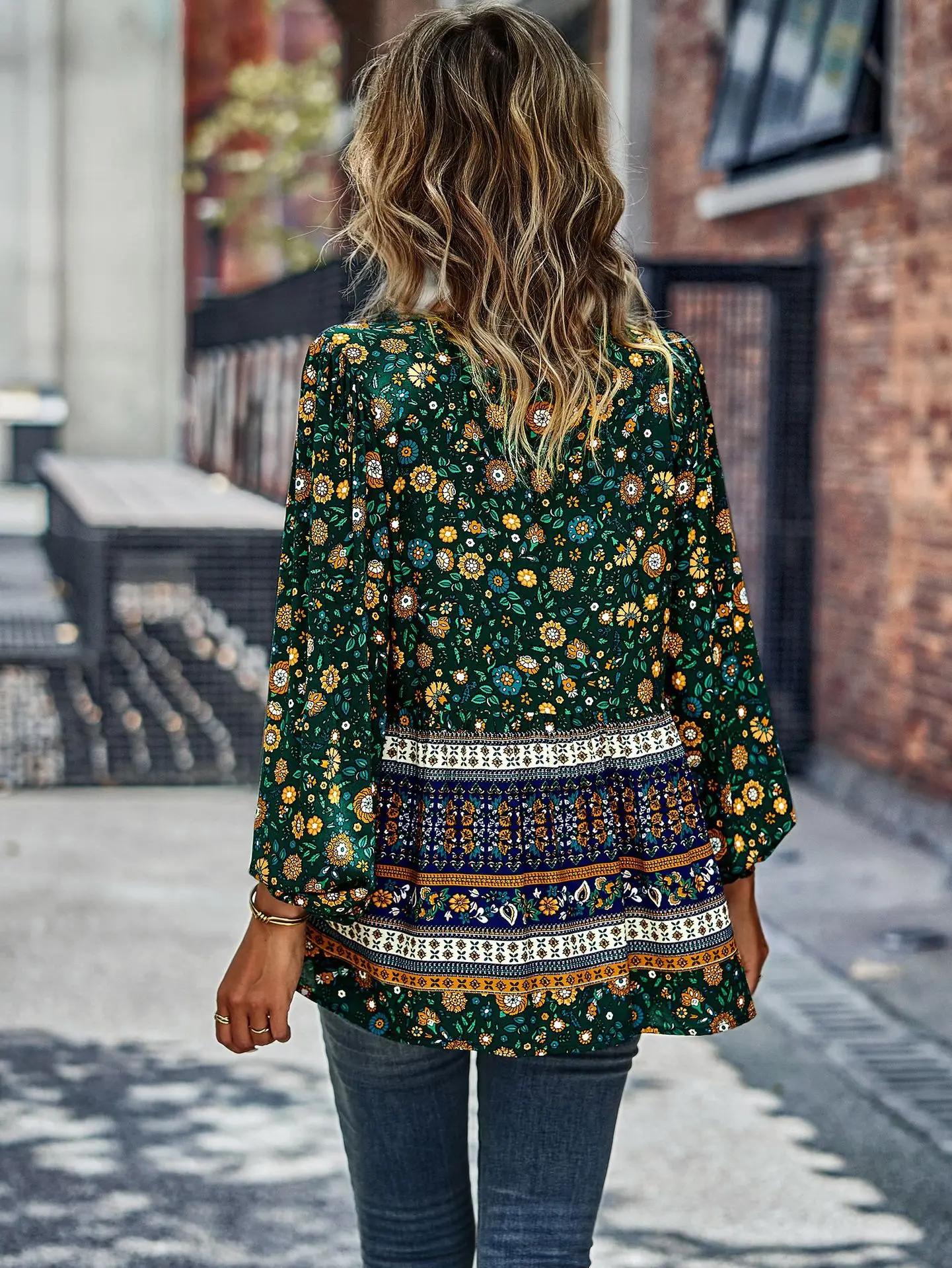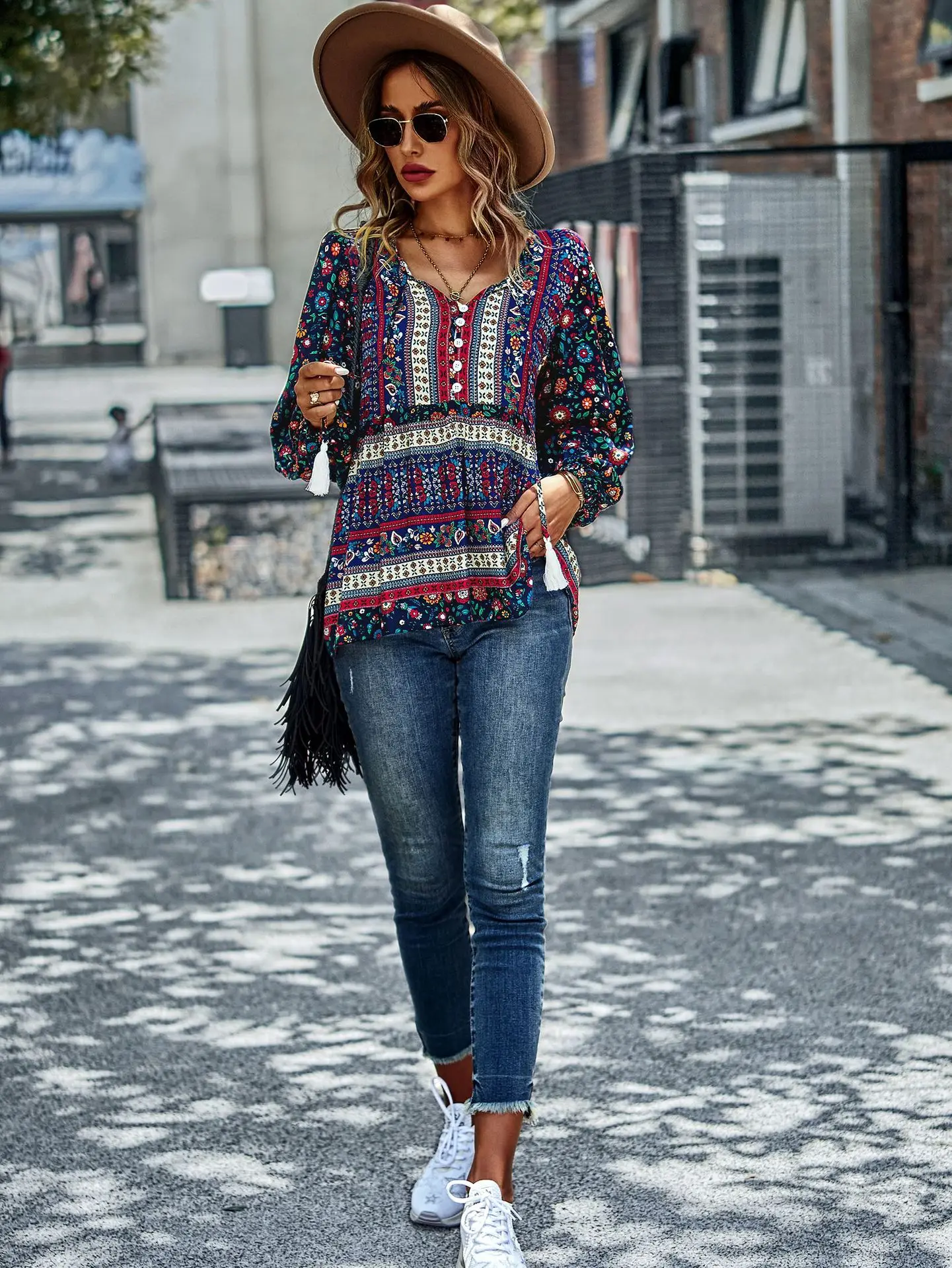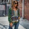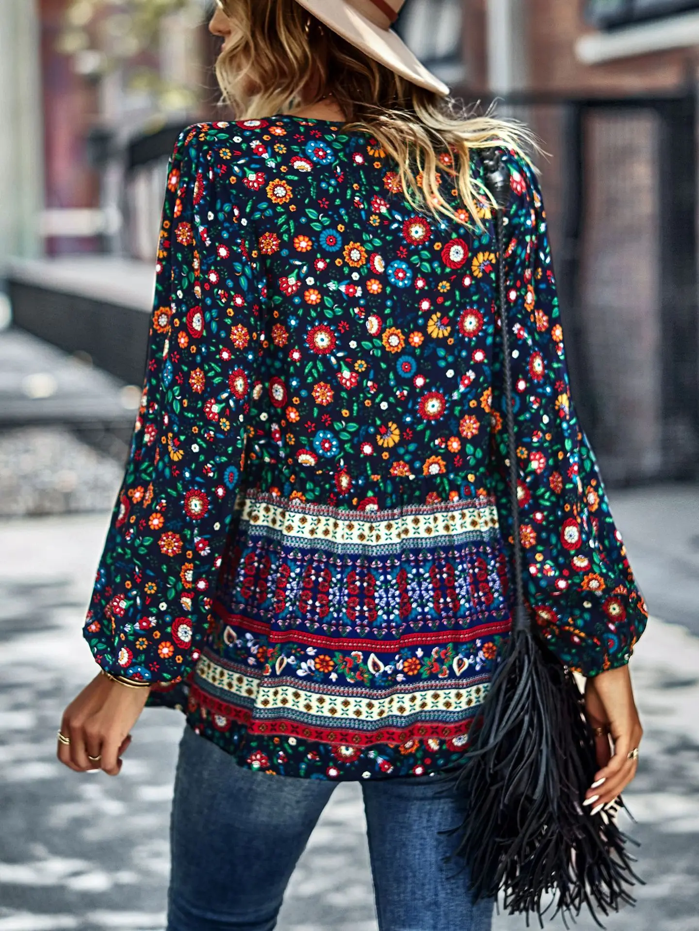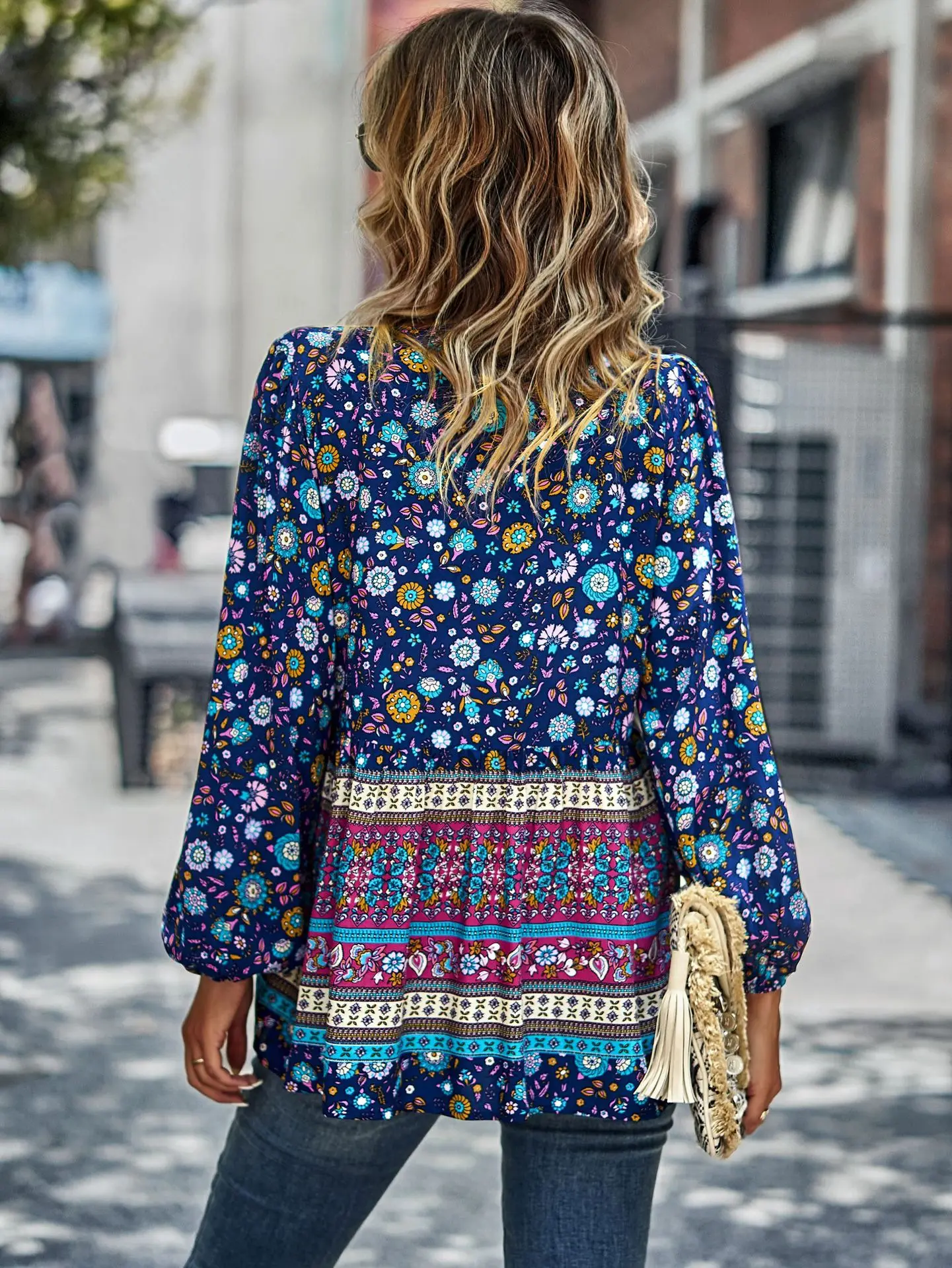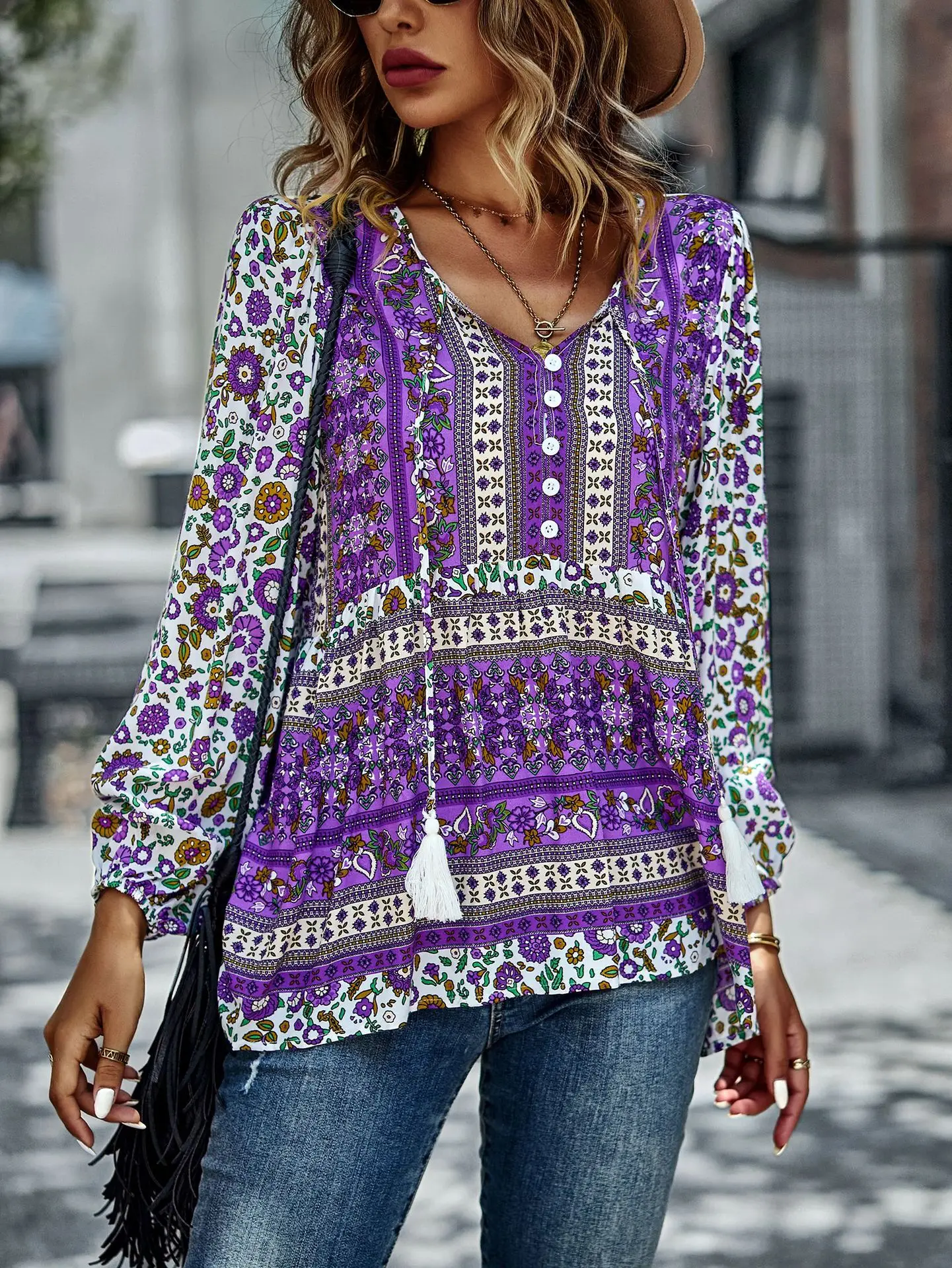 Bohemian Casual Vacation Tops Spring Autumn New Shirts Ladies Lace-up V Neck Pullover Loose Blouse Vintage Print Shirt Blusas