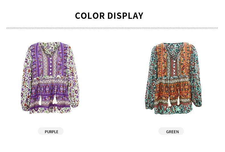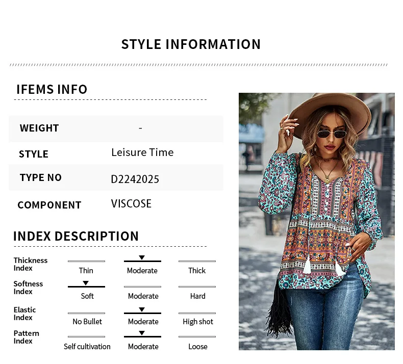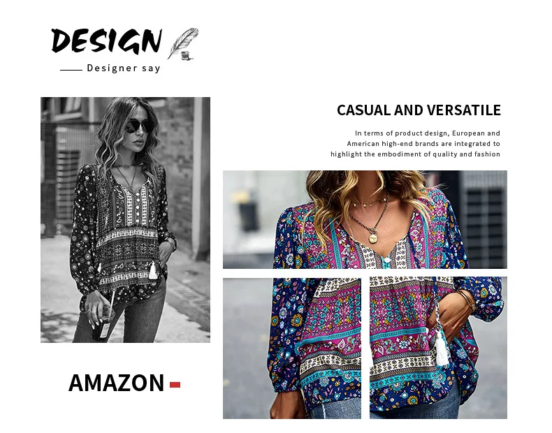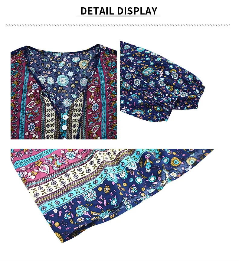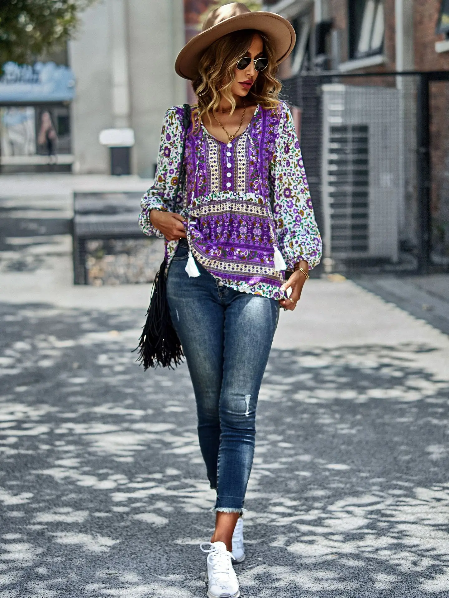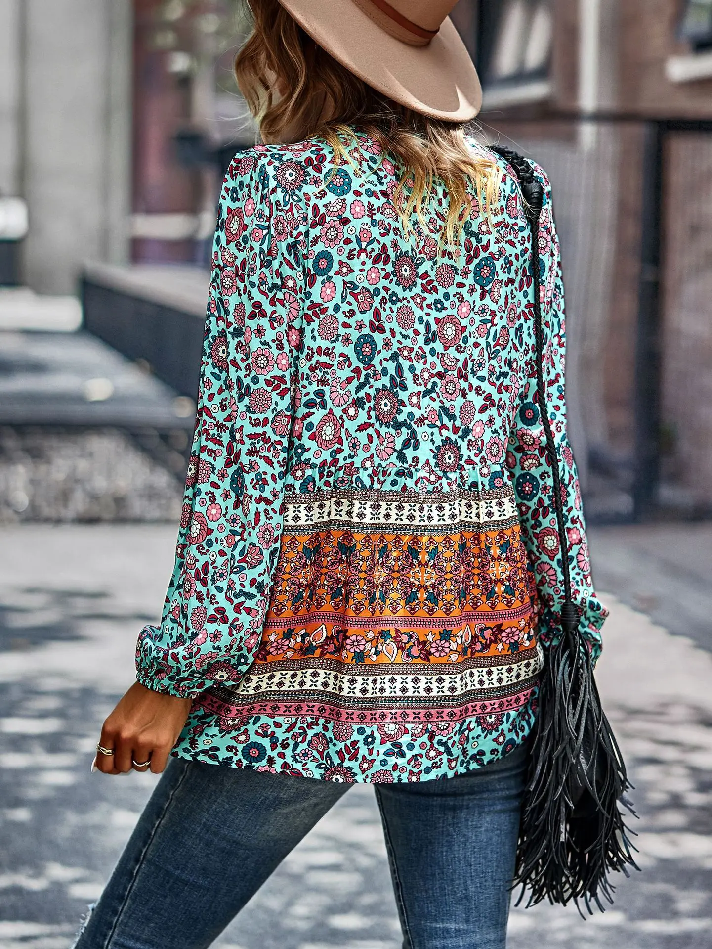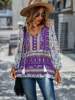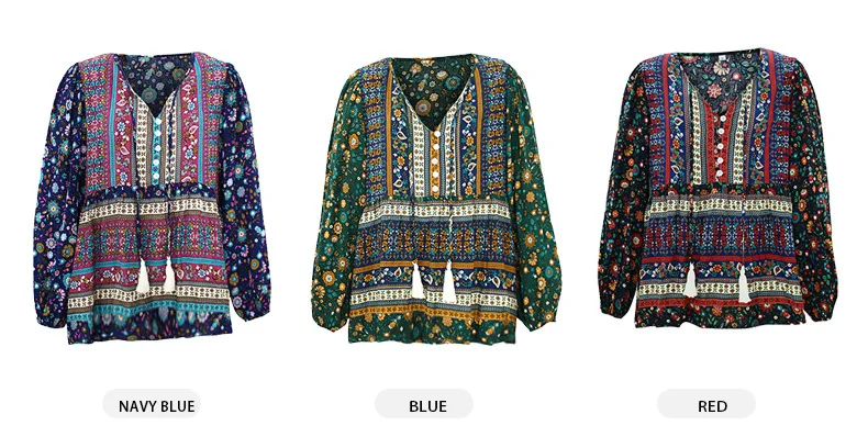 Bohemian Casual Vacation Tops Spring Autumn New Shirts Ladies Lace-up V Neck Pullover Loose Blouse Vintage Print Shirt Blusas
