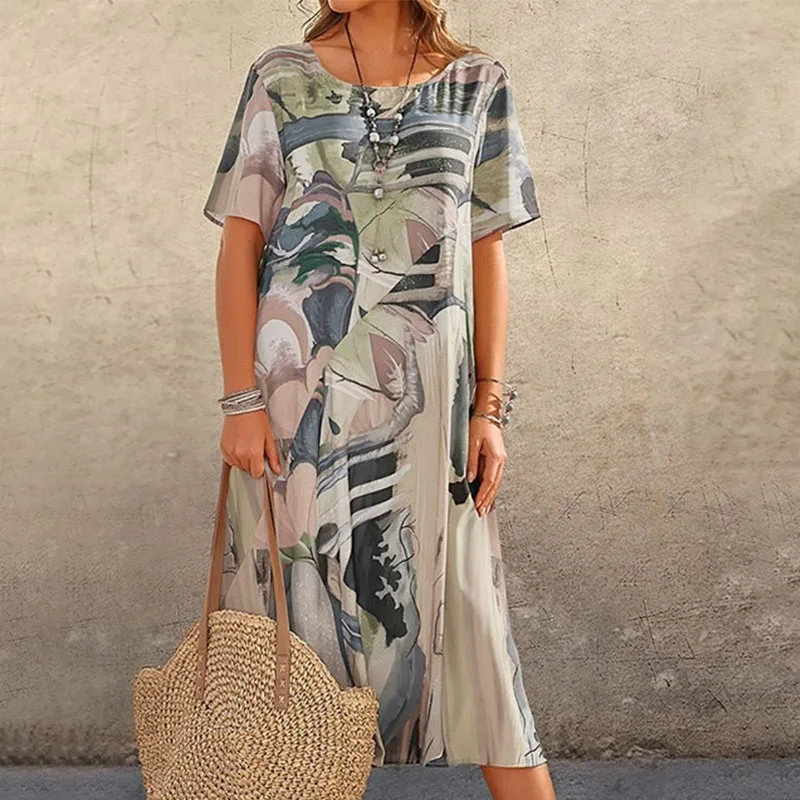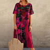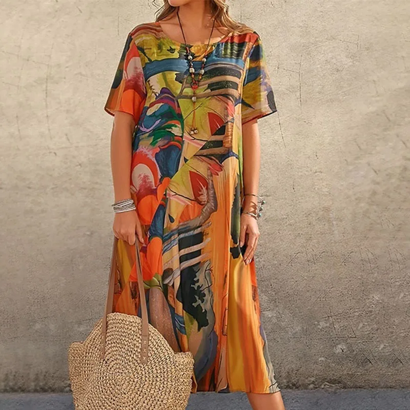 Bohemian Women Short Sleeve A-line Dress Summer O-Neck Mid Waist Full Art Print Mid-calf Length Dress Lady Loose Casual Vestidos
