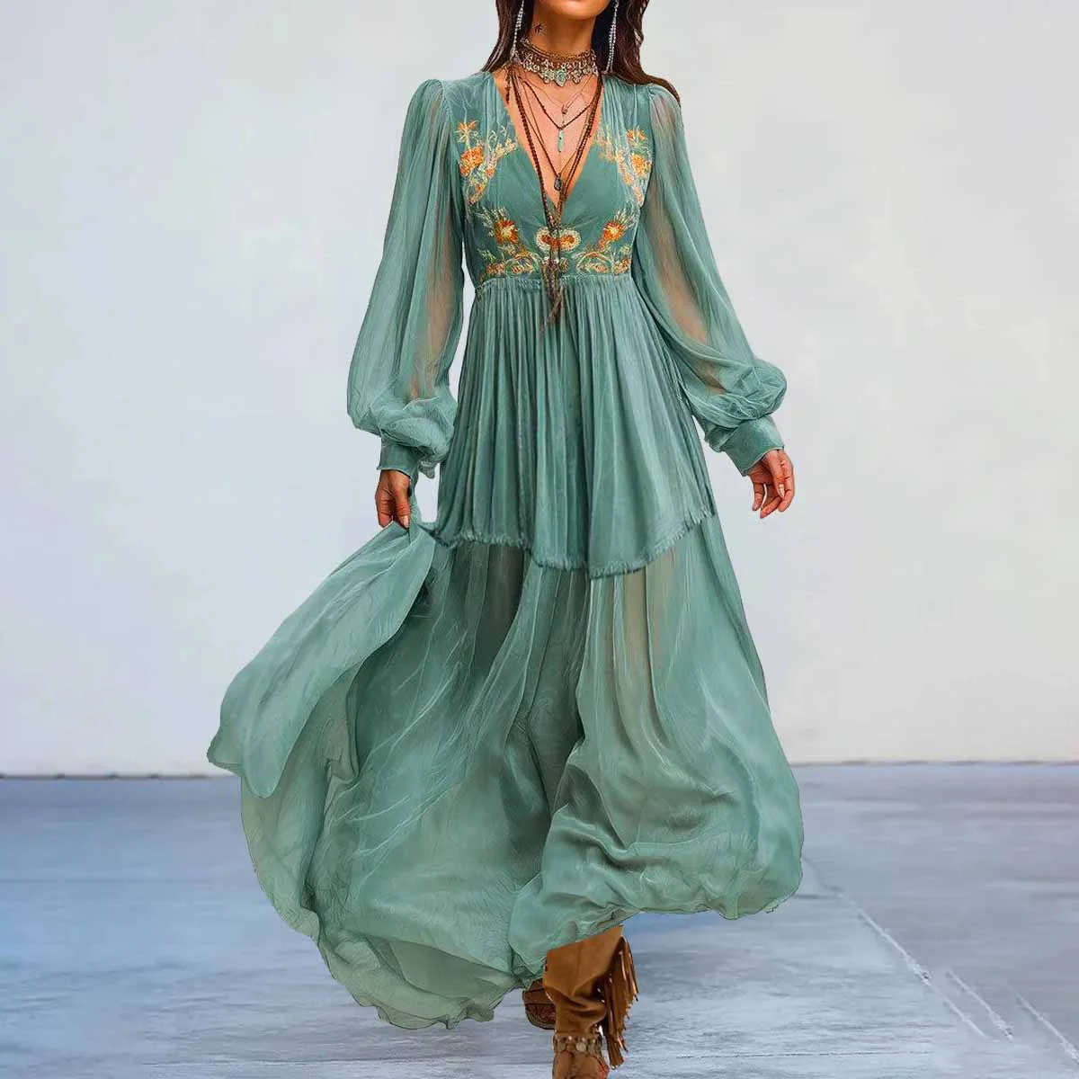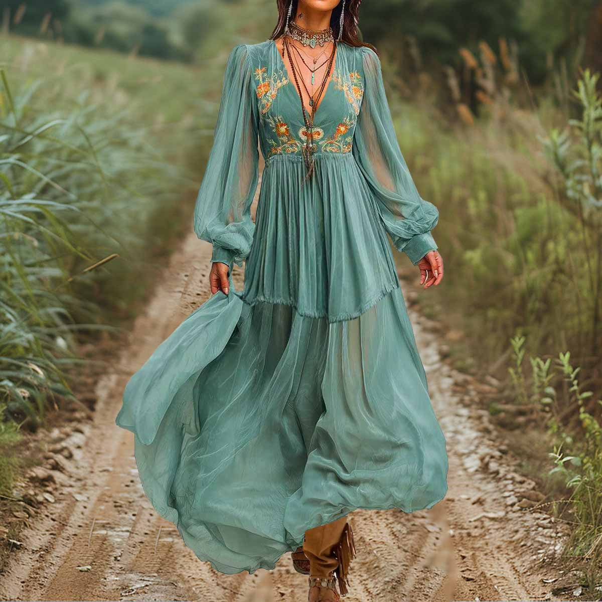 Boho Woman Clothing Floral Print Long Dresses Sexy V Neck High Waist Party Dress 2025 Spring Lantern Sleeve Loose Maxi Dress