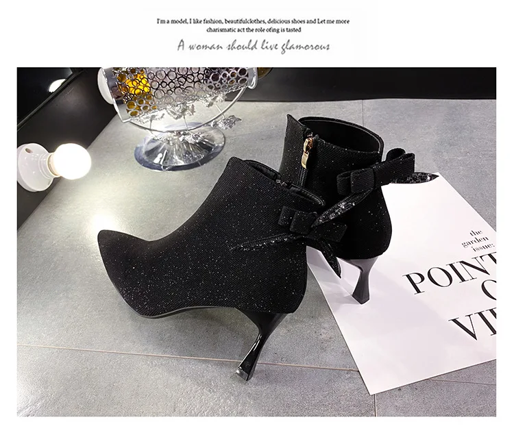 Bow Beige Short Botas Women’s Stiletto Pointed Toe High-heeled 7CM Ankle Boots All-match Elastic Nude Shoes 2023 Spring/Autumn