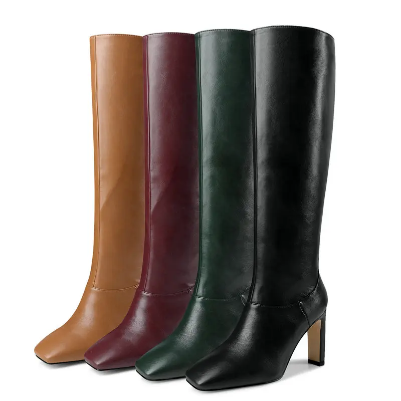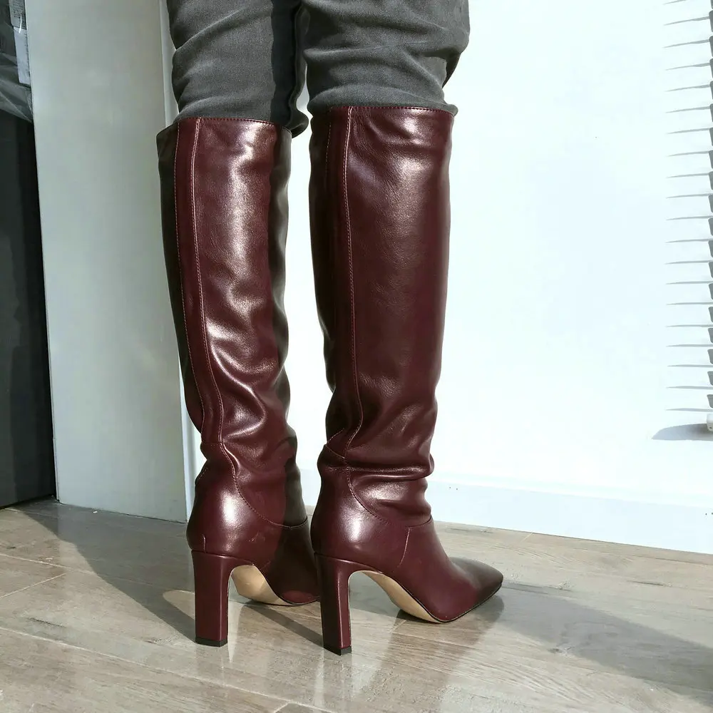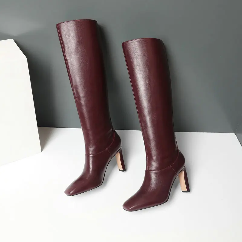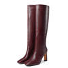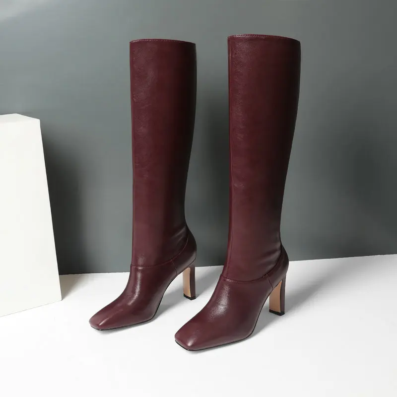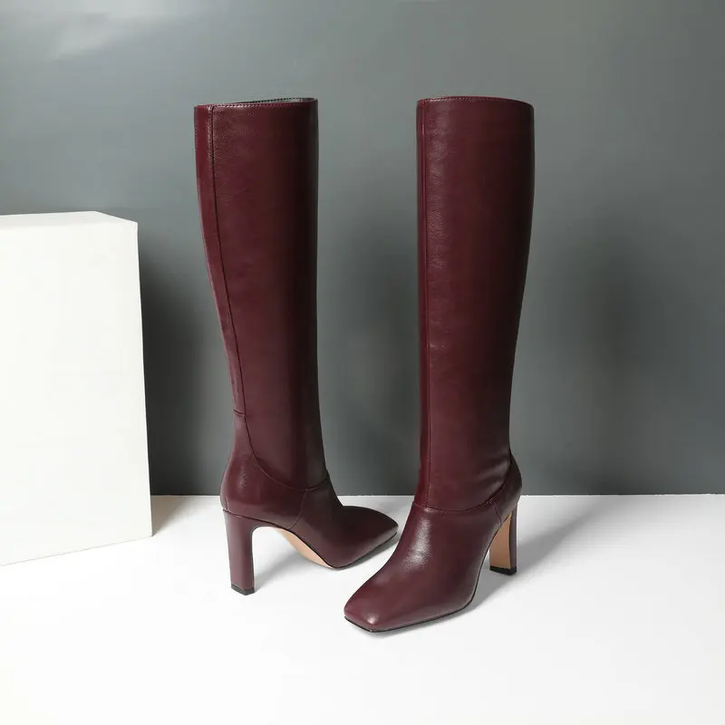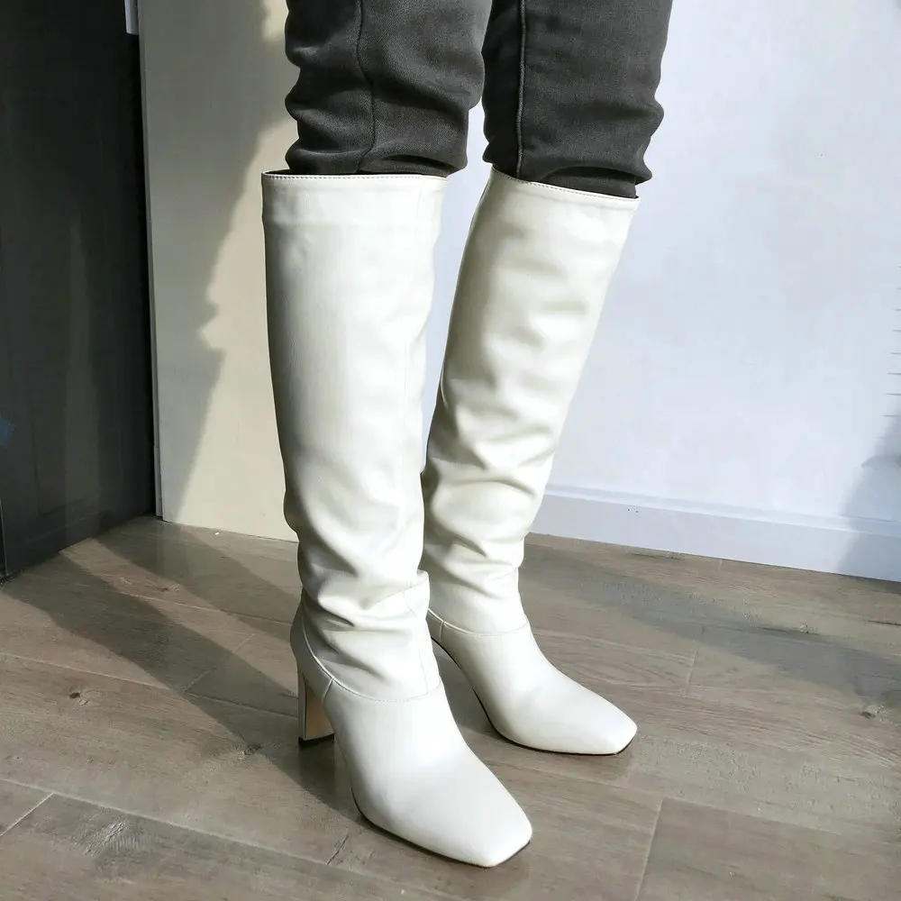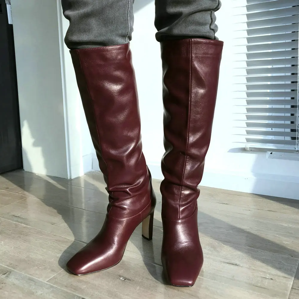 Brown Black Wine Red Lvory Knee High Boots Heels for Women 2021 Ladies Party Shoes Woman Square Toe Tall Boots Plus Size