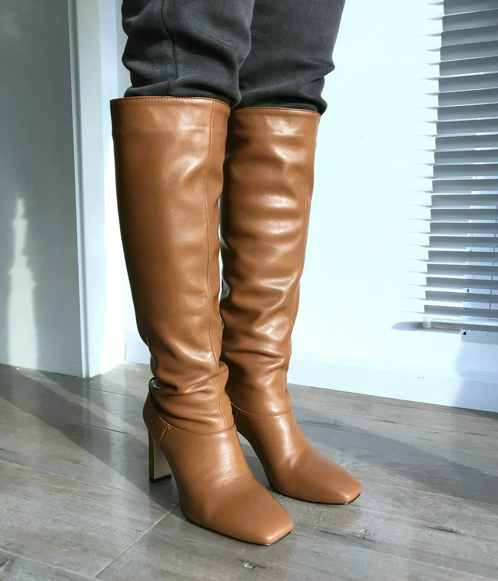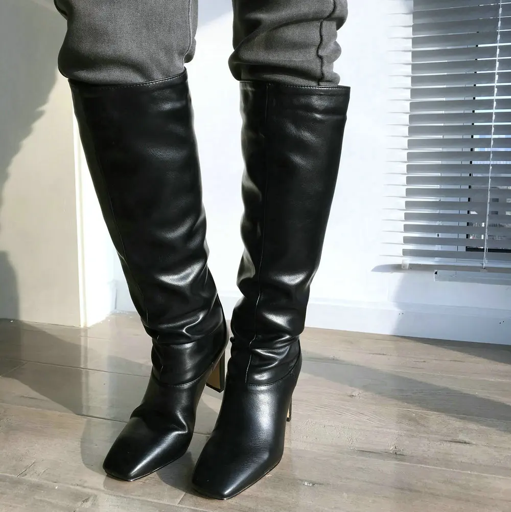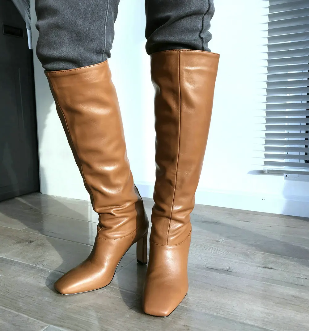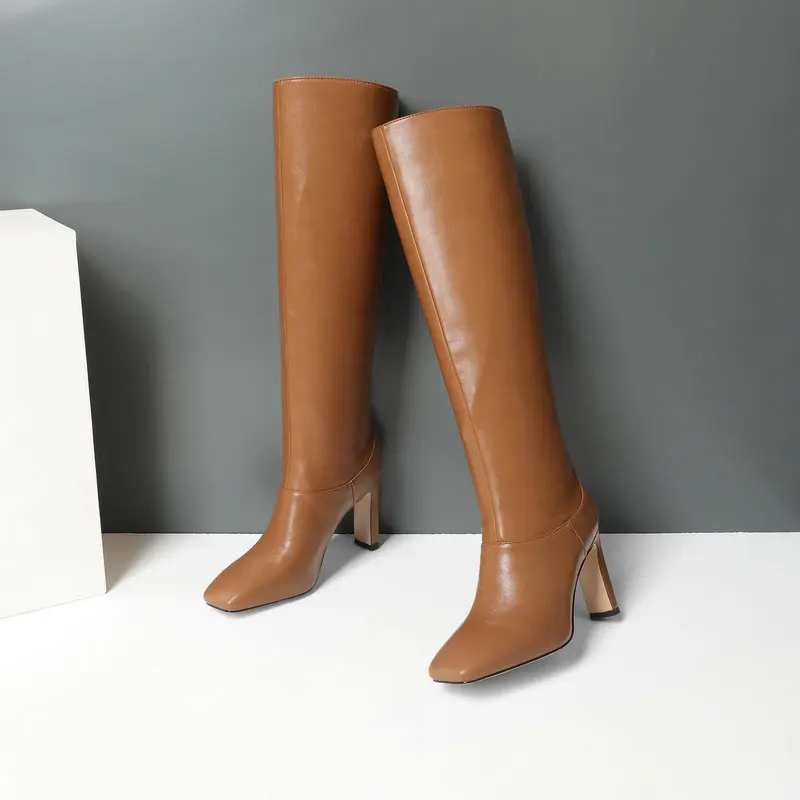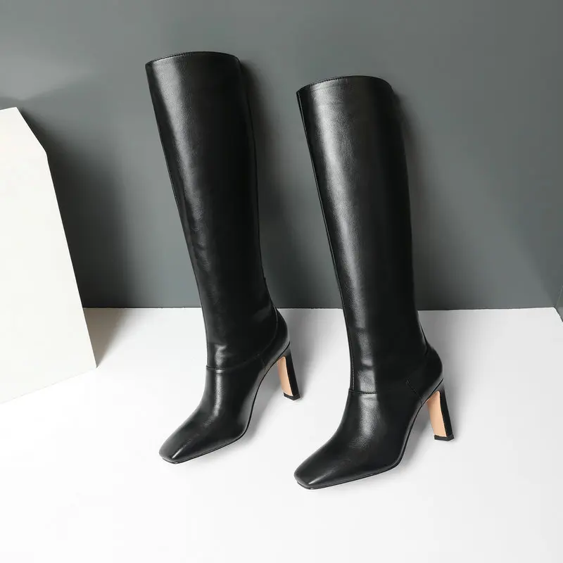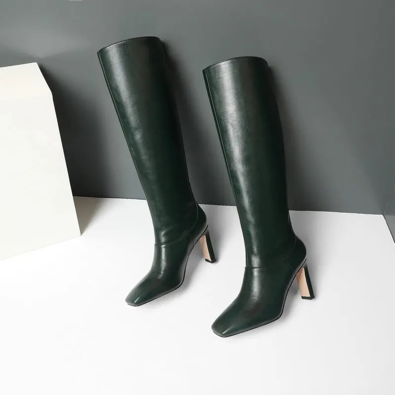 Brown Black Wine Red Lvory Knee High Boots Heels for Women 2021 Ladies Party Shoes Woman Square Toe Tall Boots Plus Size