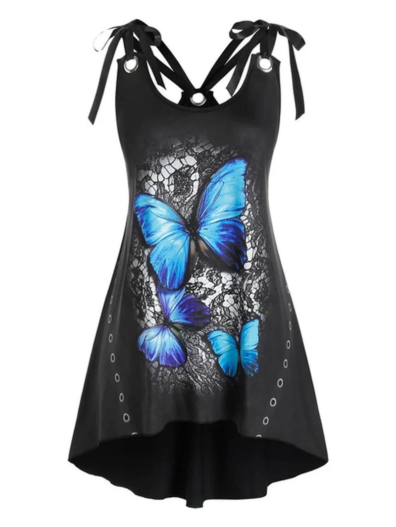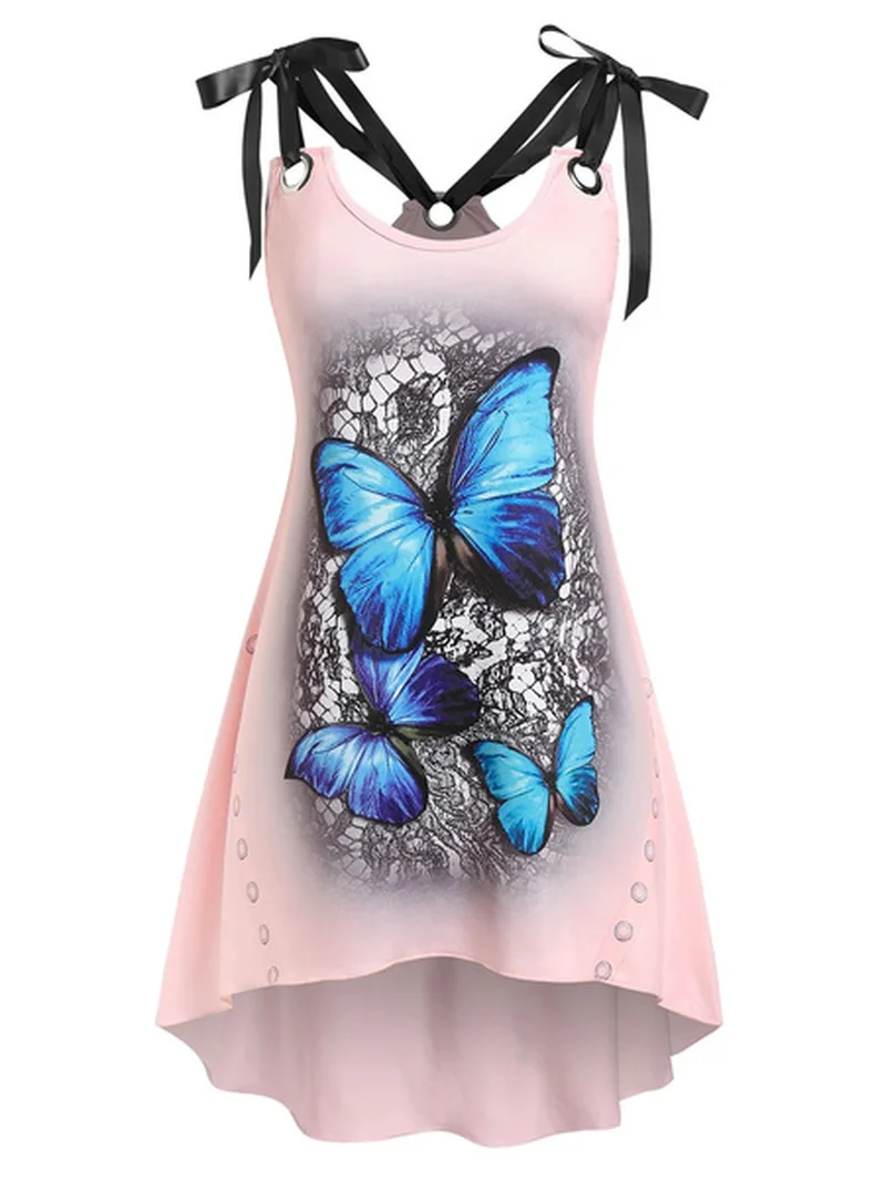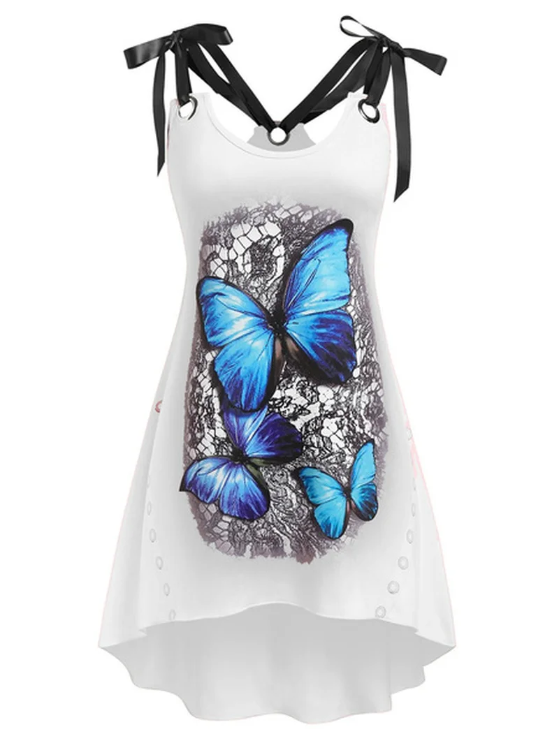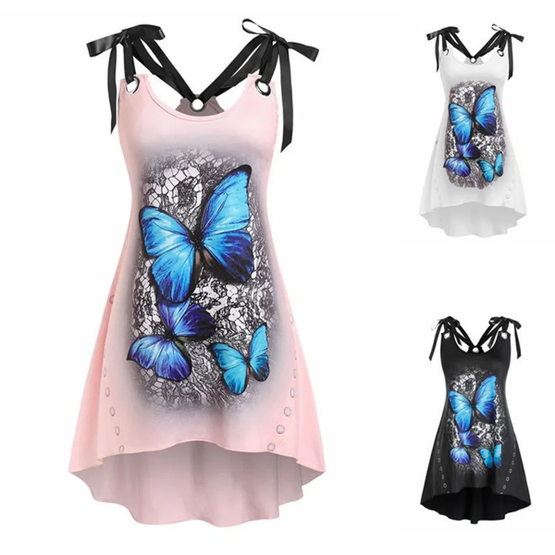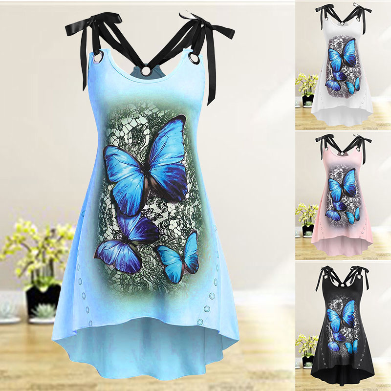 Butterfly Print Tank Top New Summer Irregular Tank Top Women Butterfly Print Tie Casual Shoulder Vests Round Neck Tanks Shirts