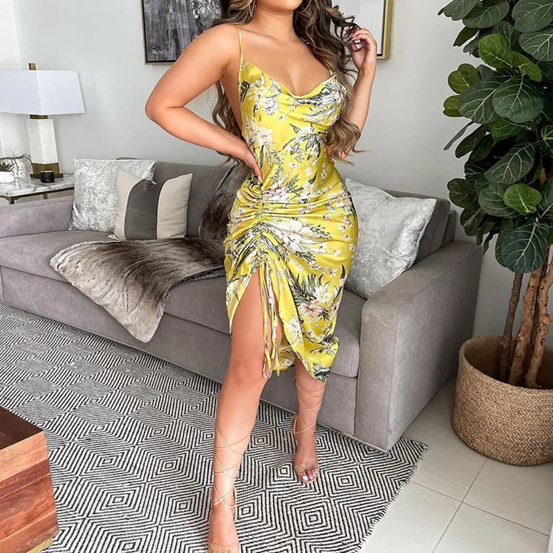 Cami Bandeau Floral Print High Slit Bodycon Dress Women Spaghetti Strap Summer Dress