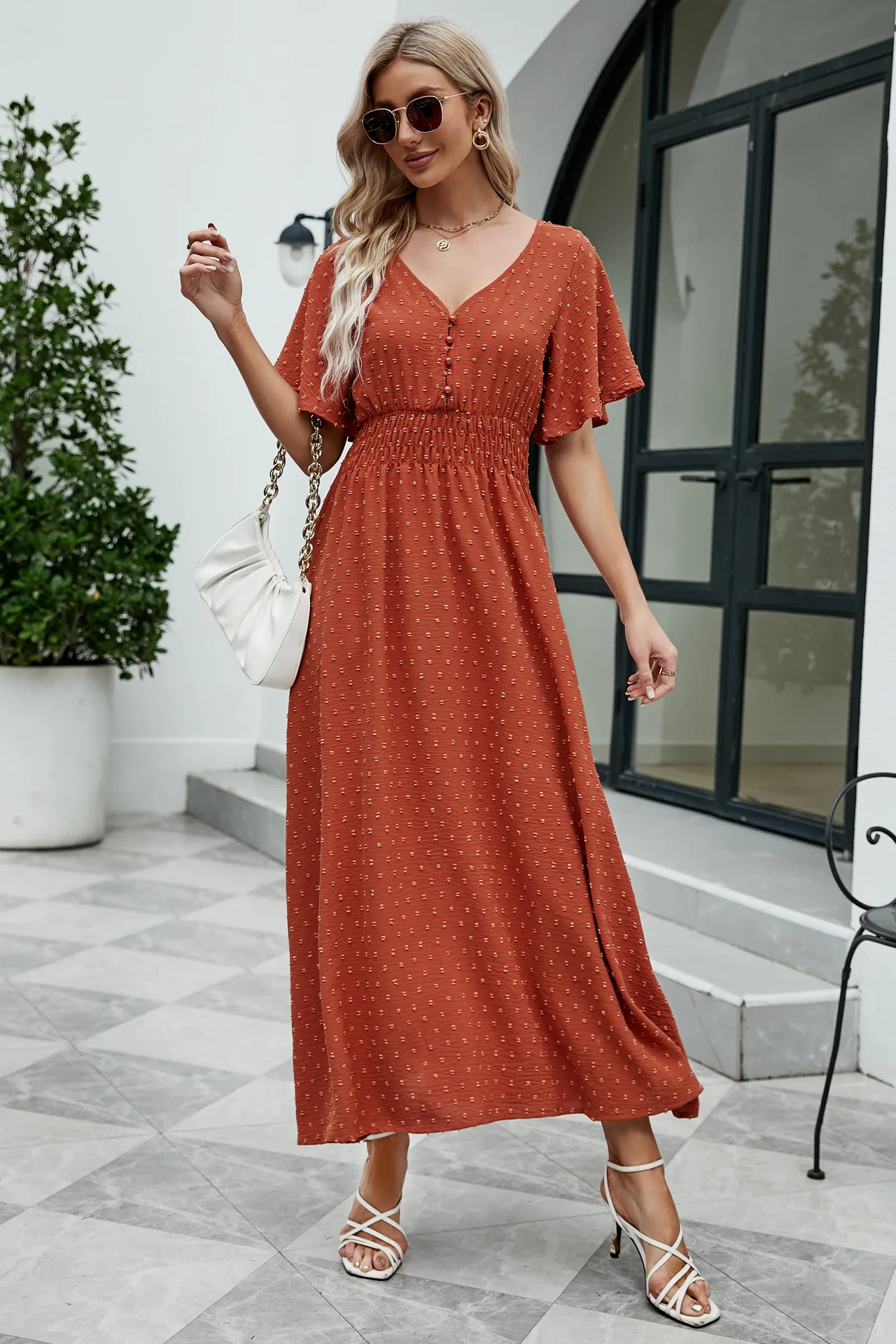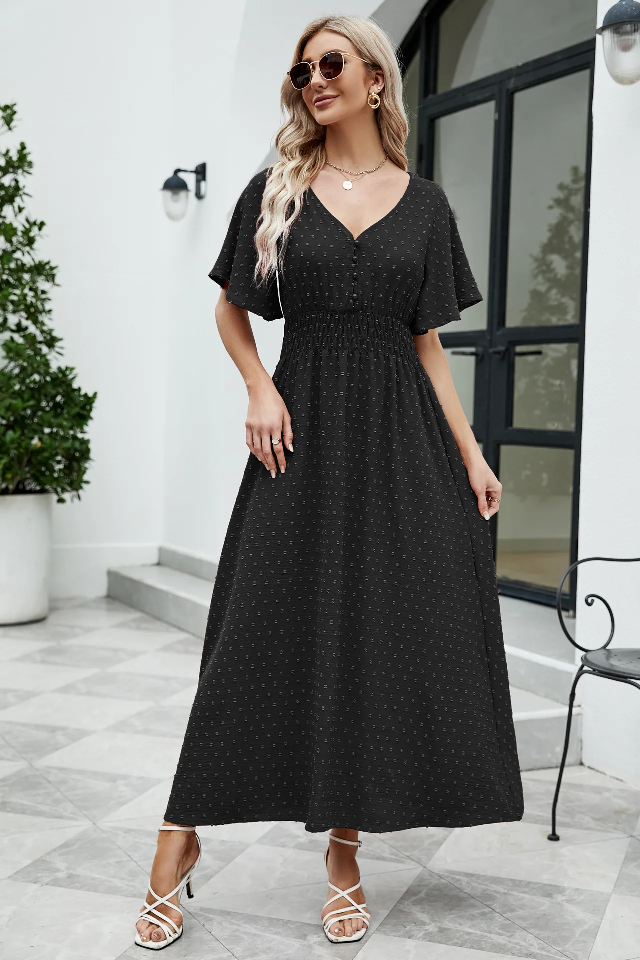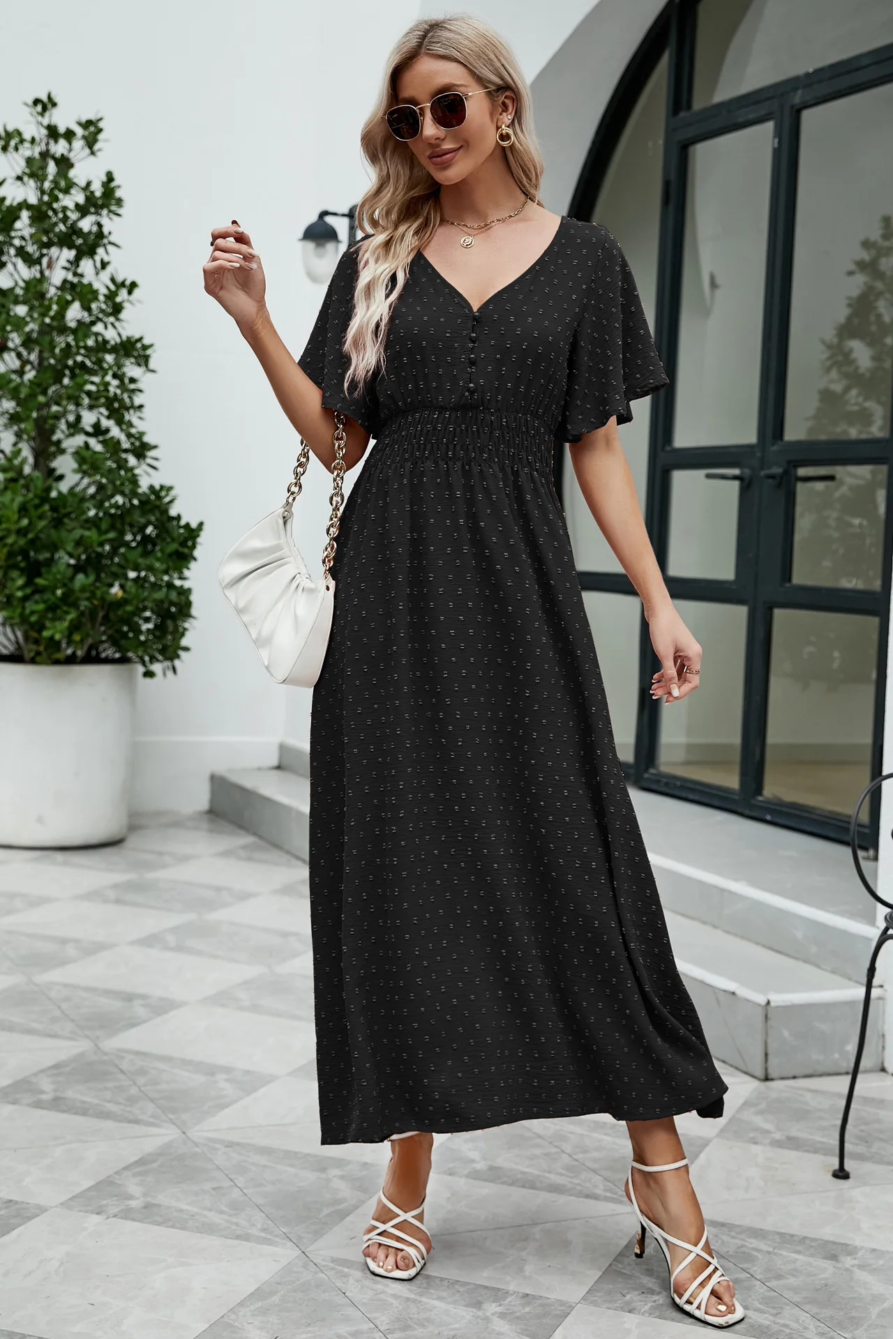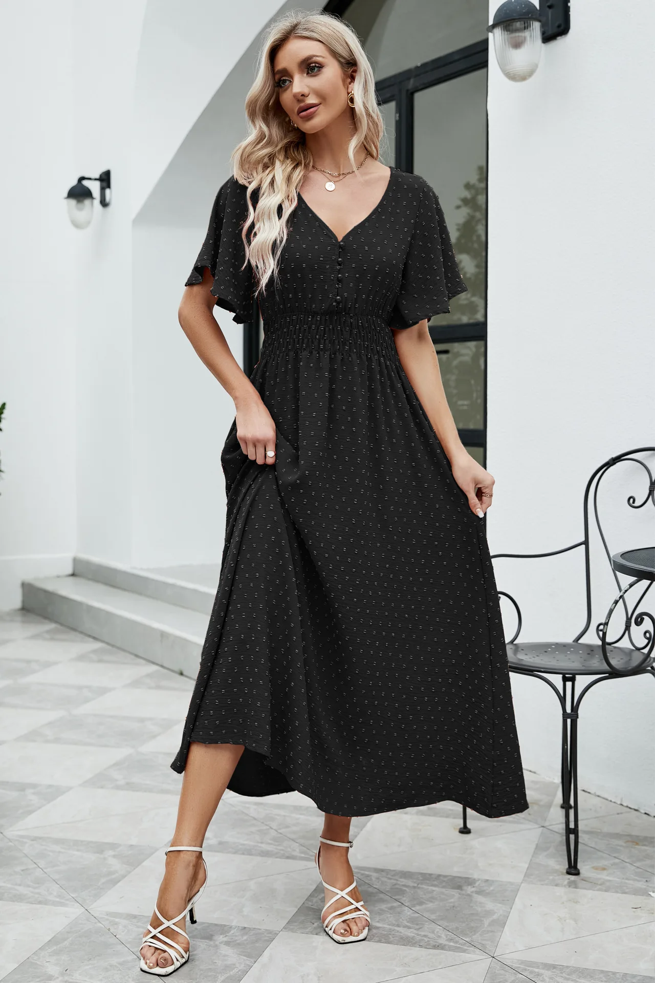 Casual Dot Sweet Elastic Waist Short Sleeve V-Neck Long Dress Women Spring/Autumn New Breasted Design Sexy Holiday Dress
