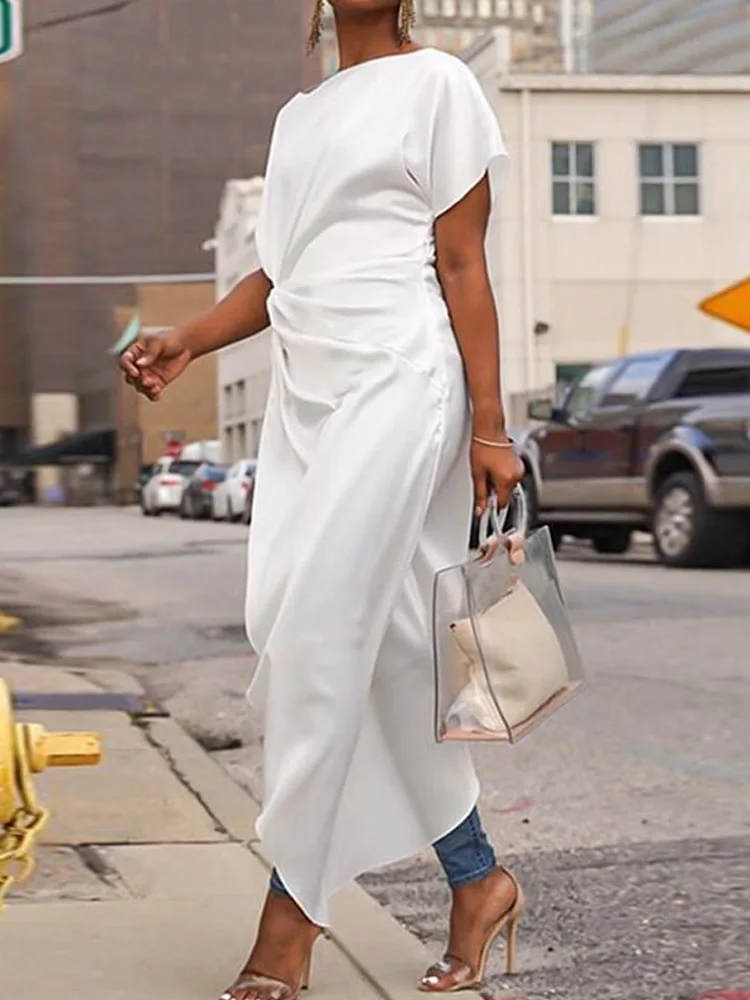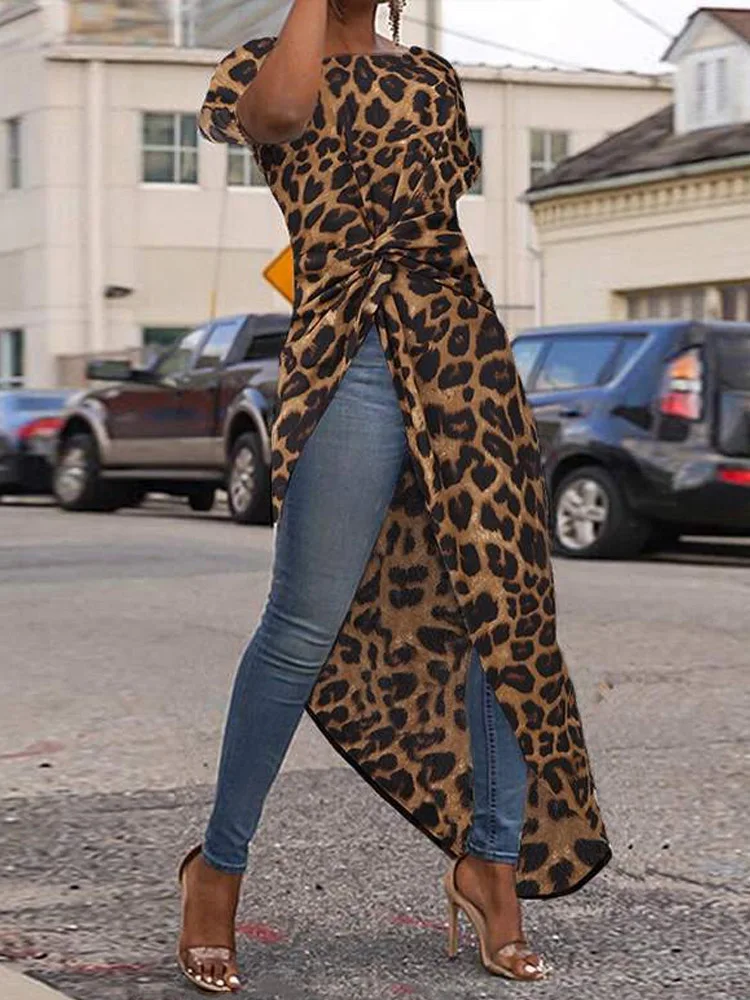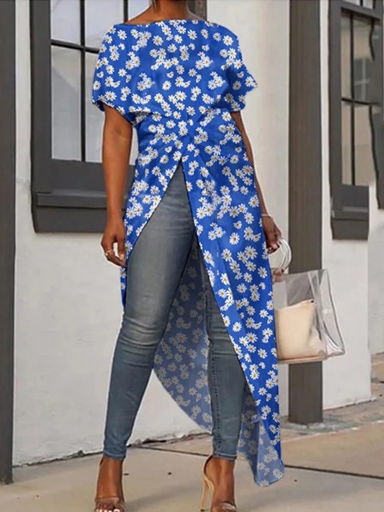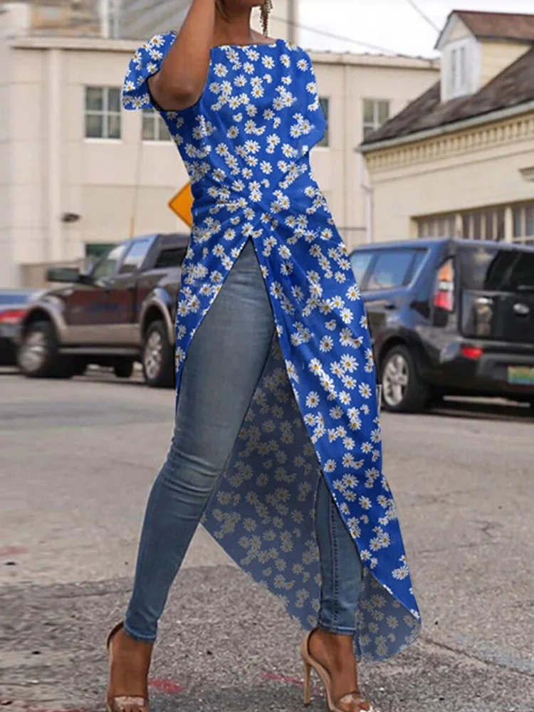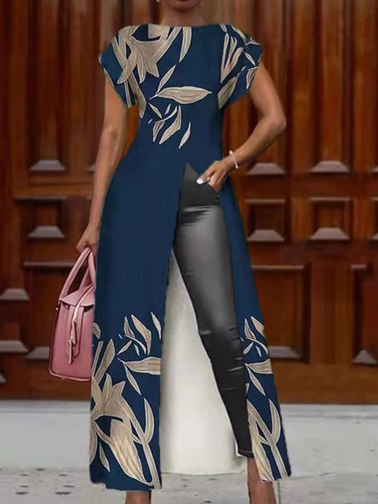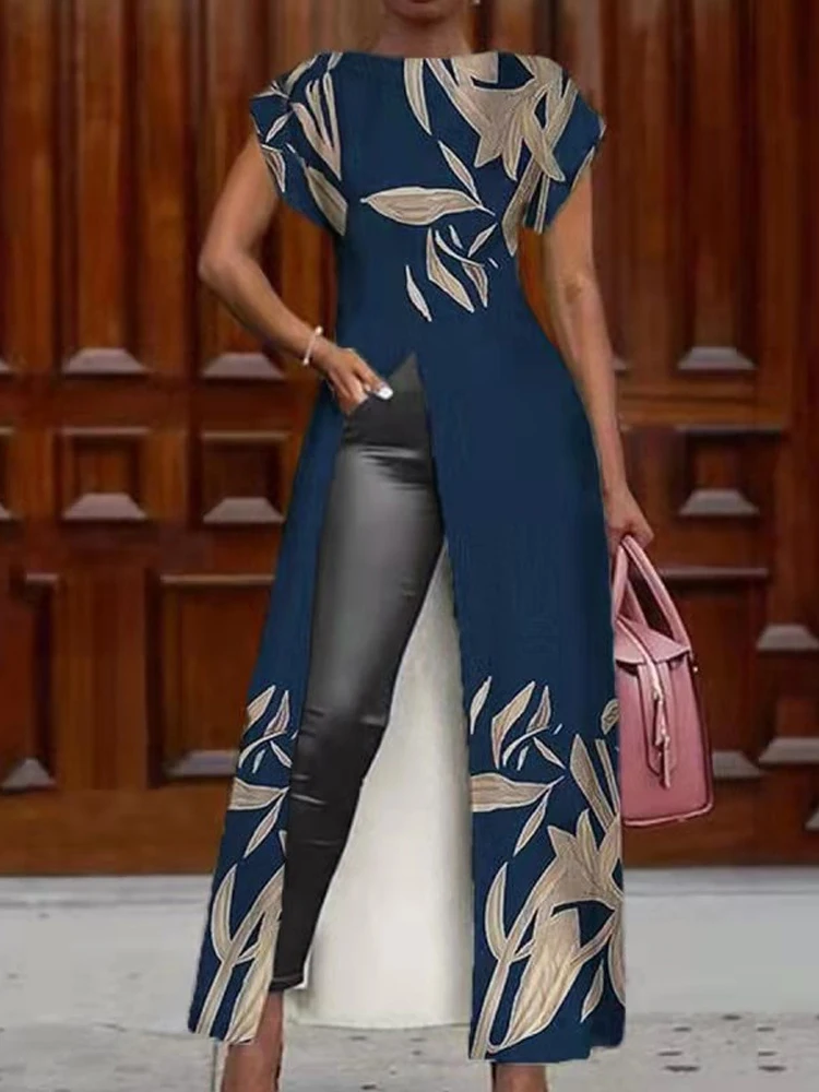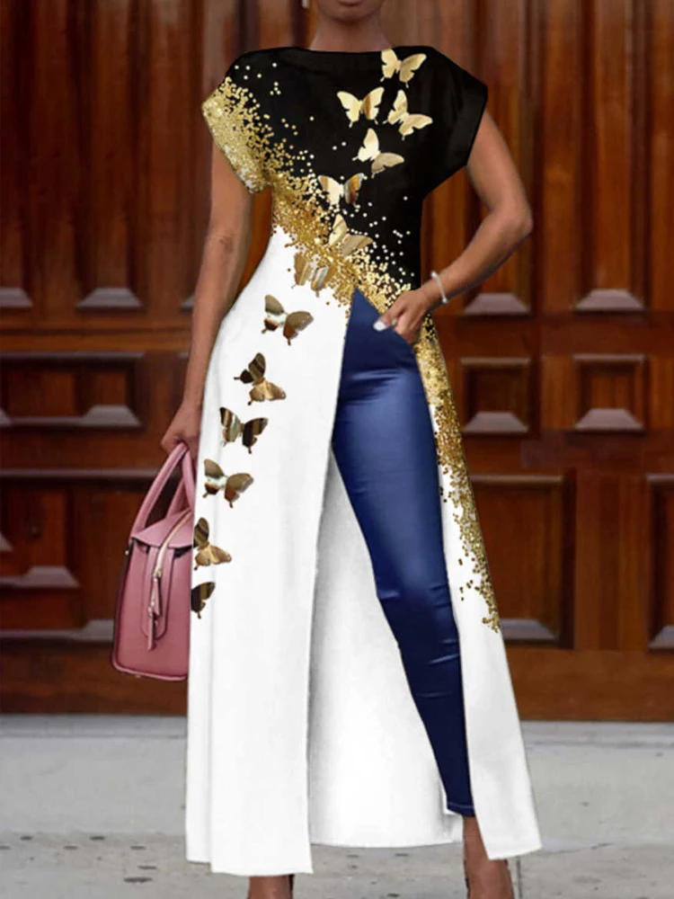 Casual Gold Butterfly Print Long Dress Elegant Women Short Sleeve Loose Pullover Dress Fashion O Neck High Slit Party Dress 2022