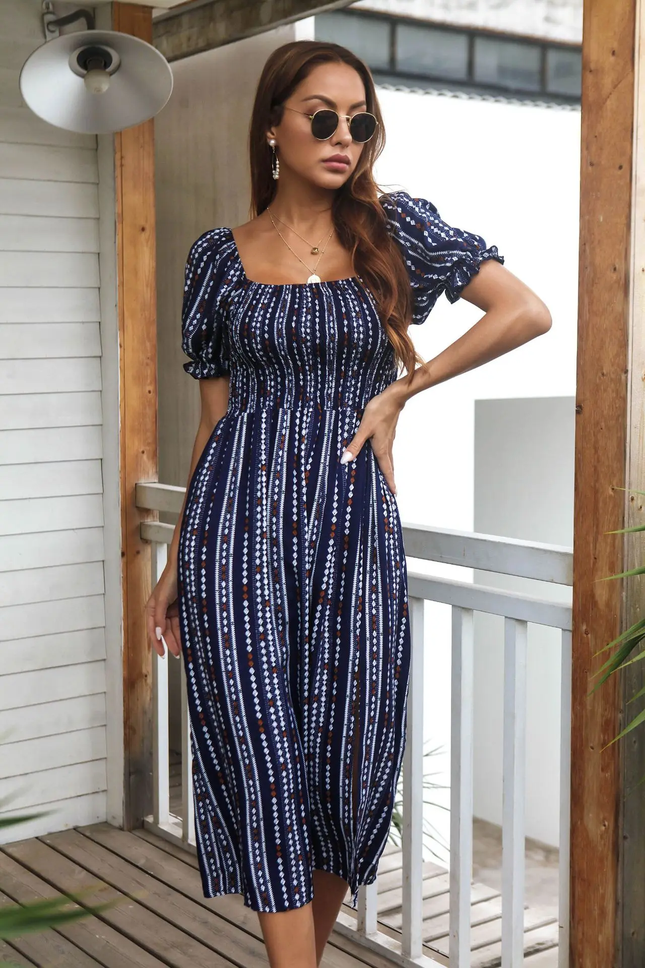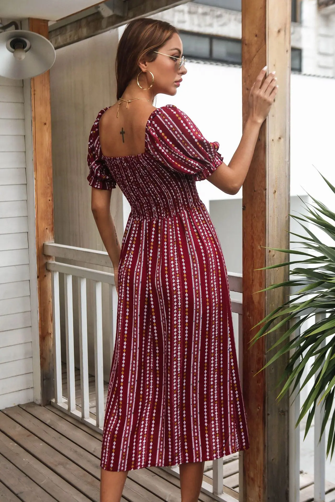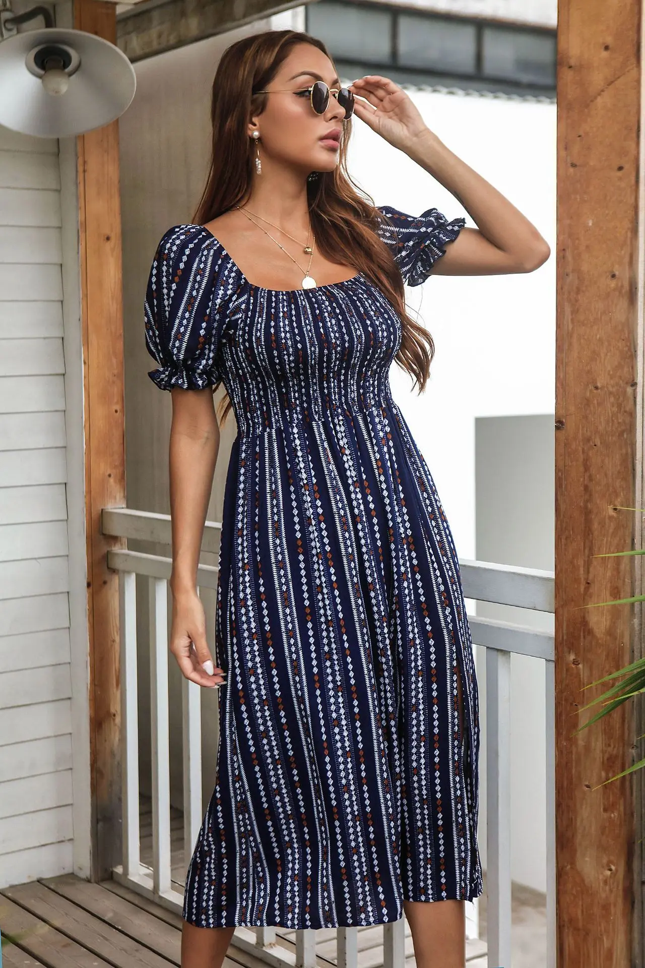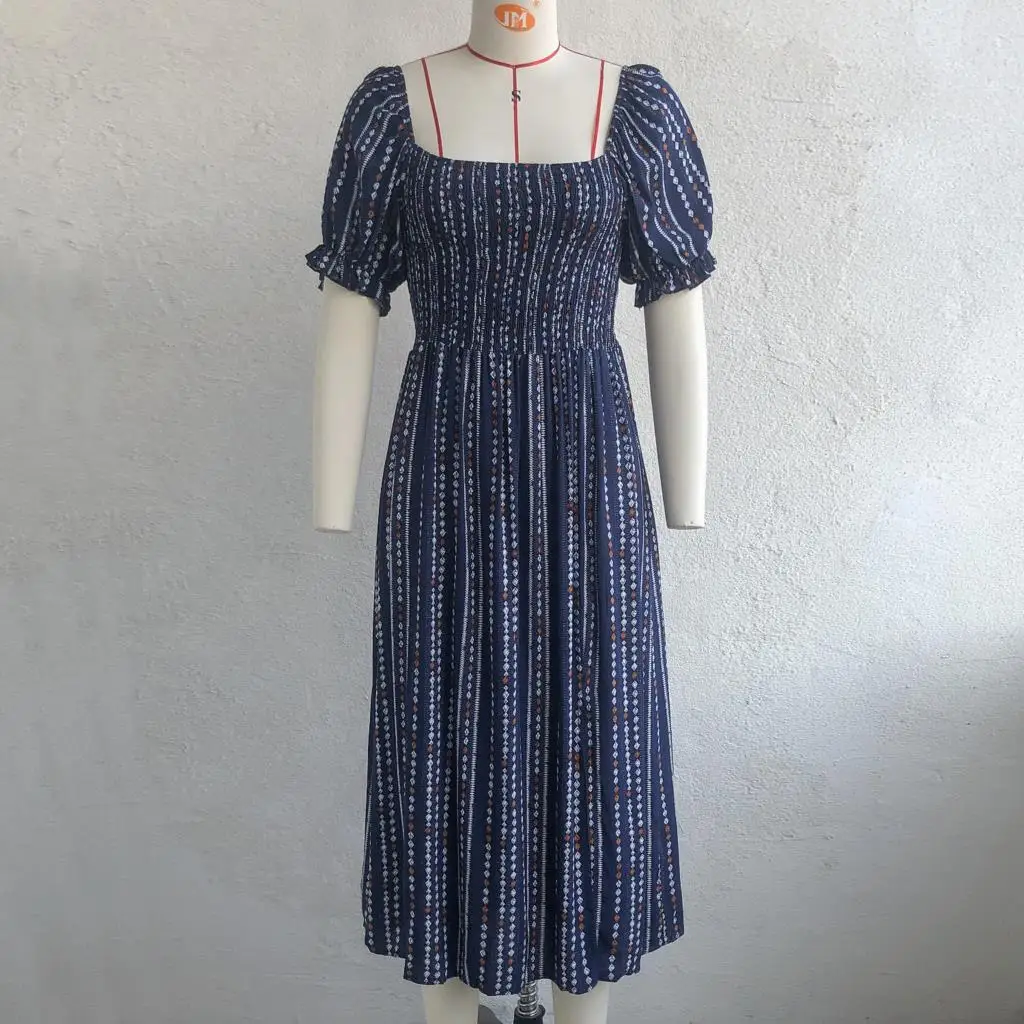 Casual Short Sleeve Midi Dress Women Summer 2022 Fashion Square Collar Cotton Slim Print Dresses Elegant Robe Femme Vintage