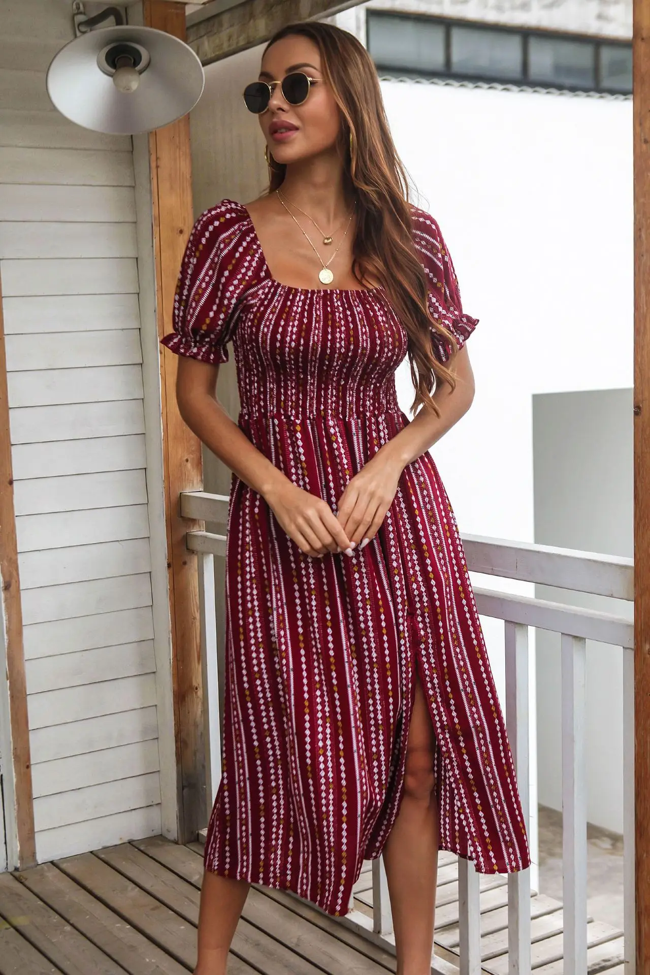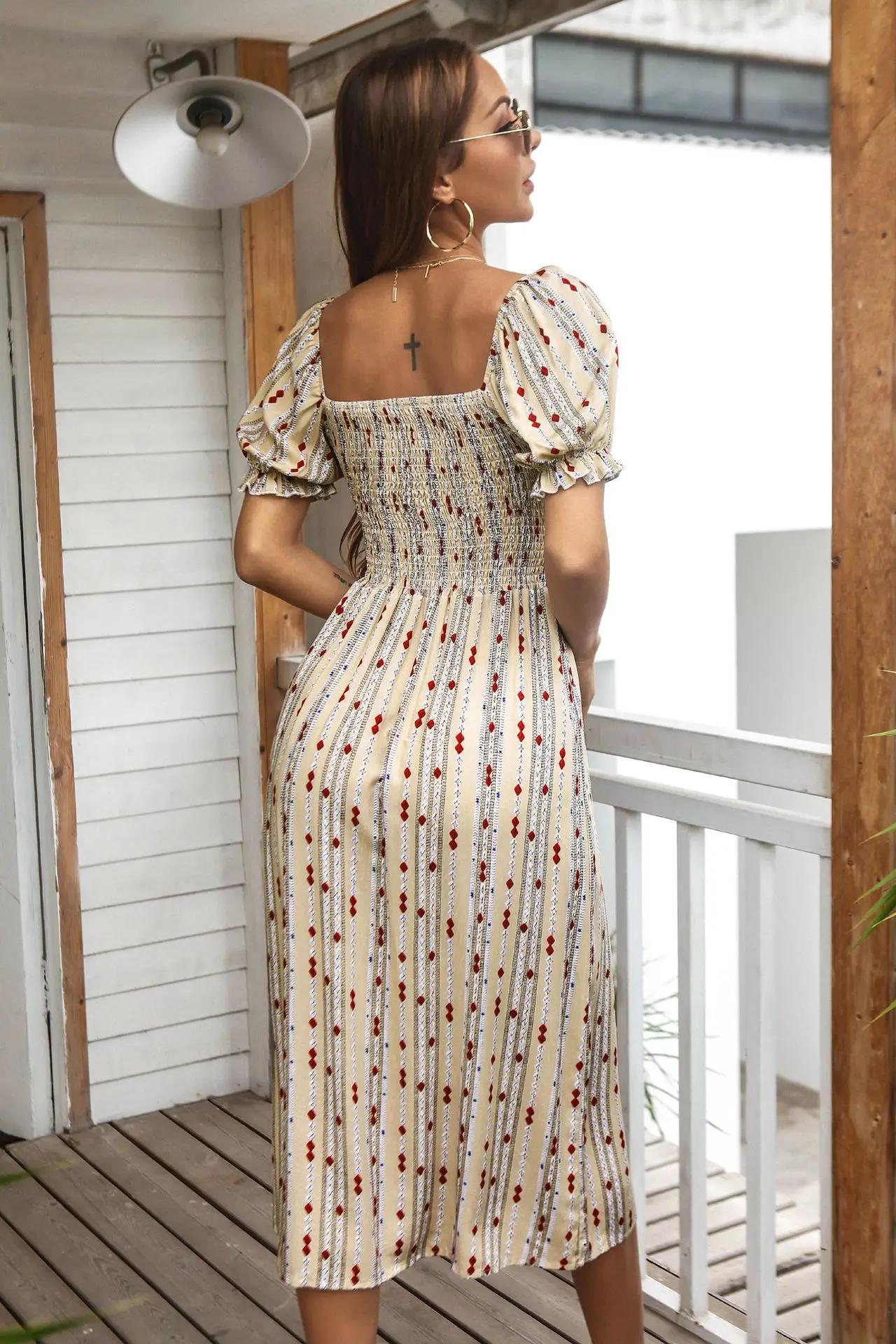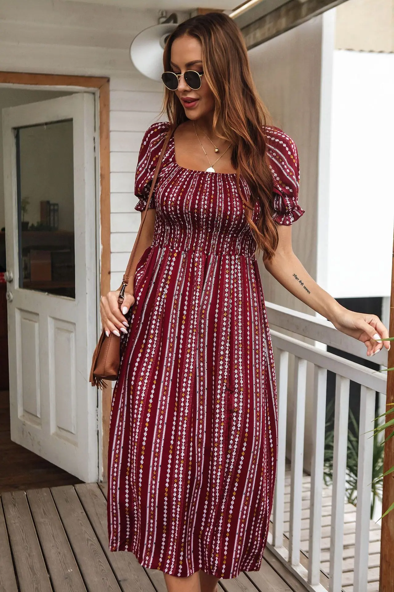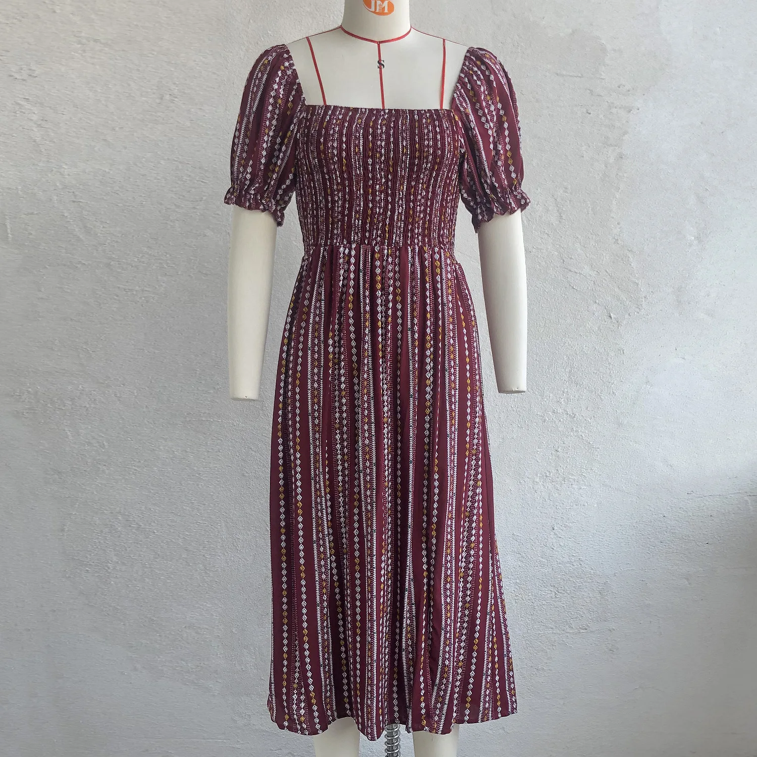 Casual Short Sleeve Midi Dress Women Summer 2022 Fashion Square Collar Cotton Slim Print Dresses Elegant Robe Femme Vintage