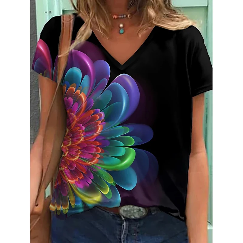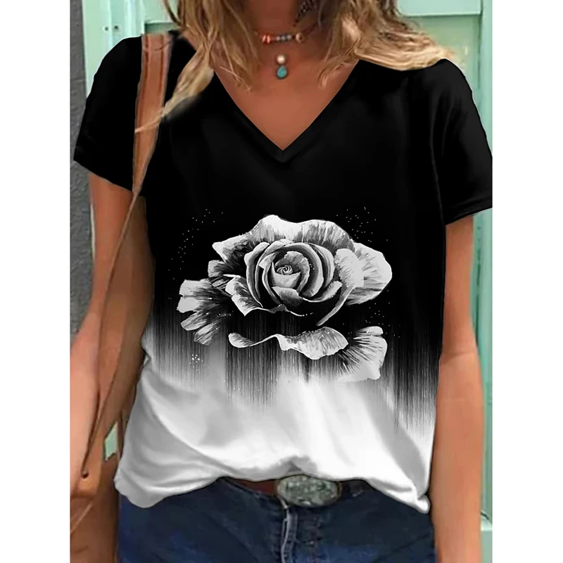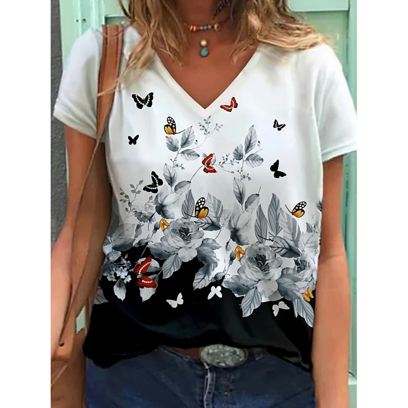 Casual V-Neck Short Sleeve Letter Floral Printed Blouse Shirts Women 2022 Summer Fashion New Loose Streetwears Female Blusa 5XL