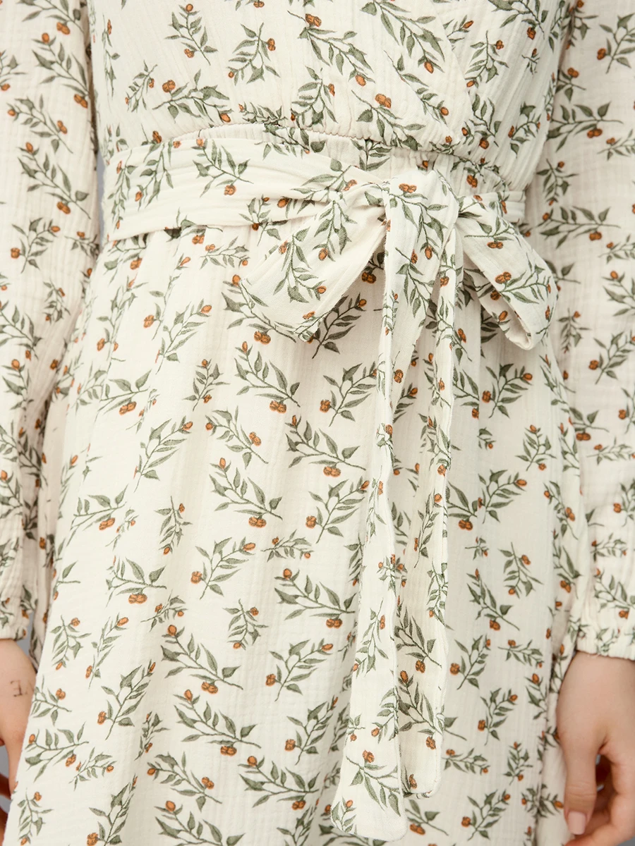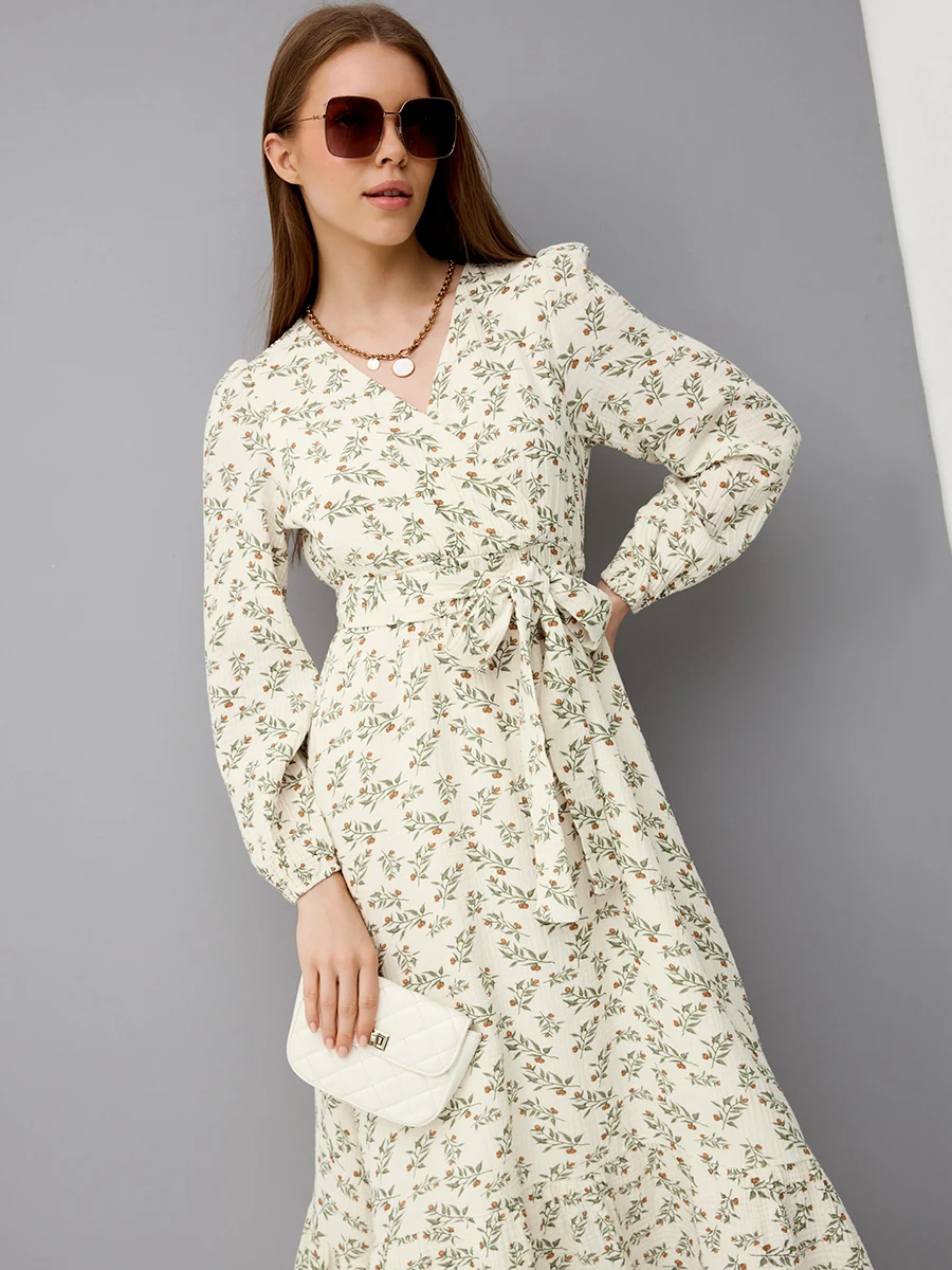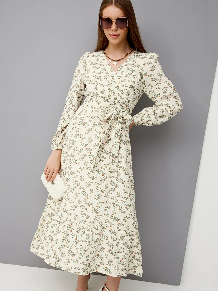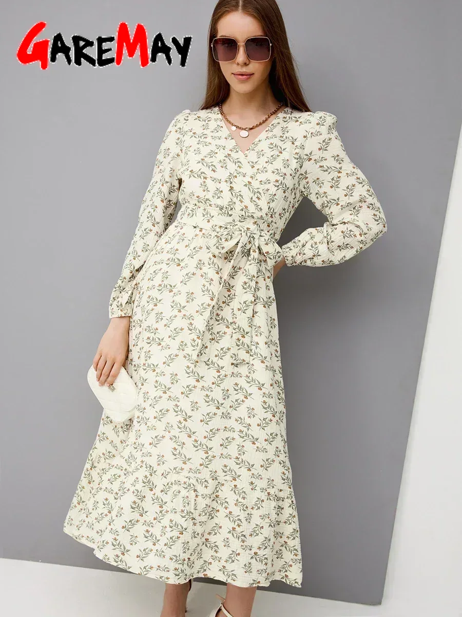 Casual Women’s Cotton Dress 100% Floral Print A-line Vintage Muslim Midi Dress Flower V Neck White Elegant Dresses for Women