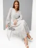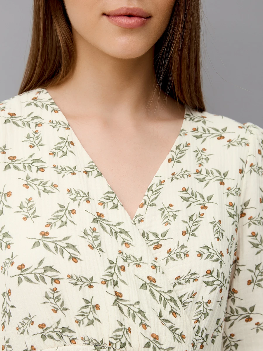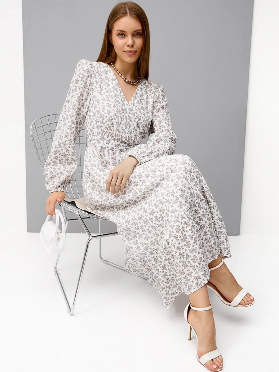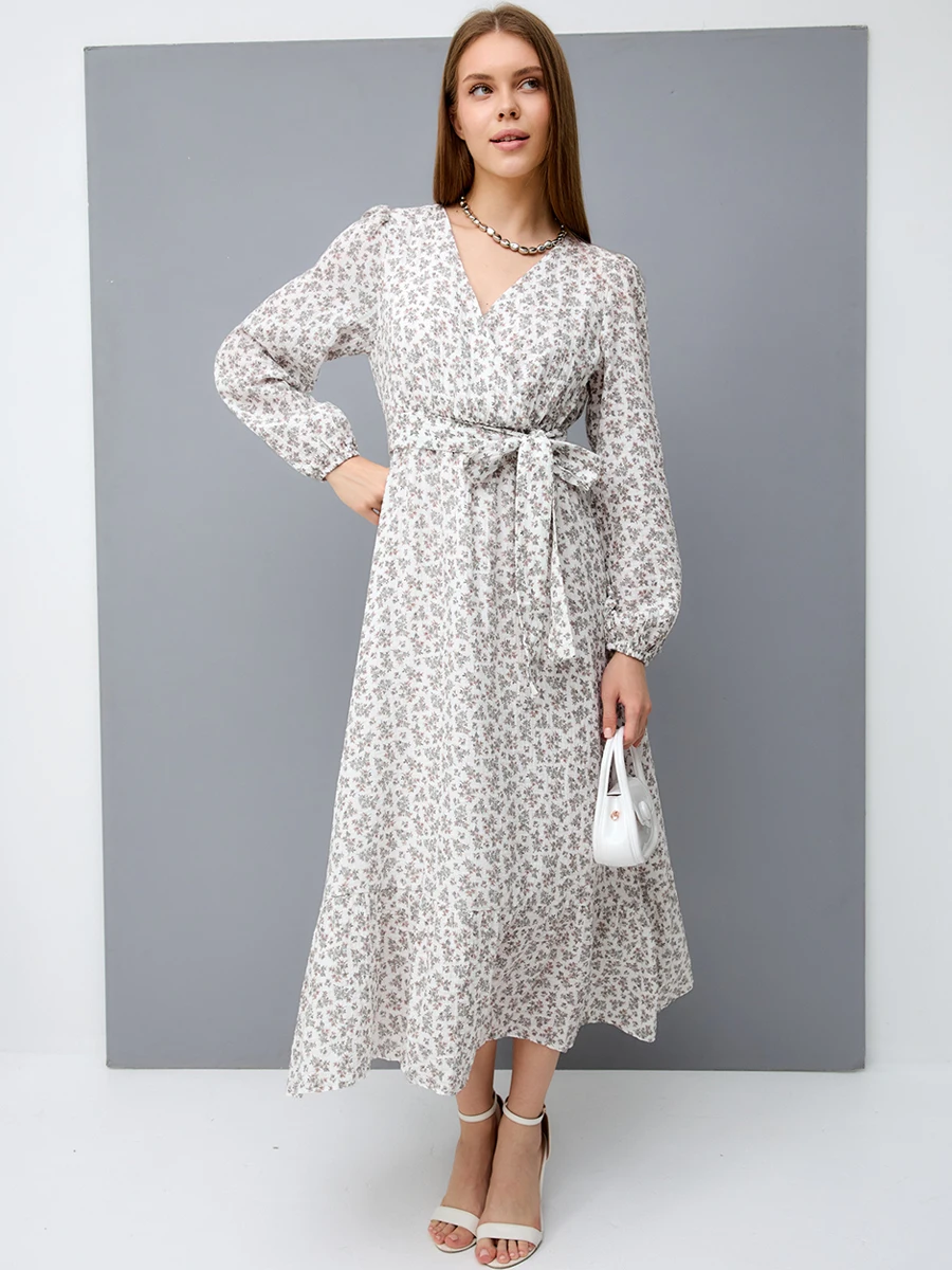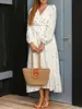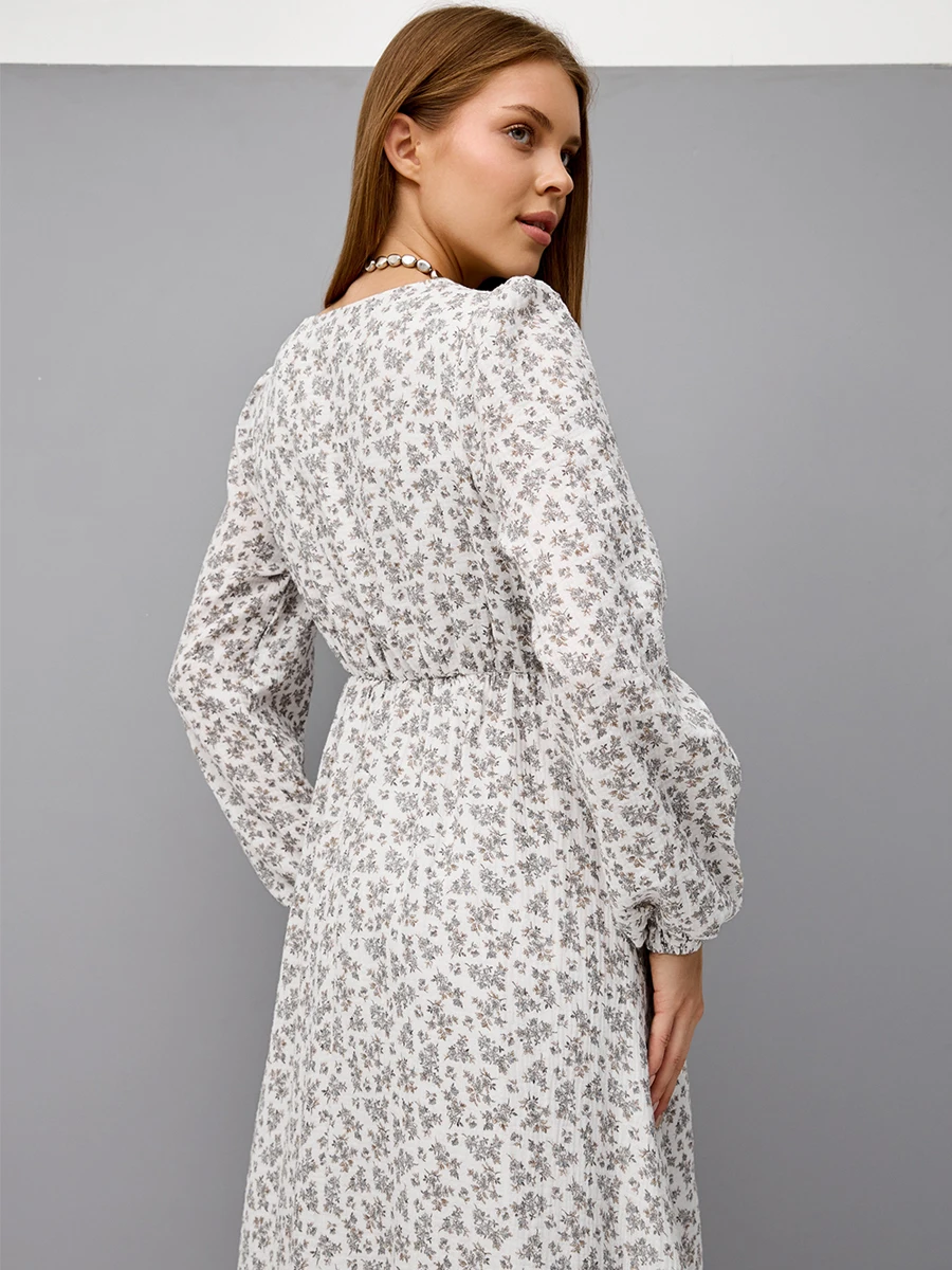 Casual Women’s Cotton Dress 100% Floral Print A-line Vintage Muslim Midi Dress Flower V Neck White Elegant Dresses for Women