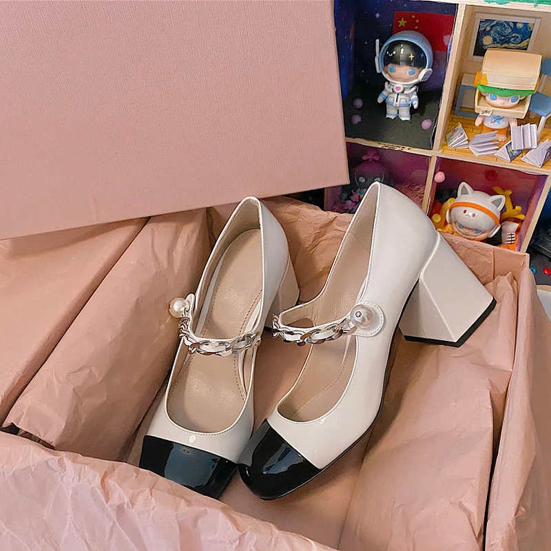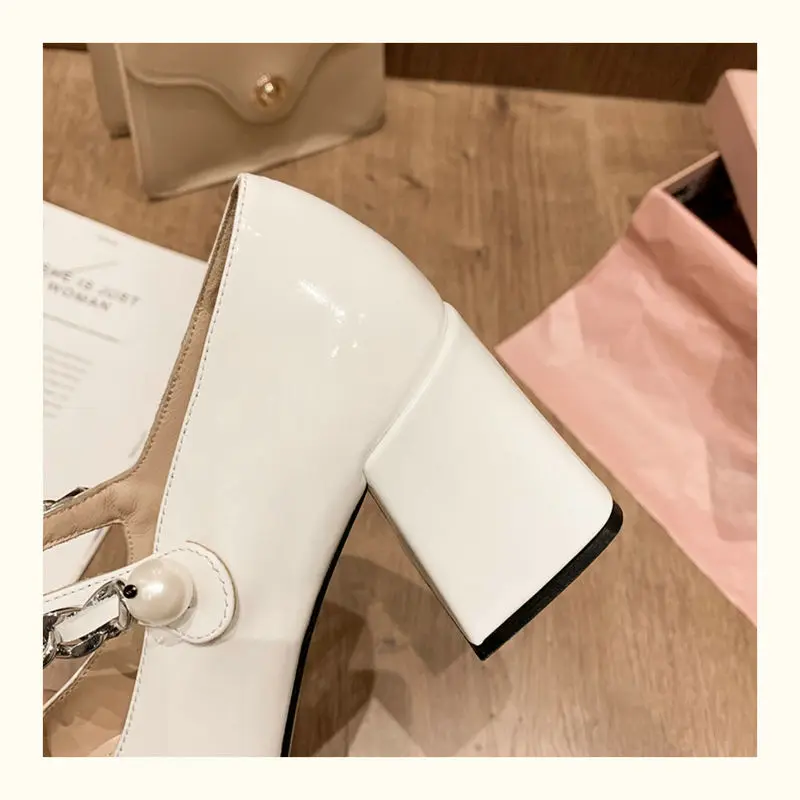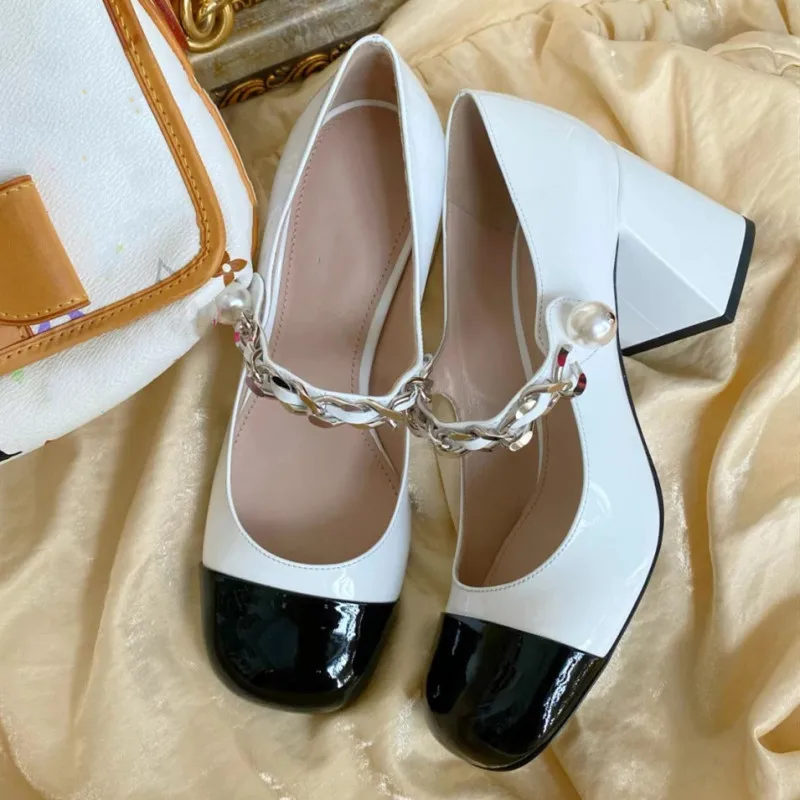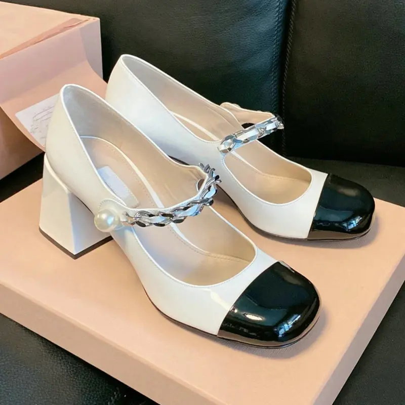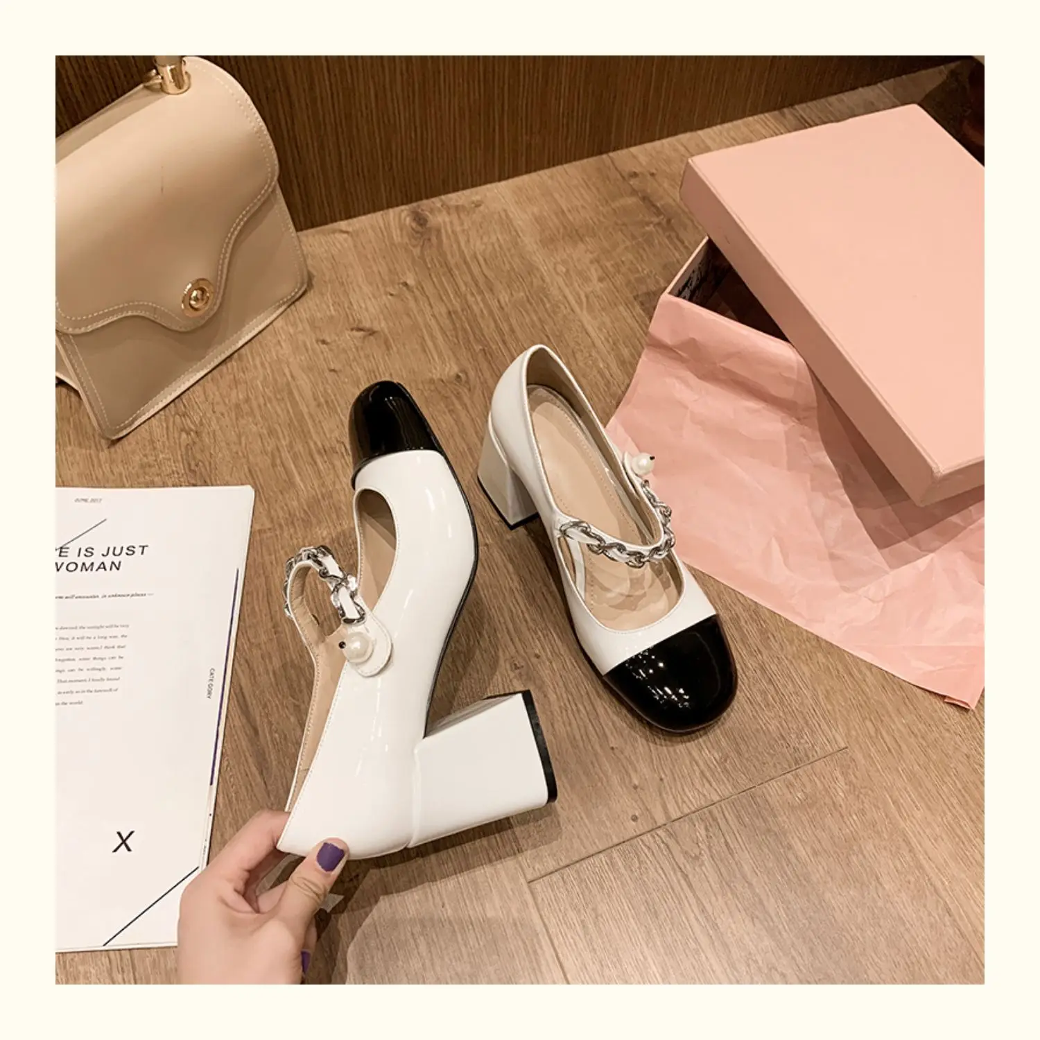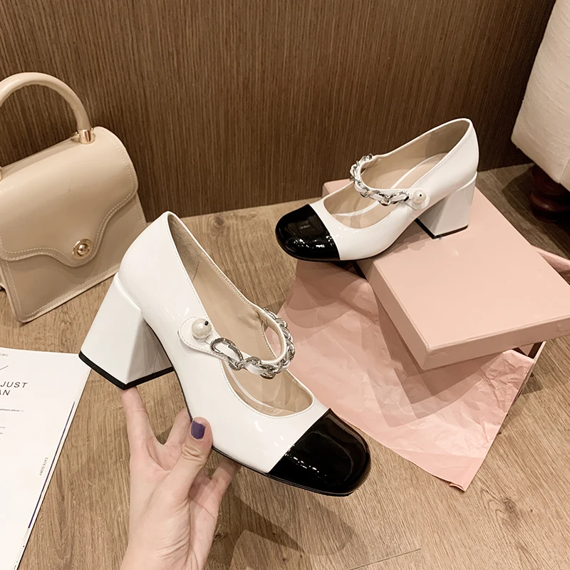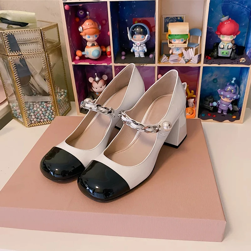 Chain Pearl White Heels Patent Leather Vintage Mary Shoes Low-heel Big Head Buckle Ballet Shoes Mixed Color Crude Heel Women's