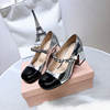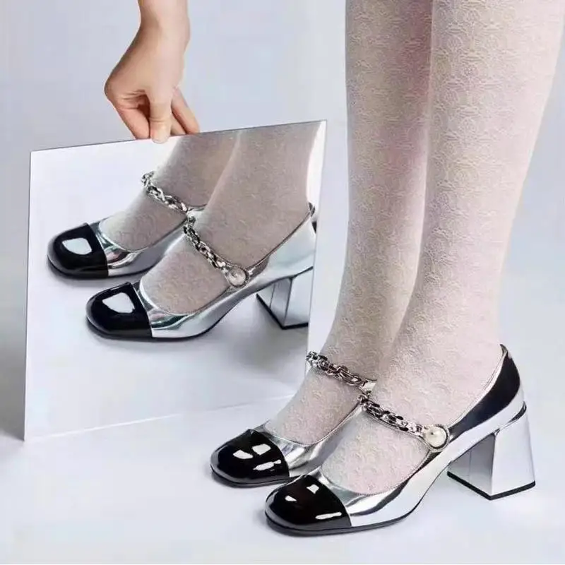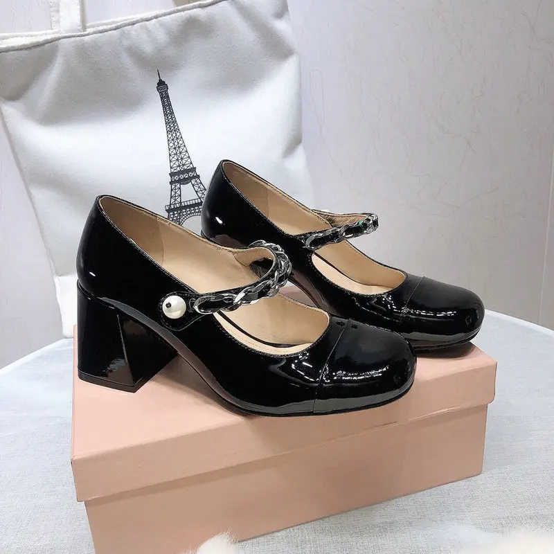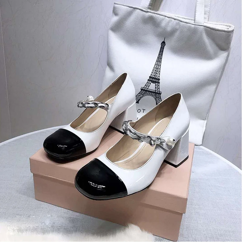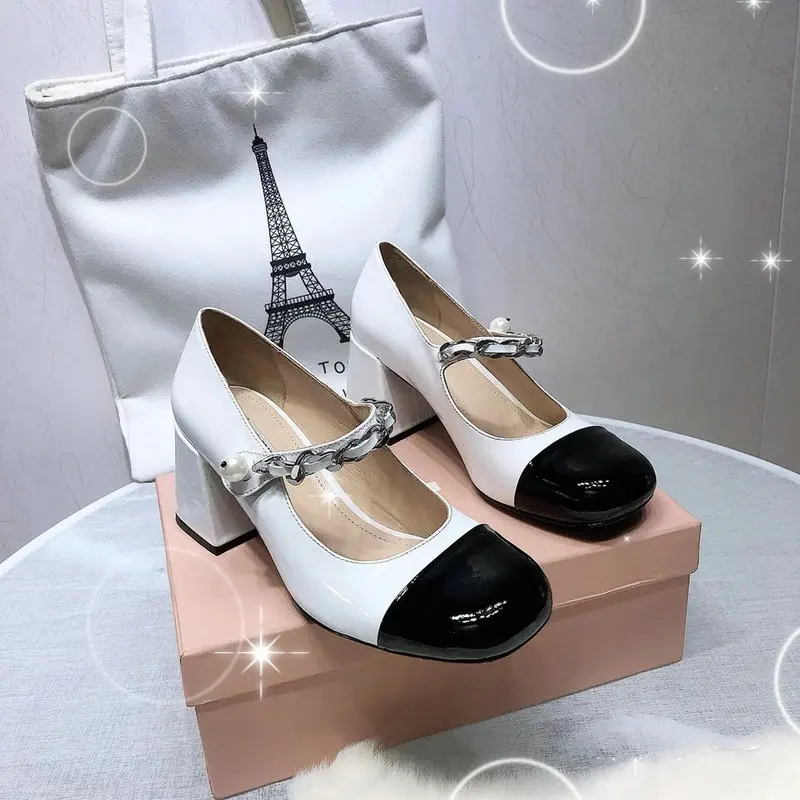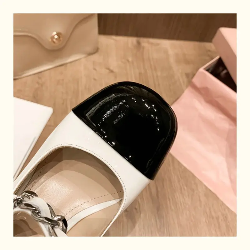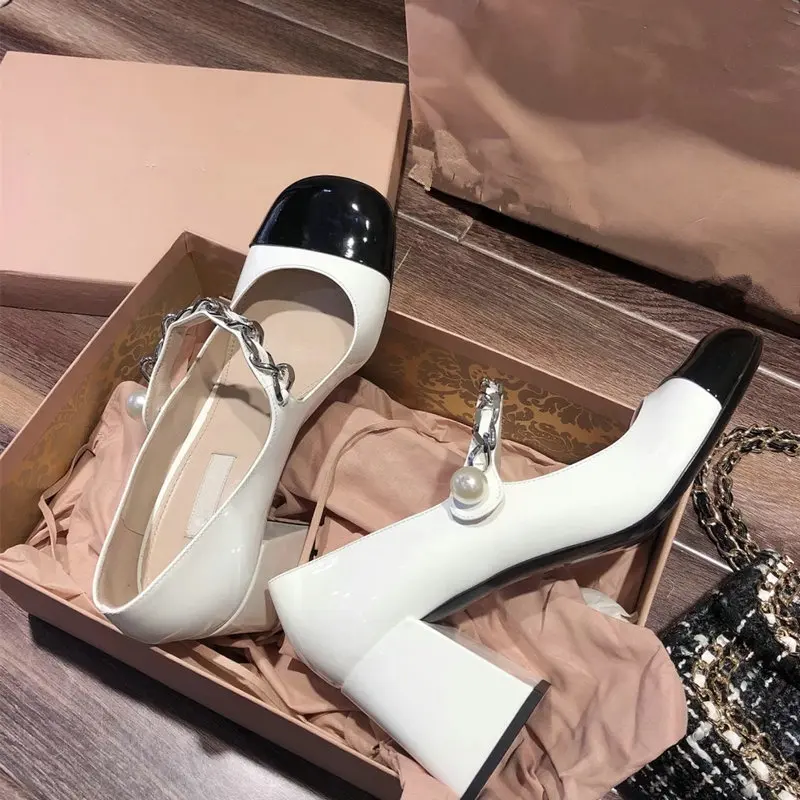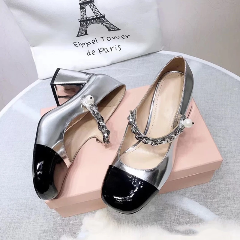 Chain Pearl White Heels Patent Leather Vintage Mary Shoes Low-heel Big Head Buckle Ballet Shoes Mixed Color Crude Heel Women's