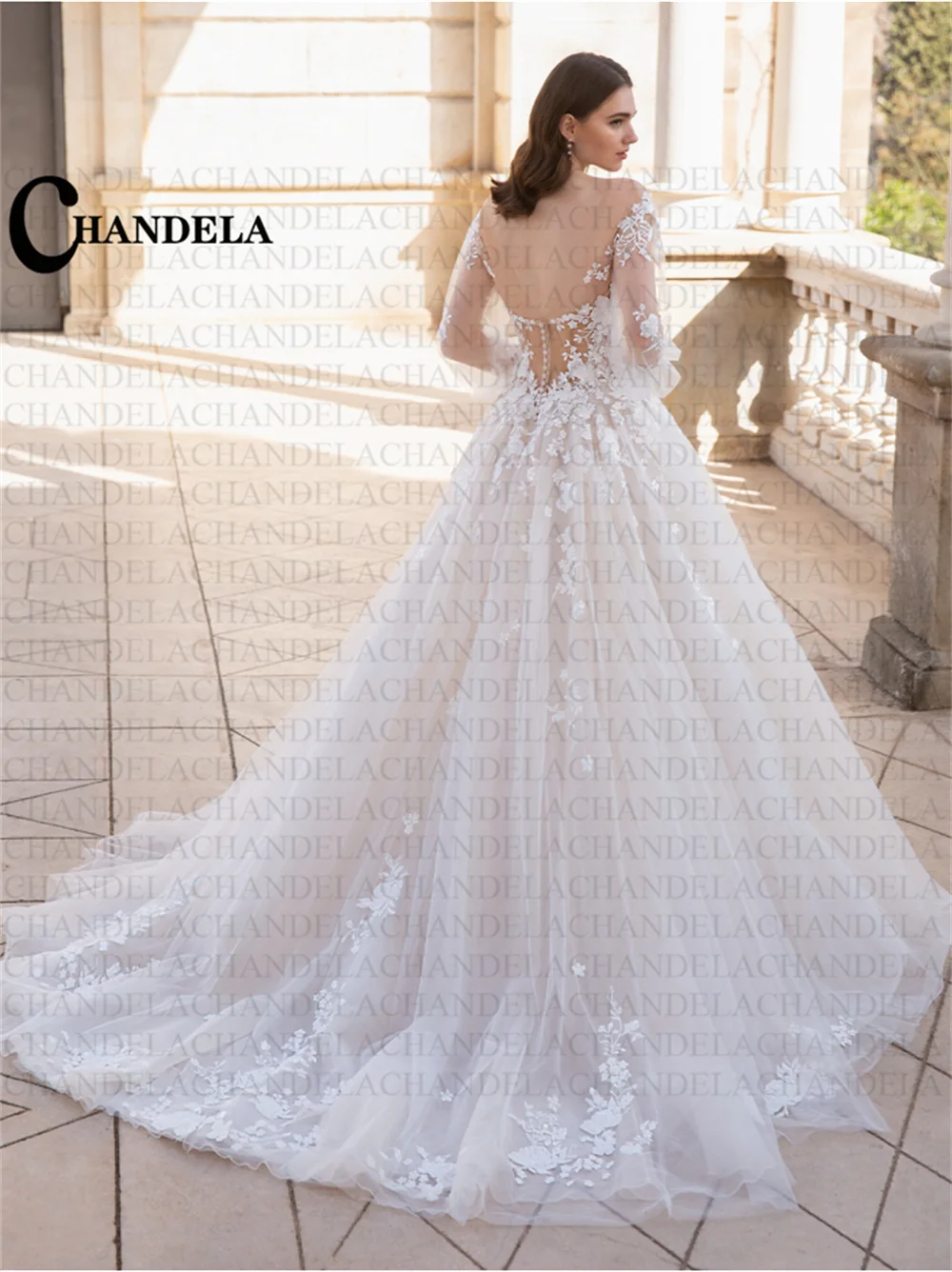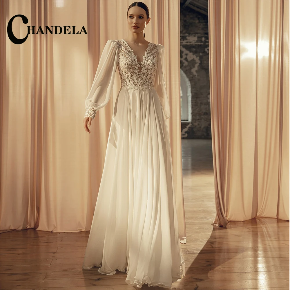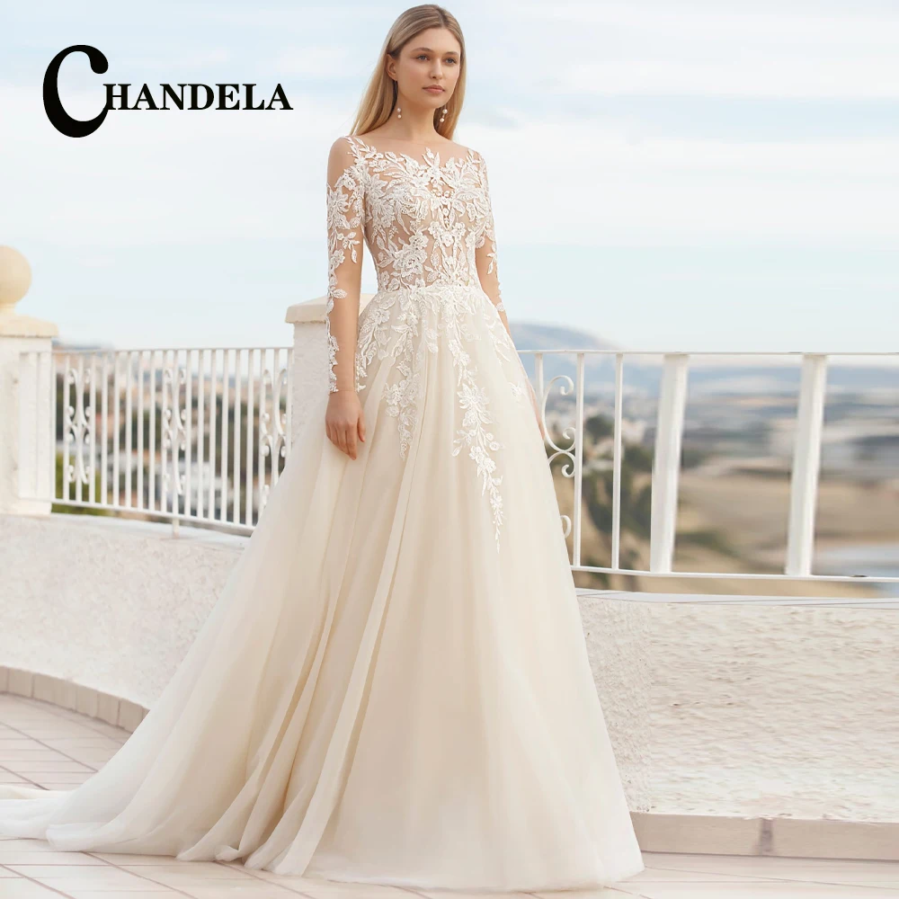 CHANDELA Graceful Wedding Dresses O-Neck Long Slee…