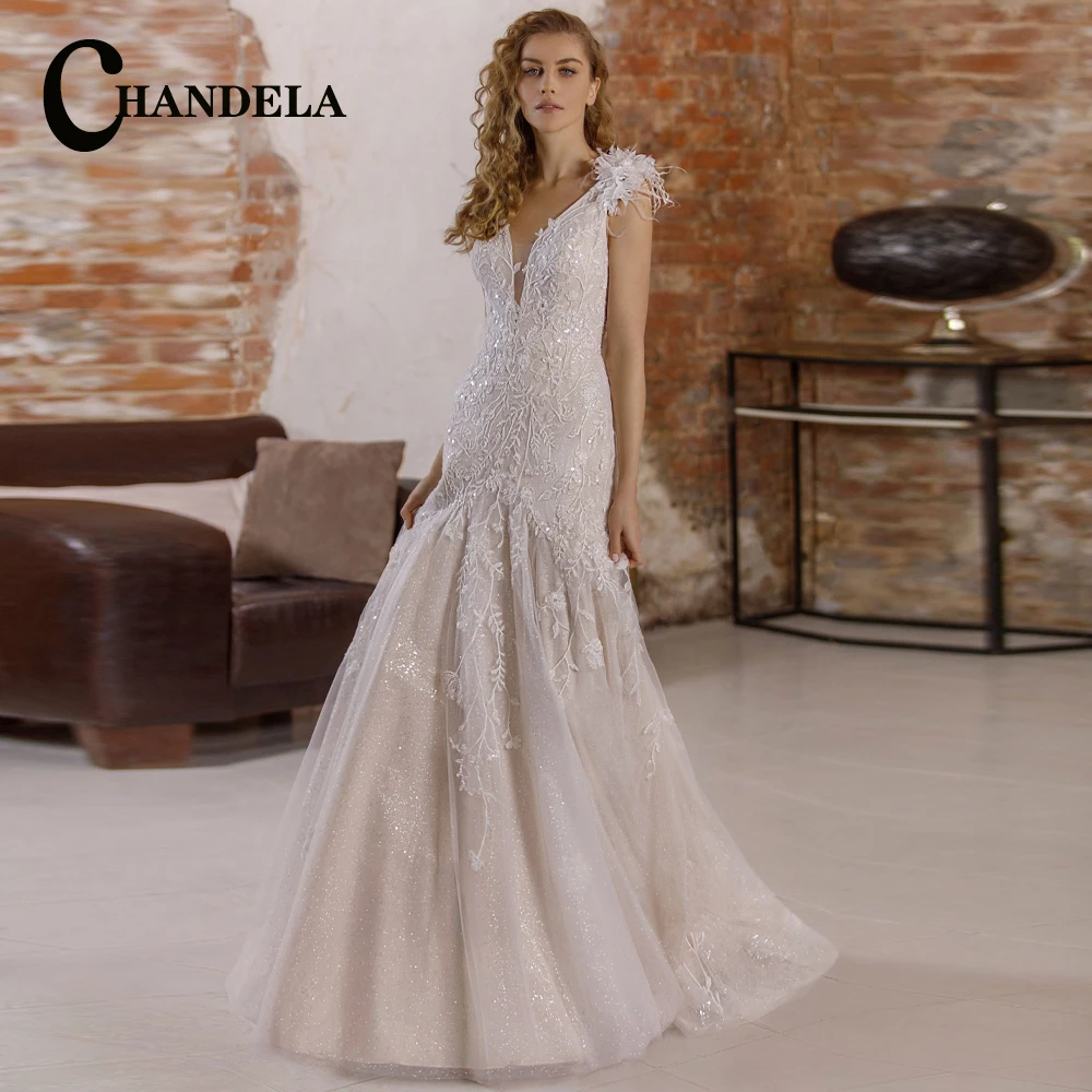 CHANDELA Sparkly Trumpet Wedding Dresses Feathers …