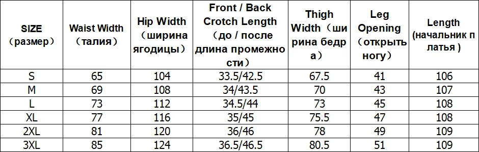SizeSIZEWaist WidthHip WidthFront / Back Crotch LengthThigh WidthLeg OpeningPants Length