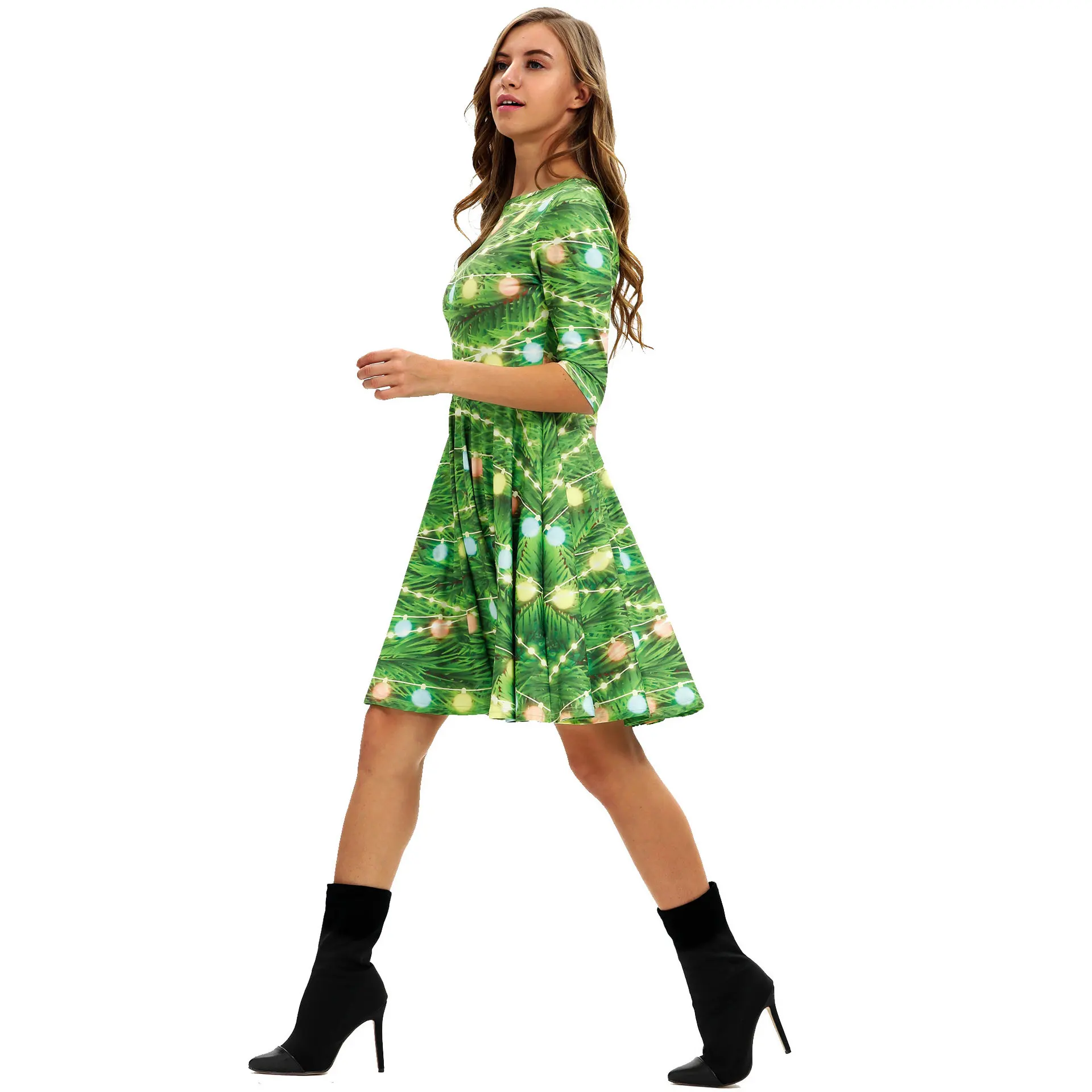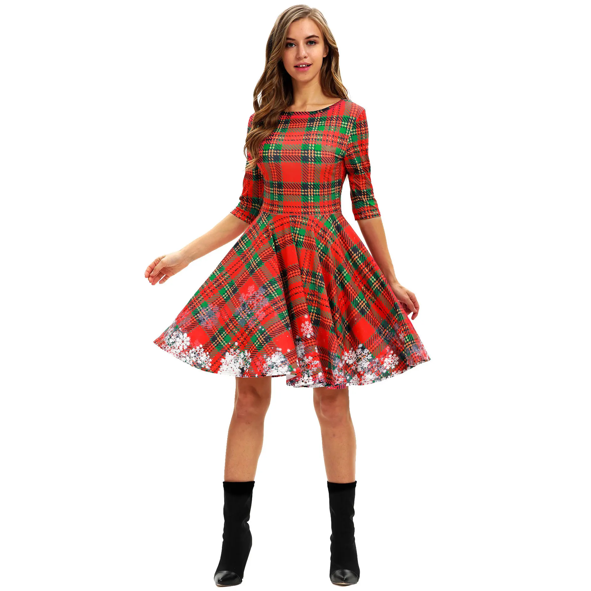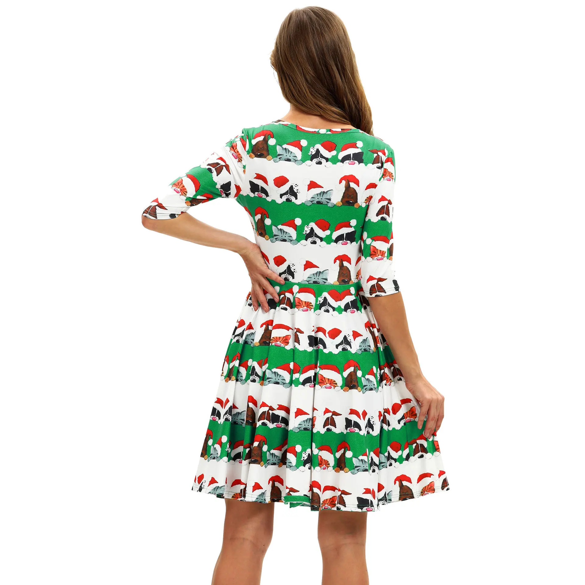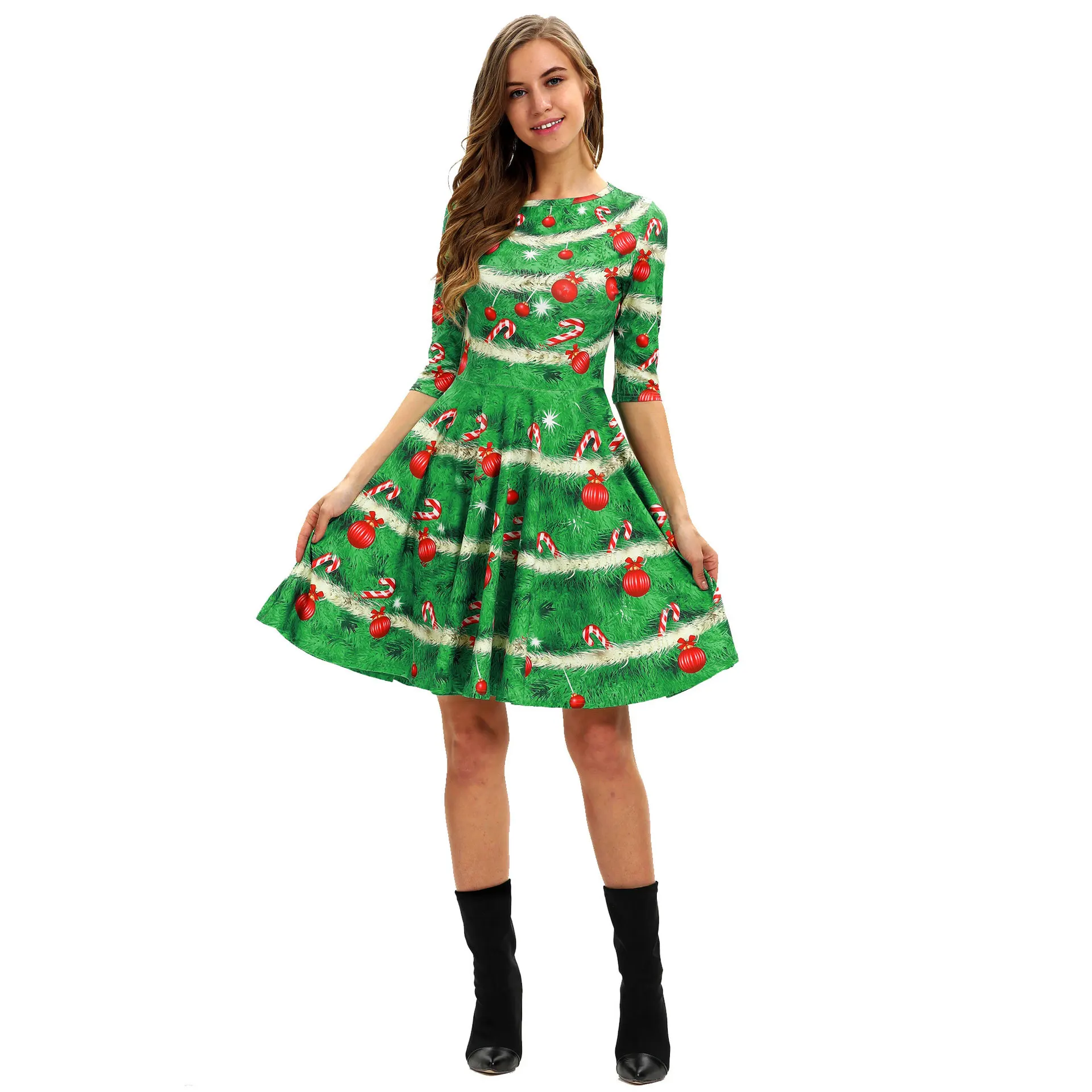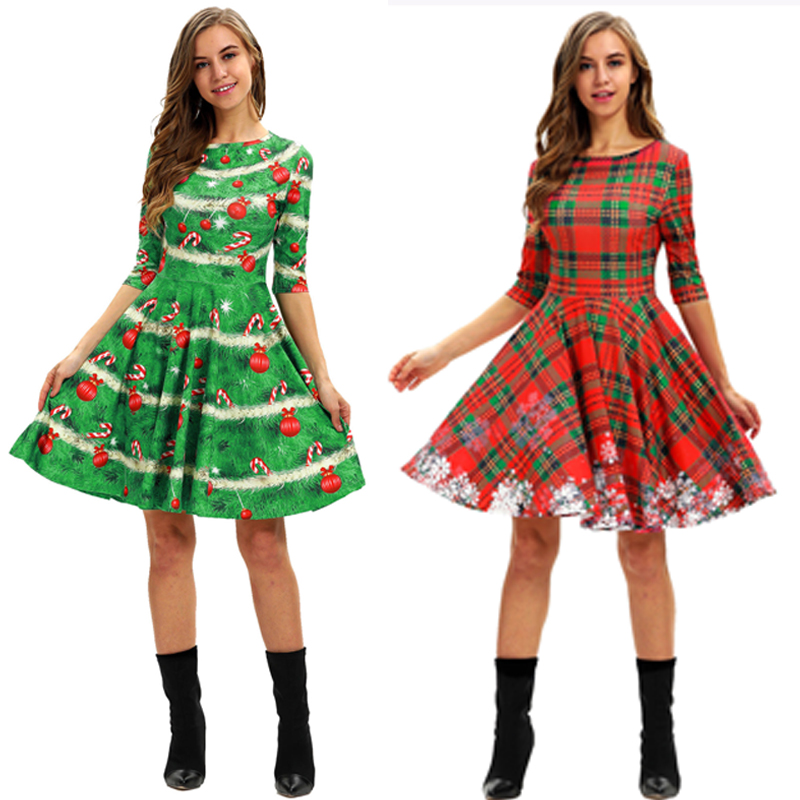 Christmas Clothes Dress Women O Neck Print Party Dress Slim Mid-Sleeve Dress Female Hot Sale Winter Christmas Dresses
