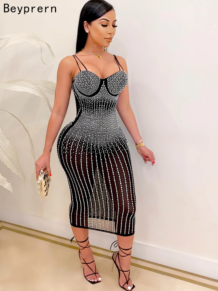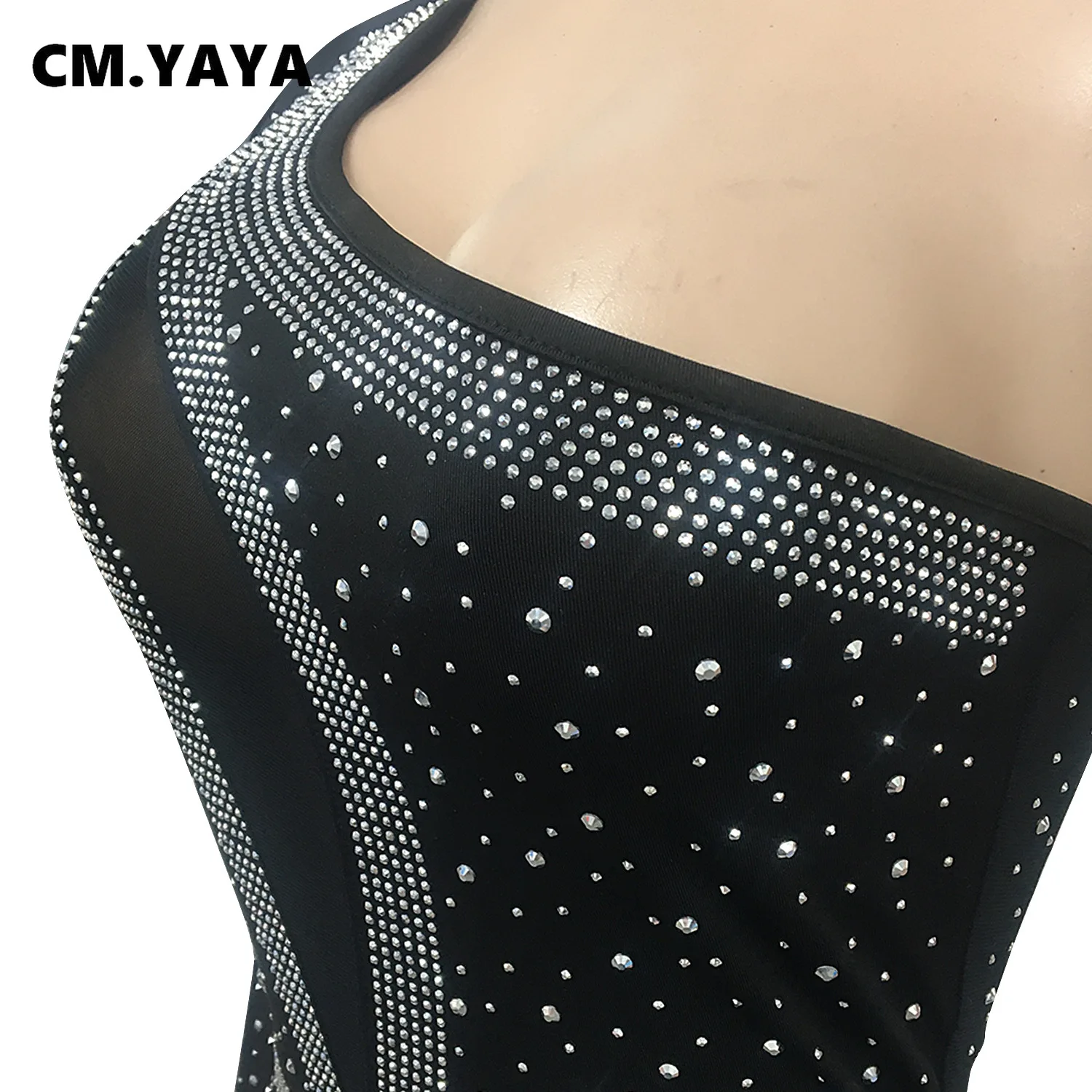 CM.YAYA 2021 Spring Women Hot Drilling Mesh See Though Floor Length Maxi Bodycon Dresss Sexy Club Party Long Irregular Dresses