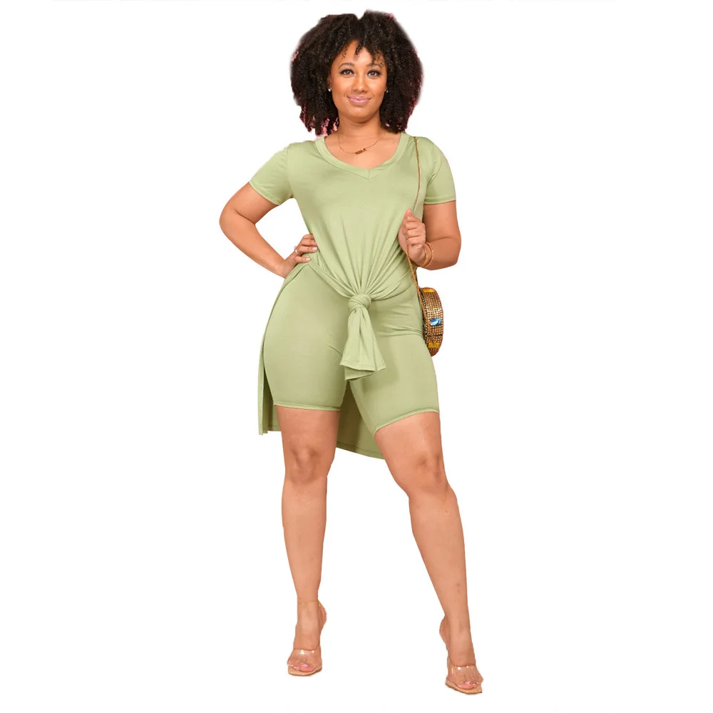 CM.YAYA 2021 Summer Women Set Solid Short Sleeve V-neck T-shirts Elastic Shorts Casual 2 Piece Sets Tracksuit Fitness Outfits