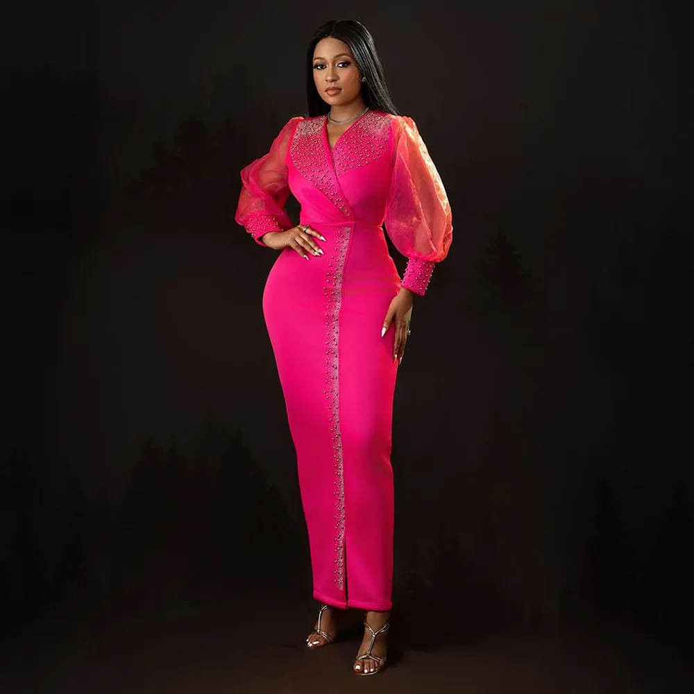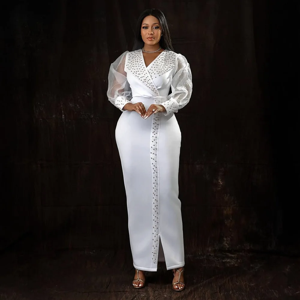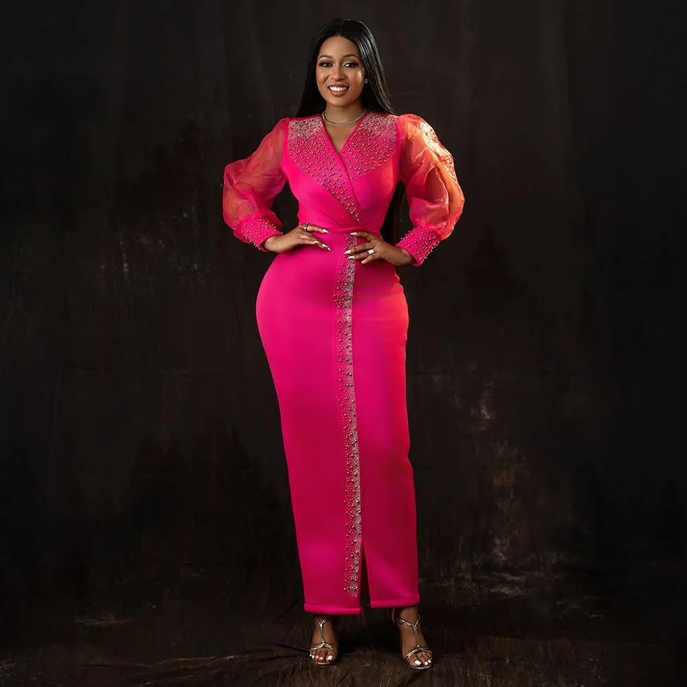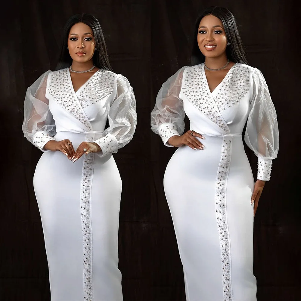 CM.YAYA 2025 African Women Puff Long Sleeve Diamonds Hot Rhinestones Long Dress Sexy Birthday V-neck Evening Birthday Dresses