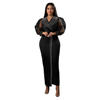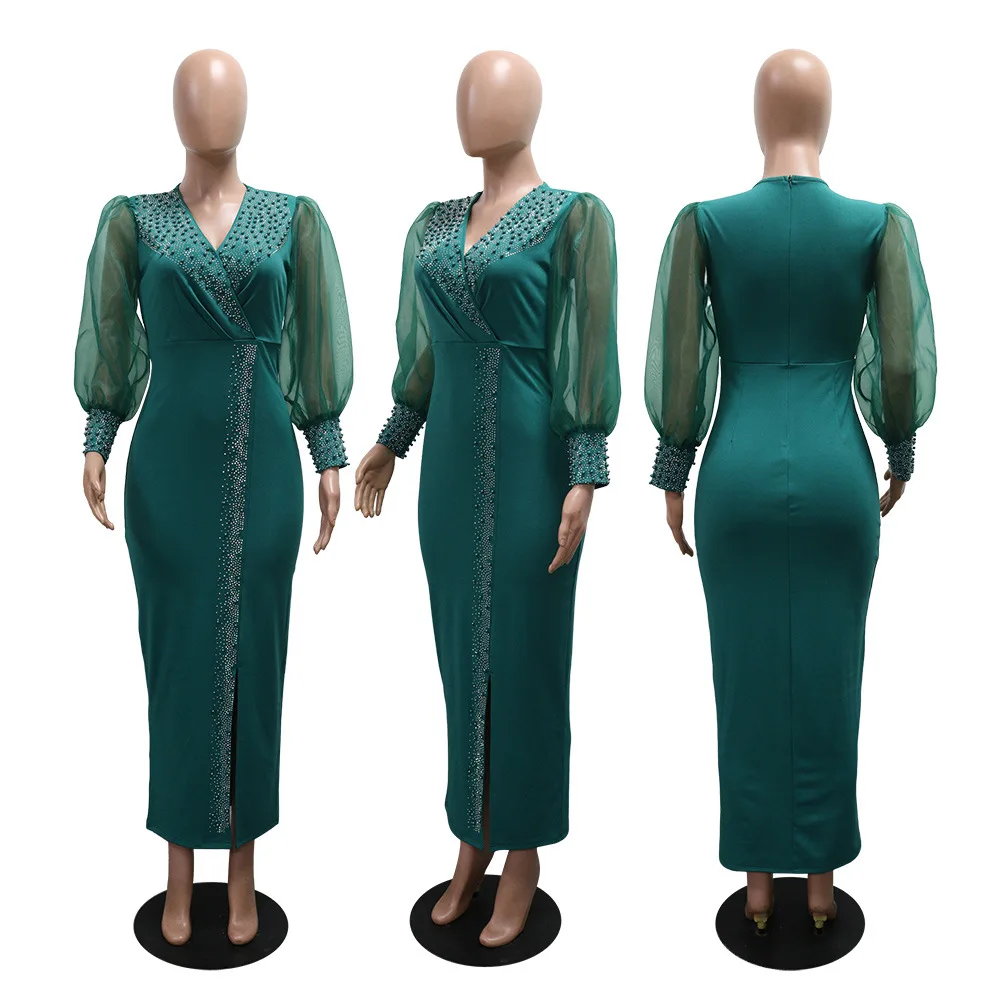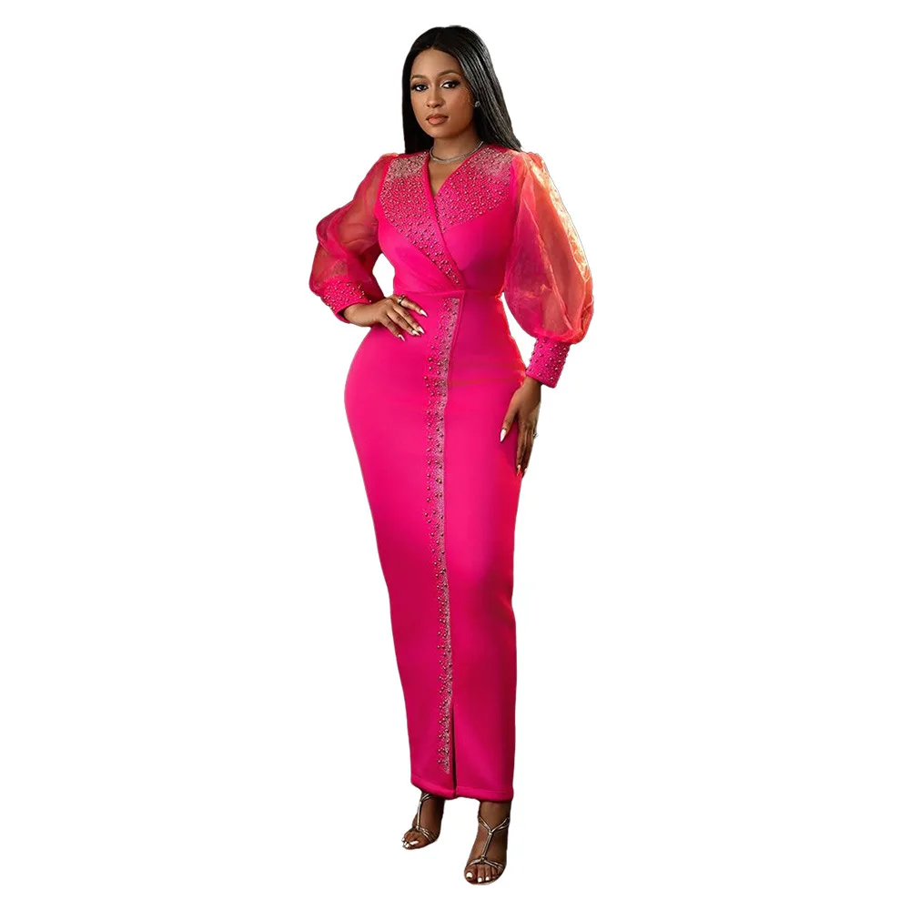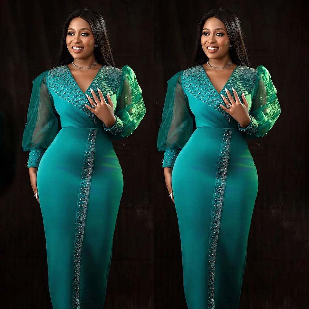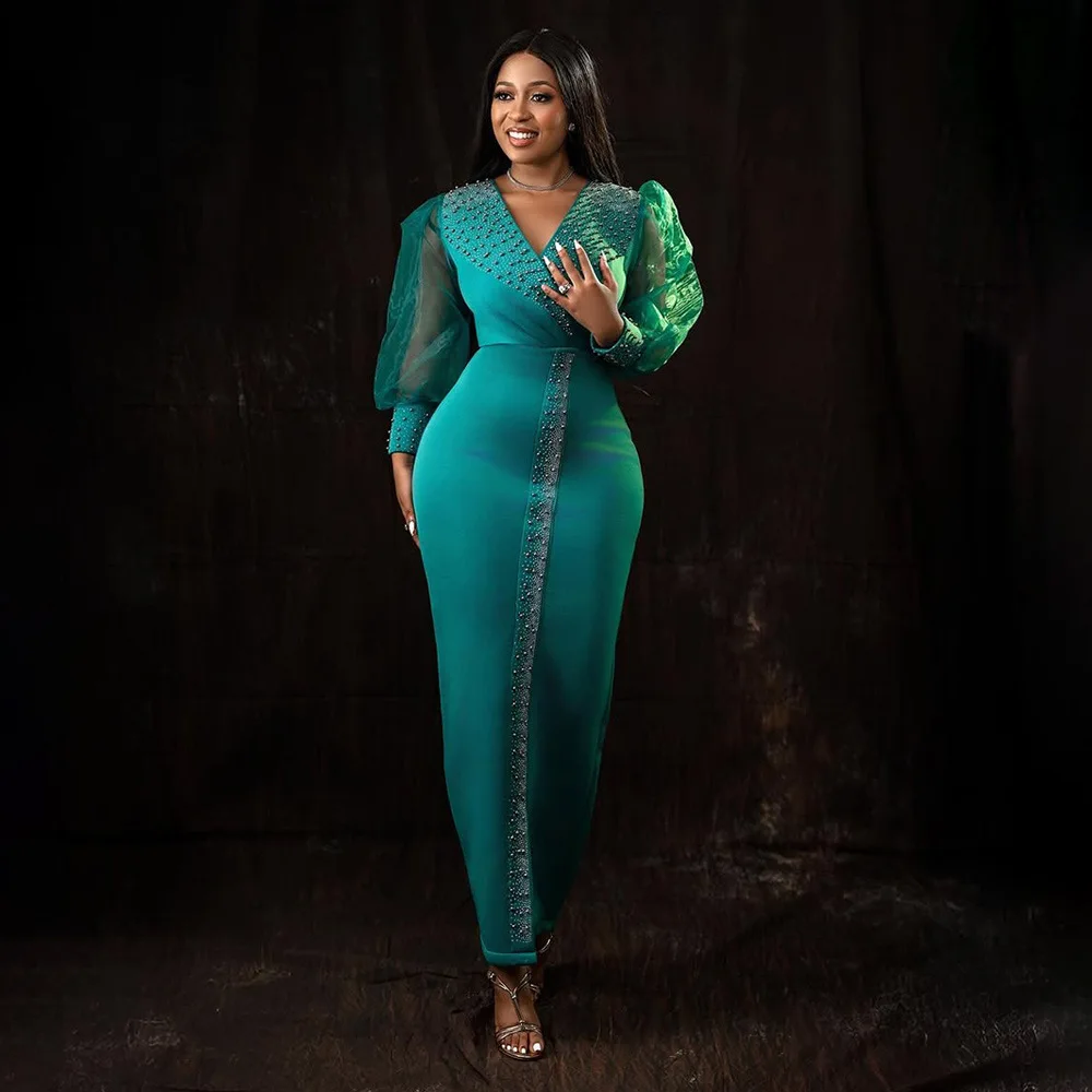 CM.YAYA 2025 African Women Puff Long Sleeve Diamonds Hot Rhinestones Long Dress Sexy Birthday V-neck Evening Birthday Dresses