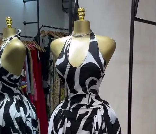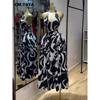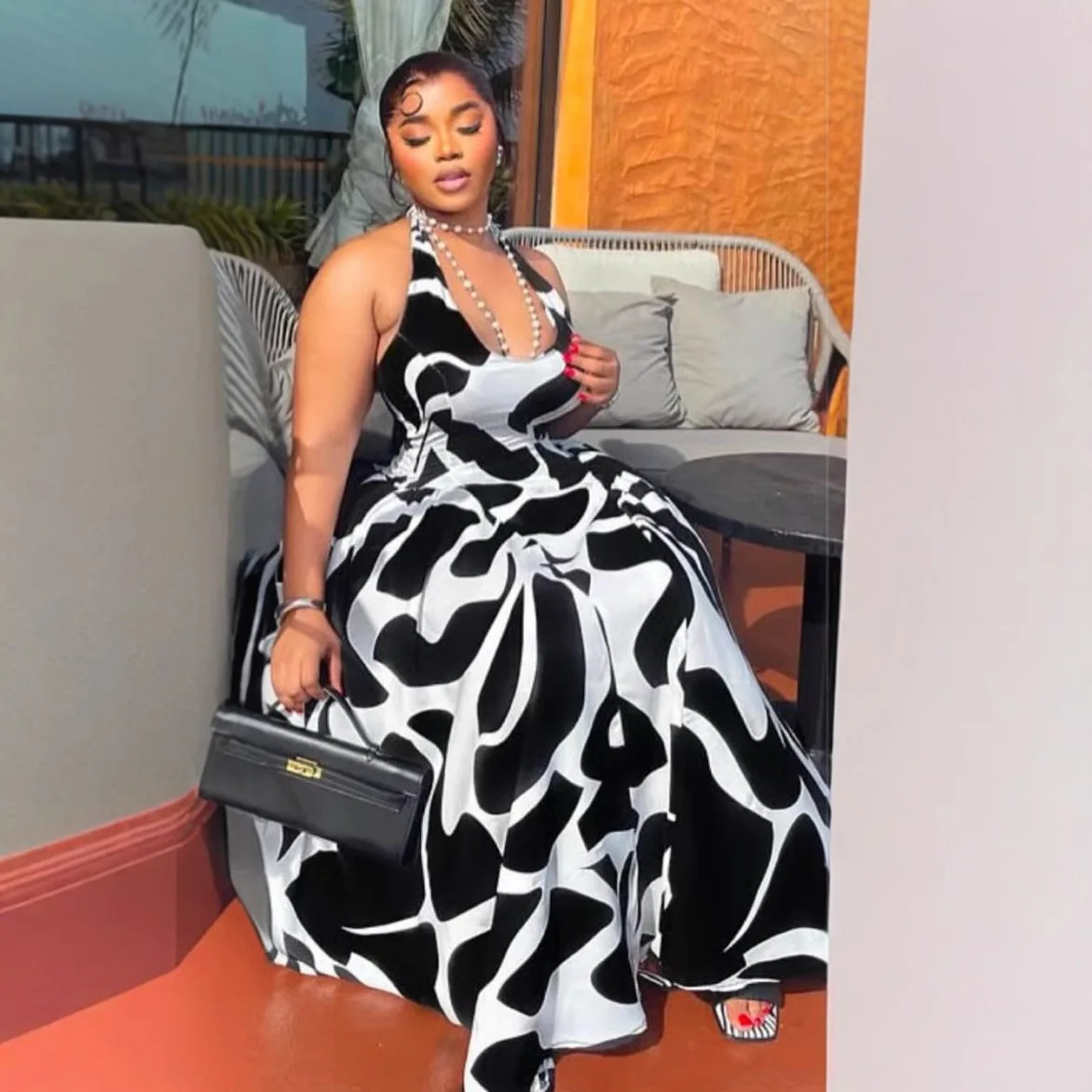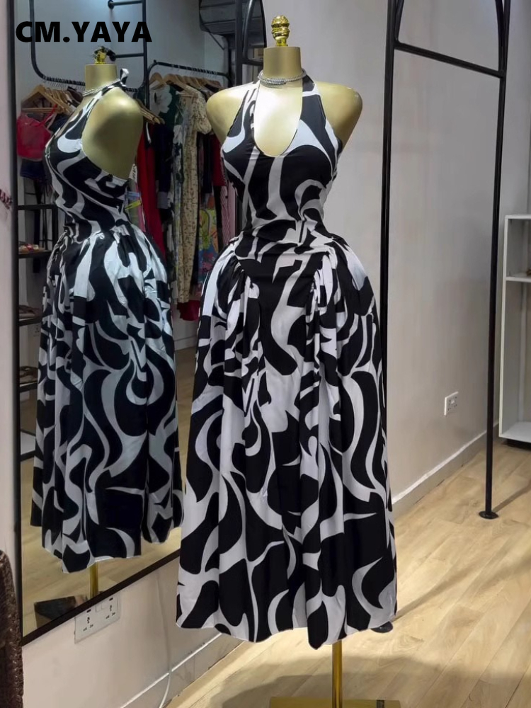 CM.YAYA 2025 Women V-neck Sleeveless Halter Print Midi Dress Backless Elegant Birthday Beach Party Vestidos Big Swing Dresses