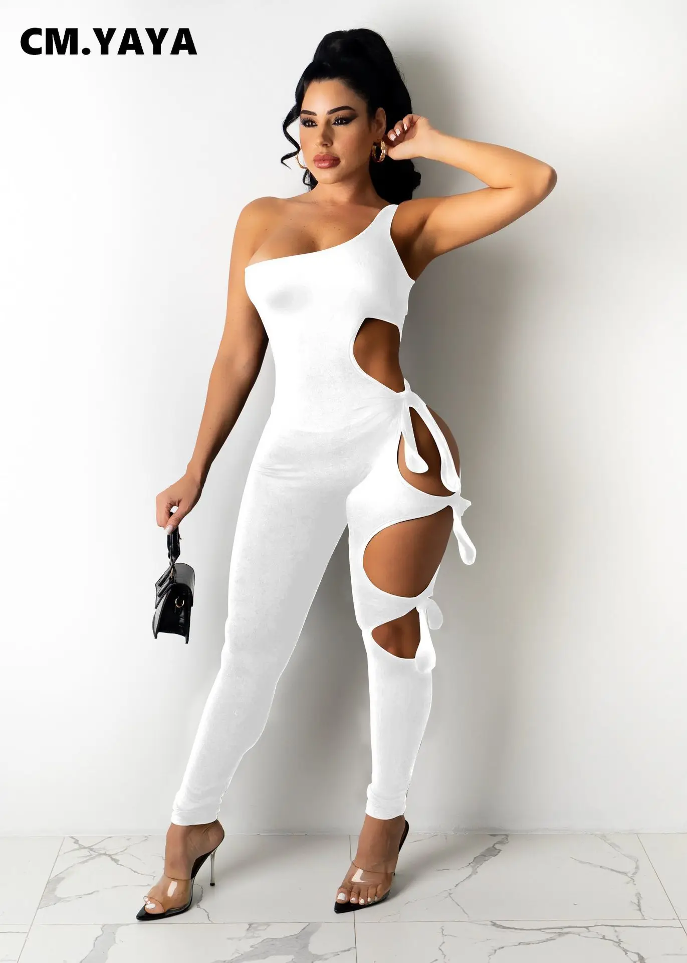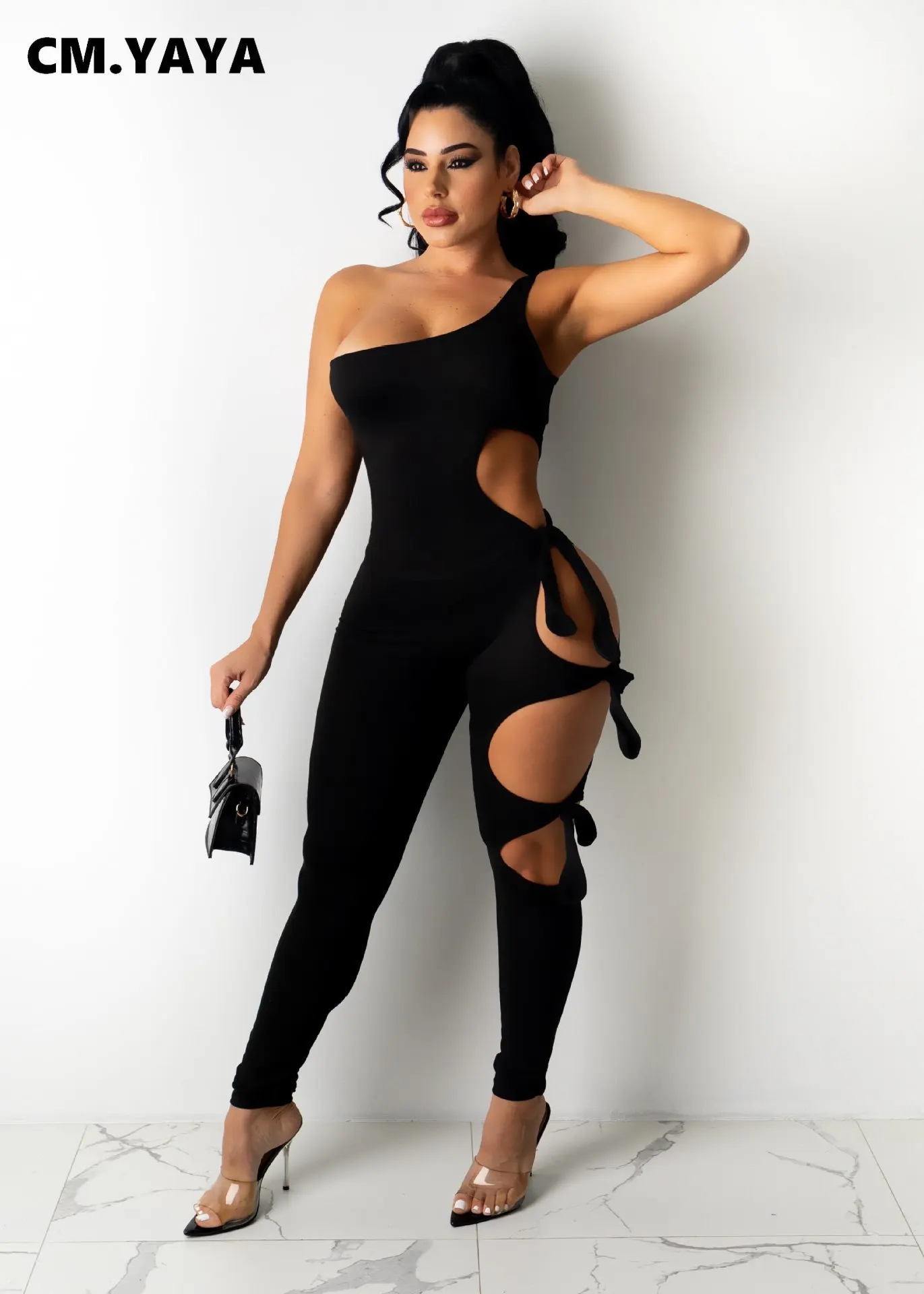 CM.YAYA Active Solid Women Cut Out Hole One Shoulder Jumpsuit Sexy Night Party Beach Romper Playsuit