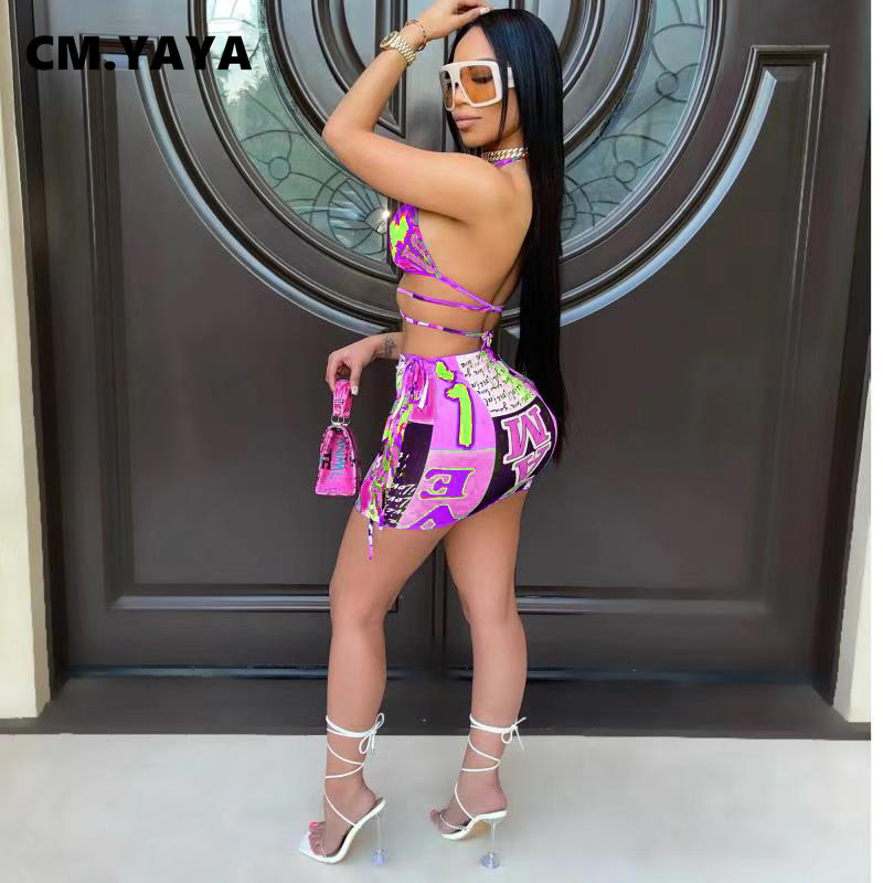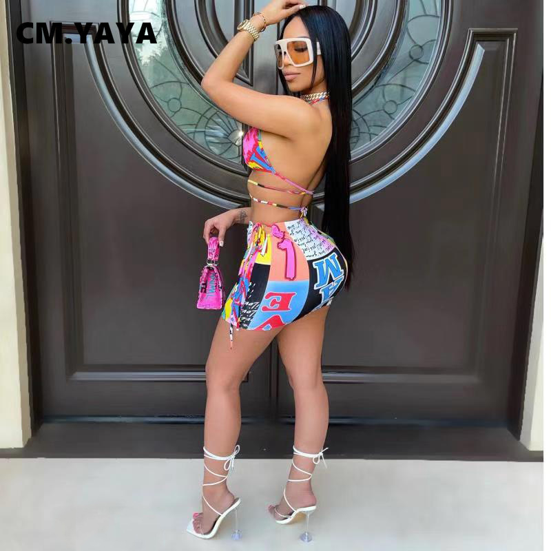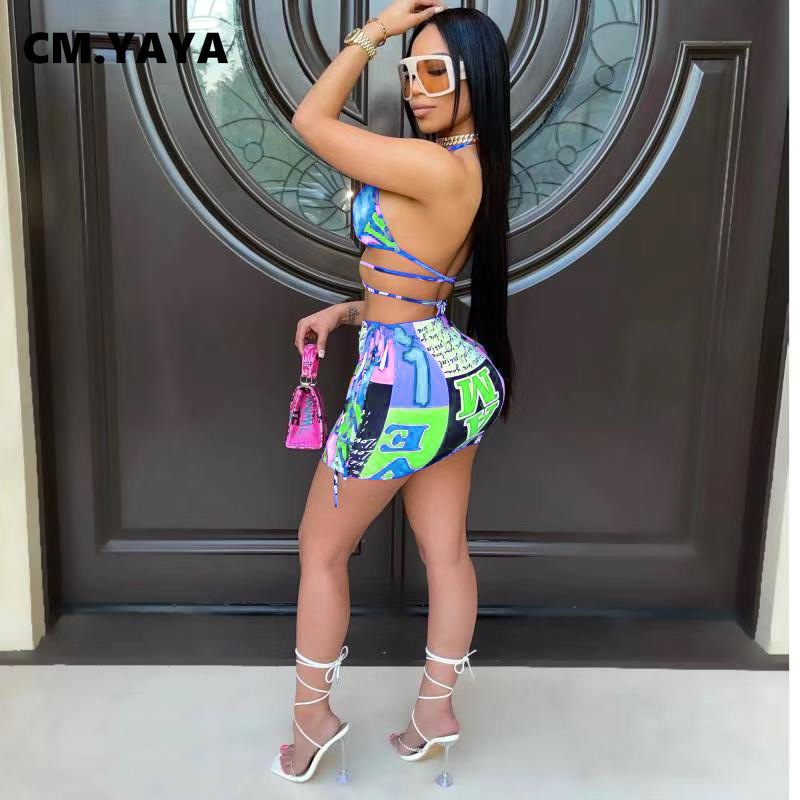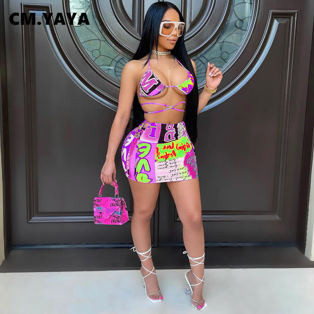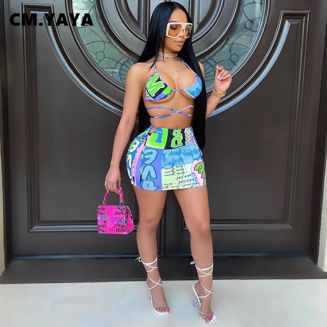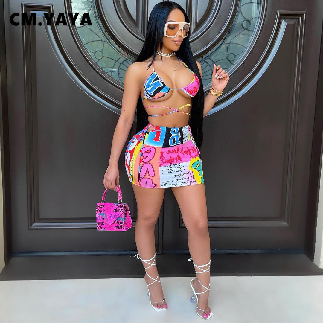 CM.YAYA Bikinis Set Women Print Halter Bandage Bra Mid Waist Sheath Elastic Mini Skirts Matching Sets Sexy Beachwear Swimsuits