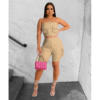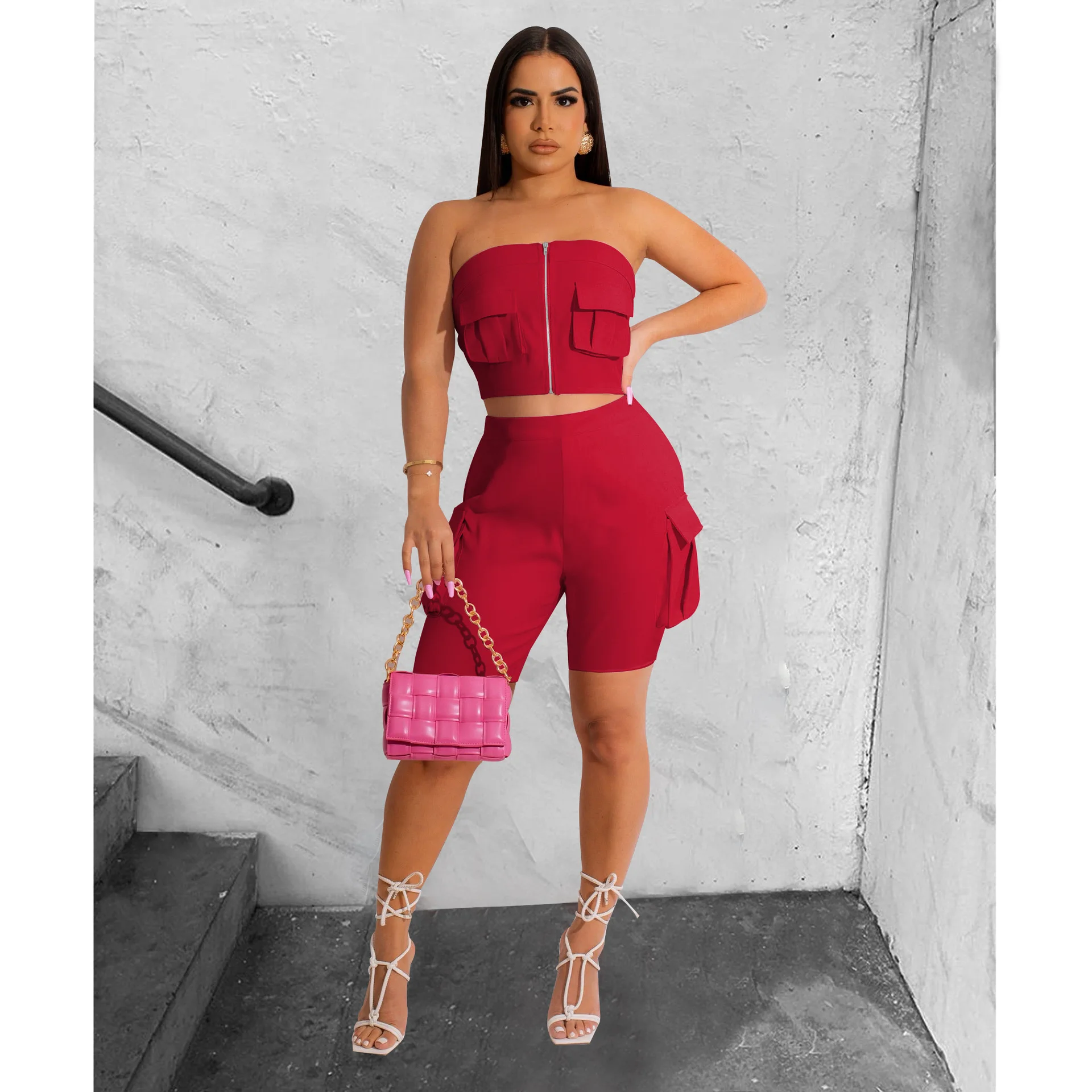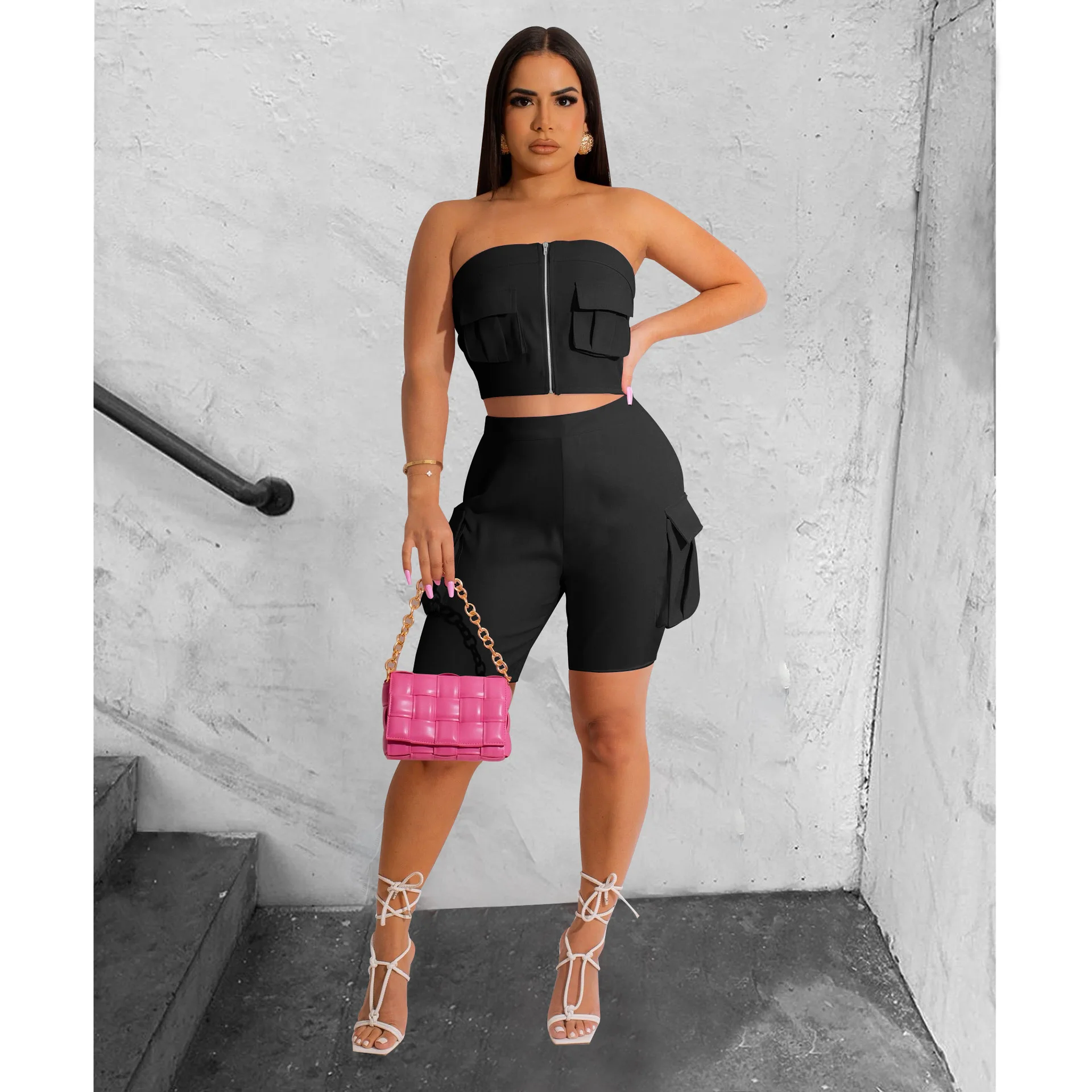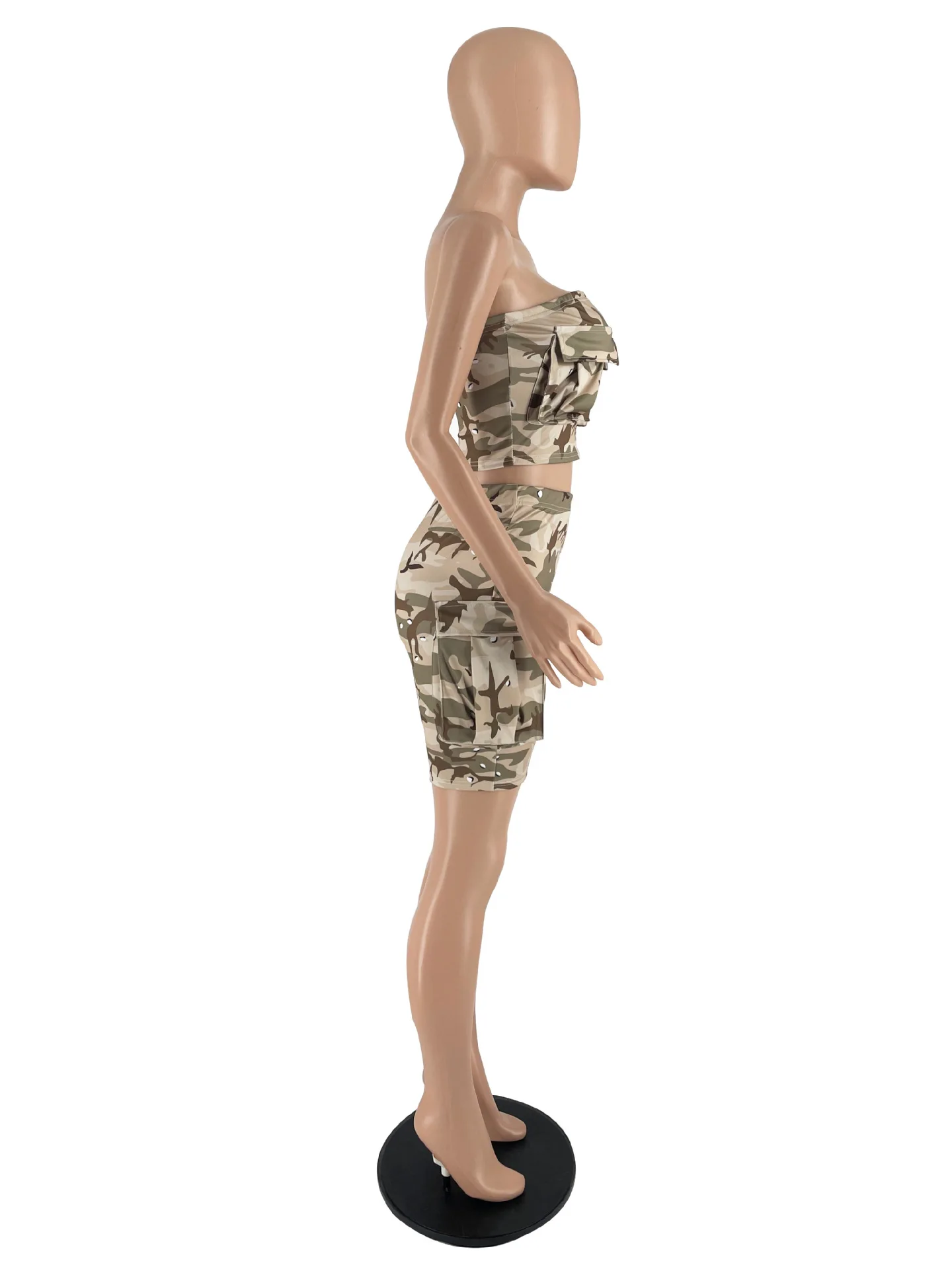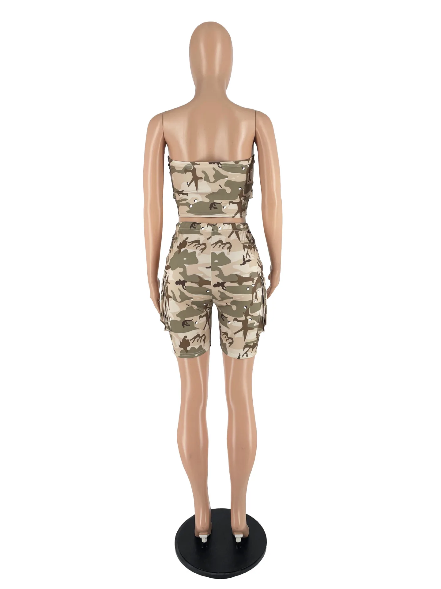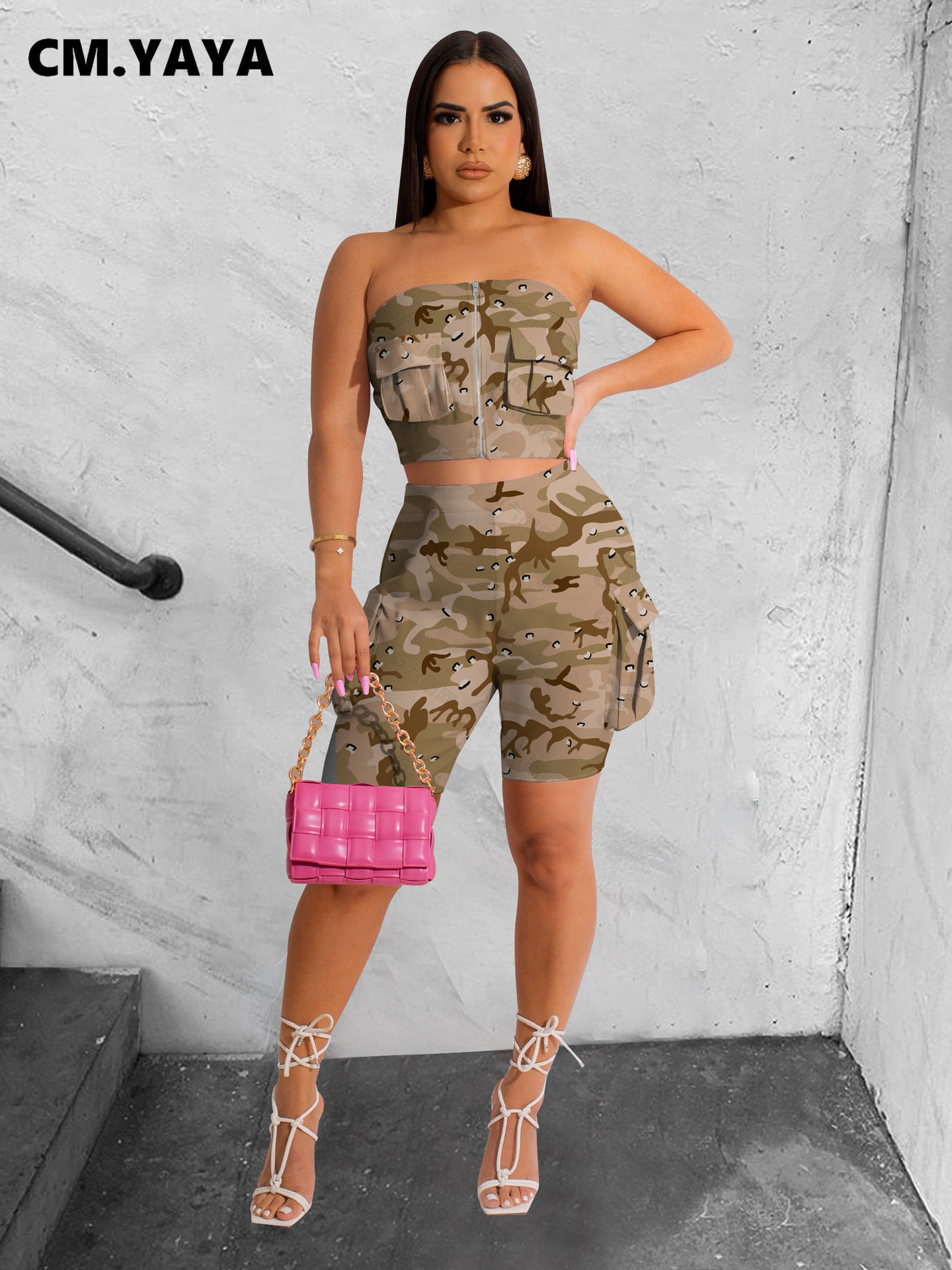 CM.YAYA Camouflage Solid Women’s Set Zipper Strapless Pocket Top and Shorts Safari Style 2023 Two 2 Piece Set Outfit Tracksuit