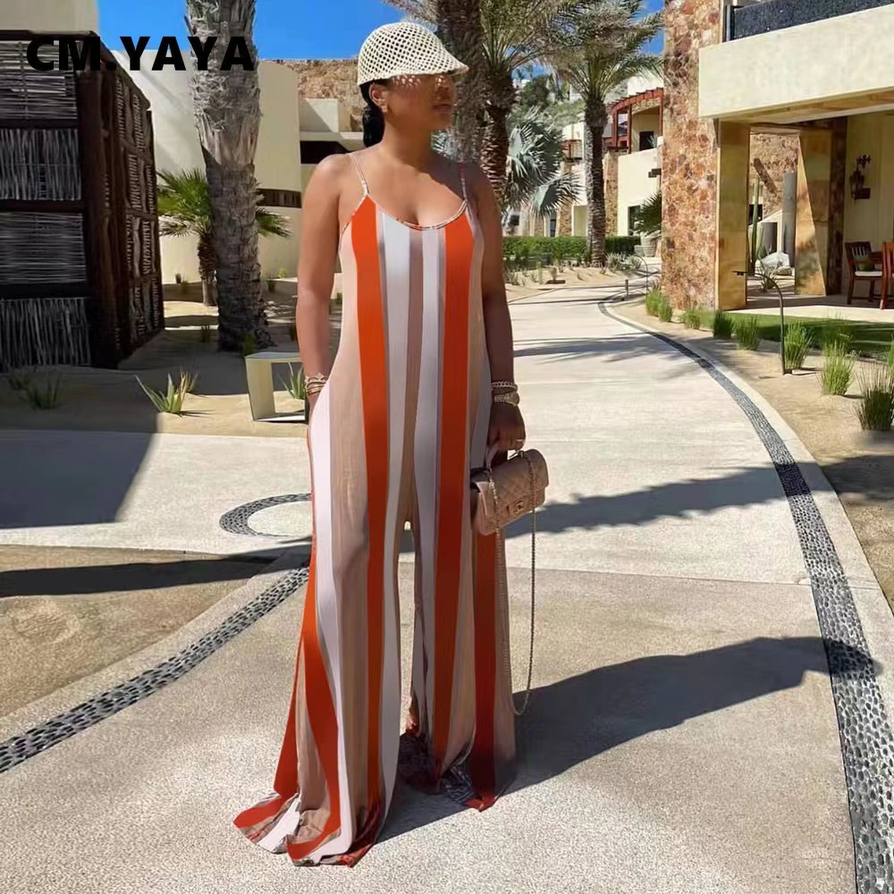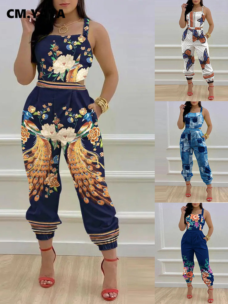 CM.YAYA Chic Women Floral Peacock Plaid Print Sleeveless Bowknot Back Tank Jumpsuit 2023 INS Playsuit One Piece Suit Romper