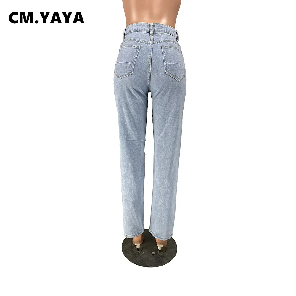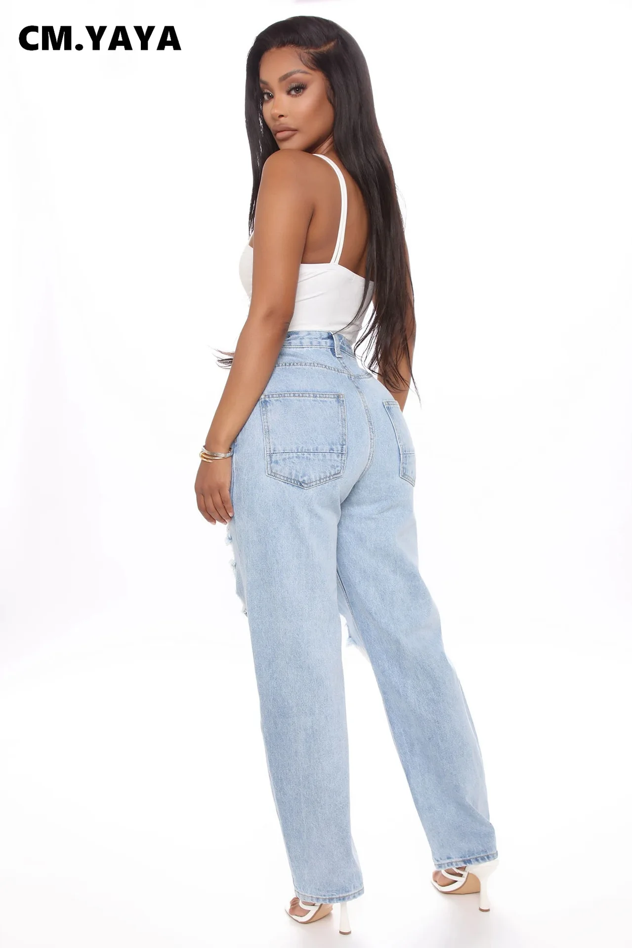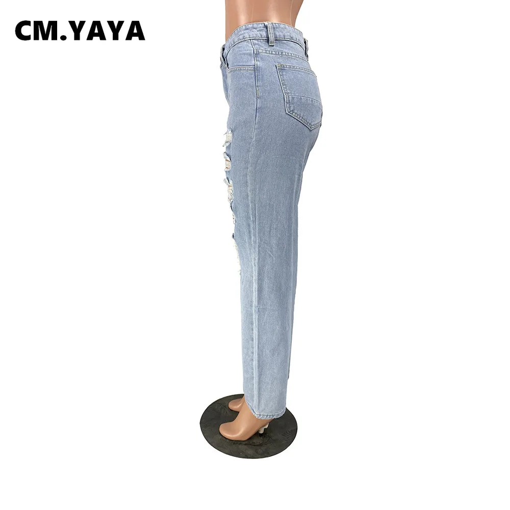 CM.YAYA Cut Out Hole Washed Denim Pants Women Retro Straight Jeans Trousers Streetwear High Waist Lady Pants