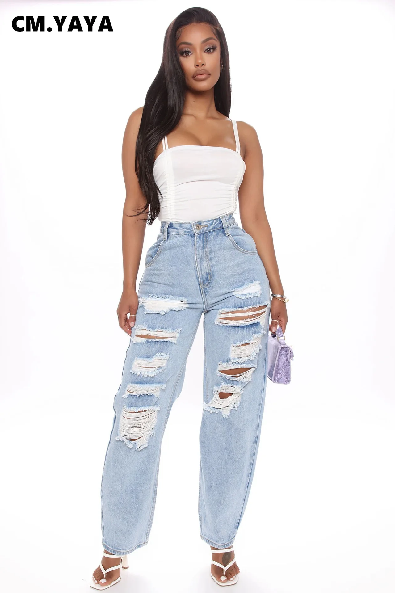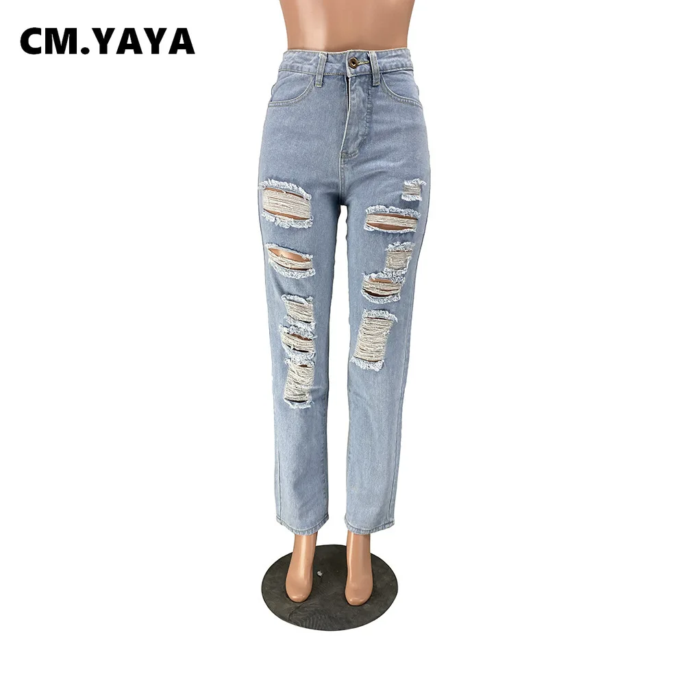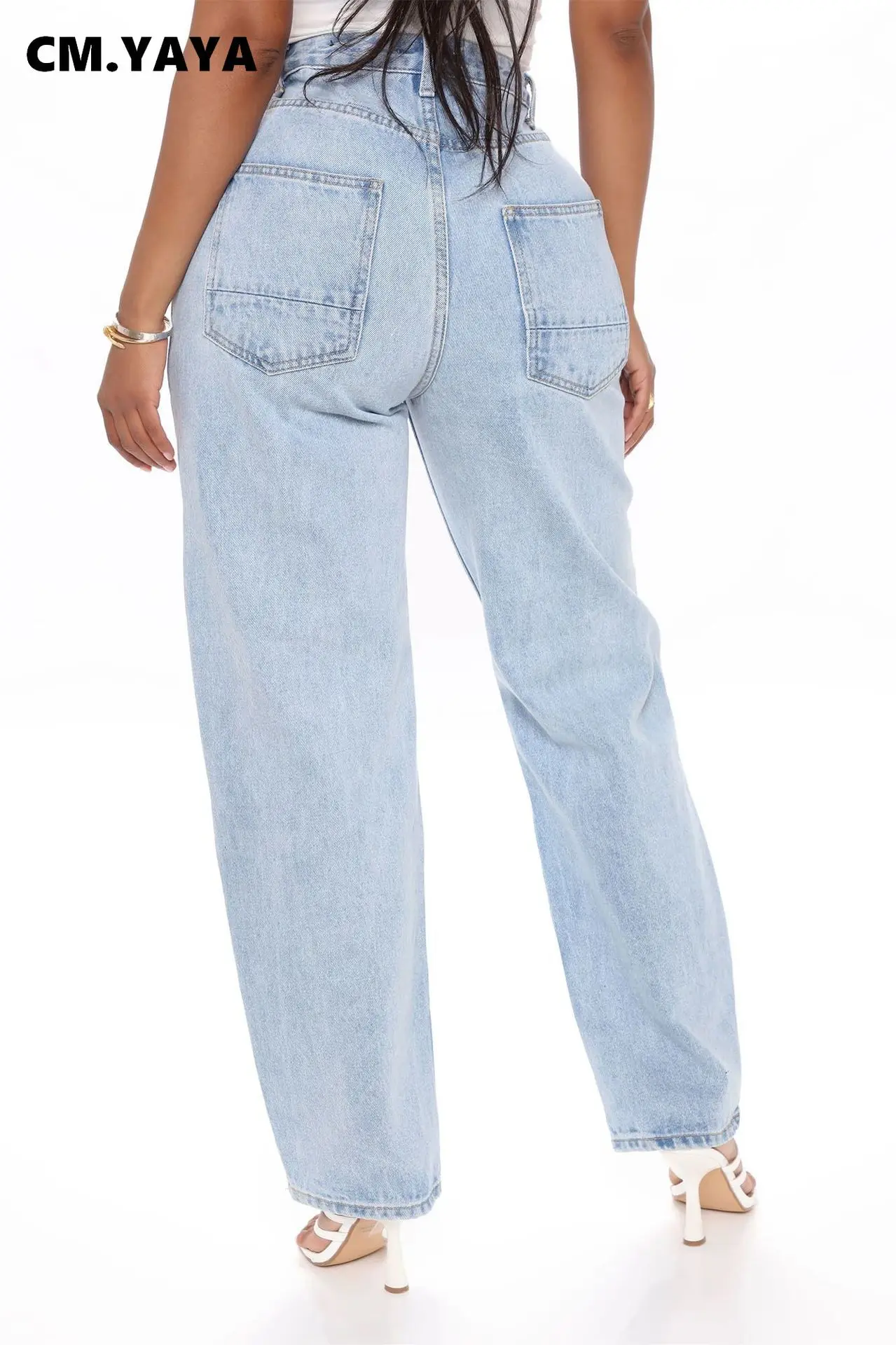 CM.YAYA Cut Out Hole Washed Denim Pants Women Retro Straight Jeans Trousers Streetwear High Waist Lady Pants