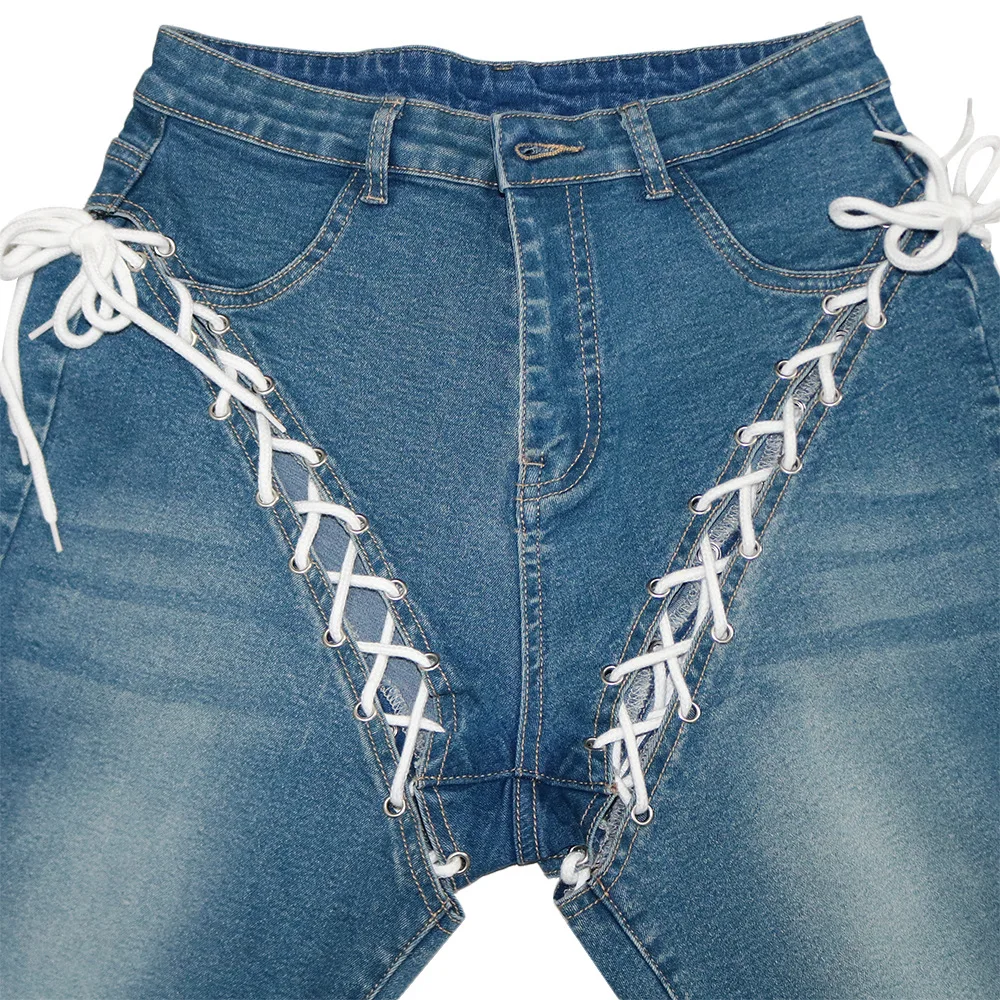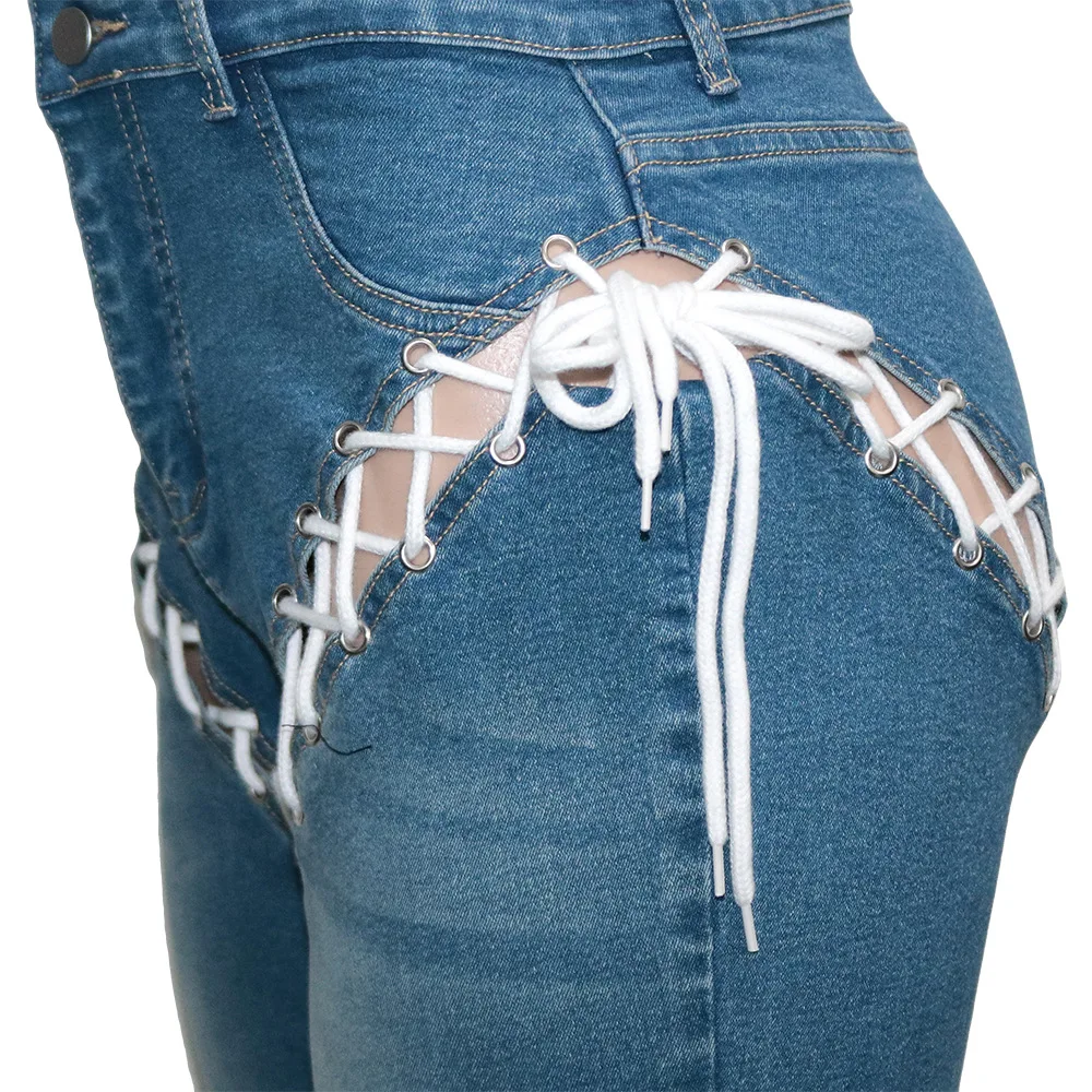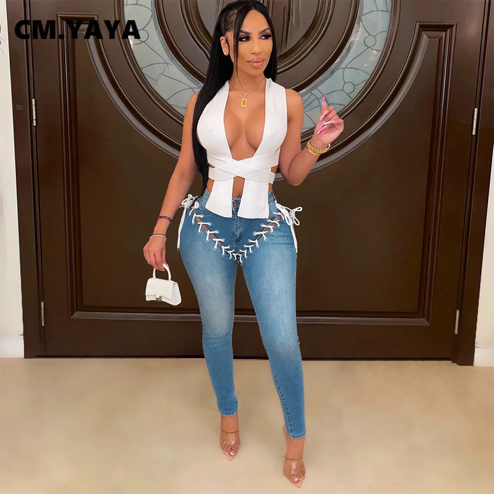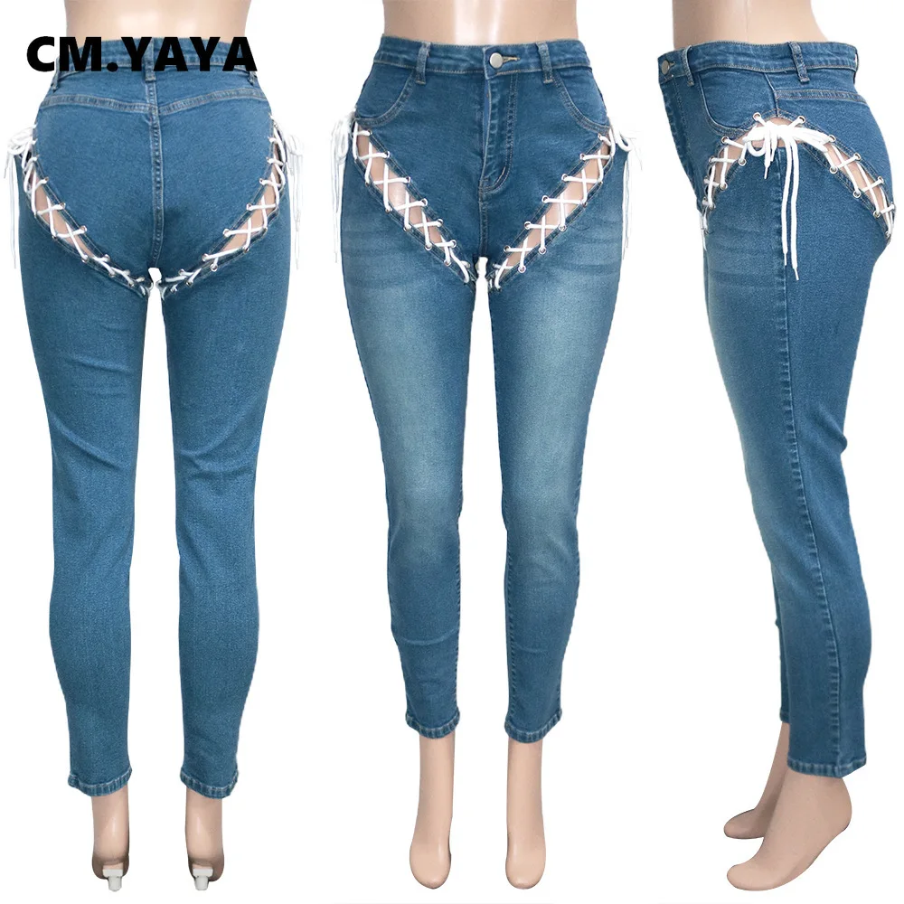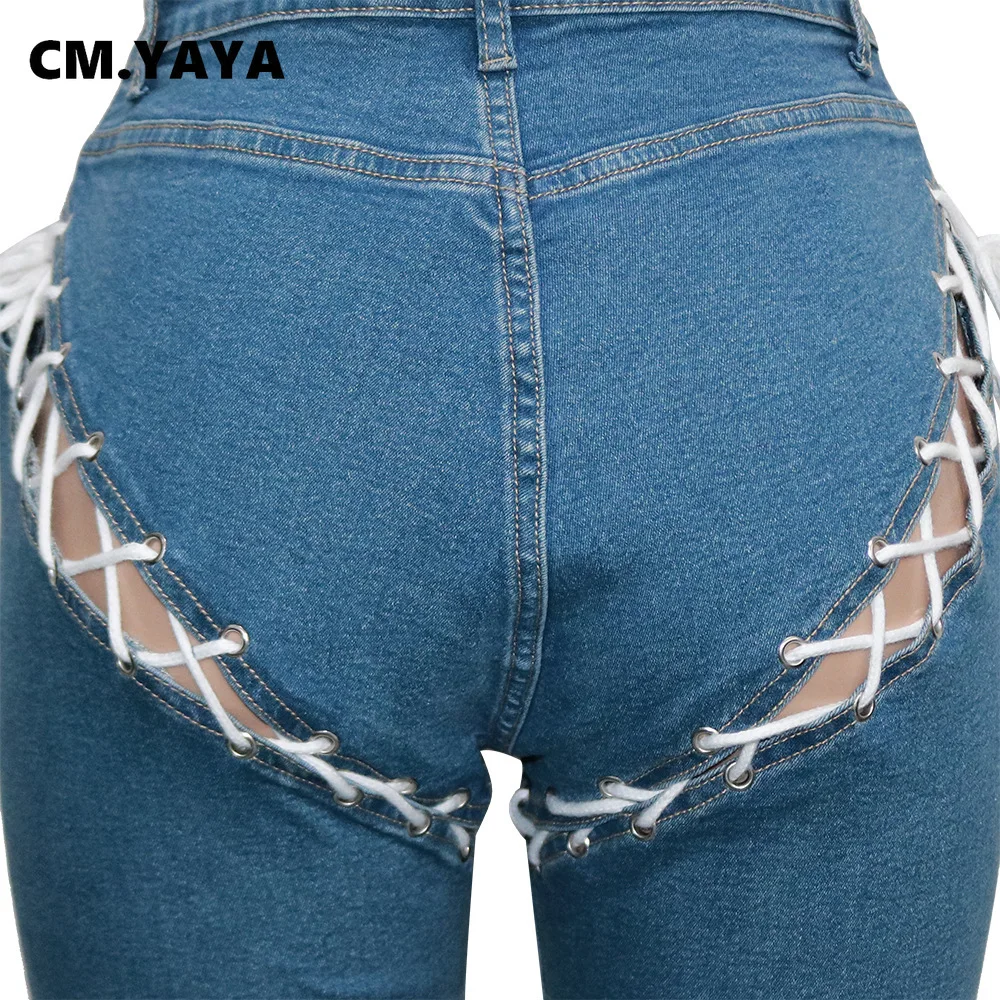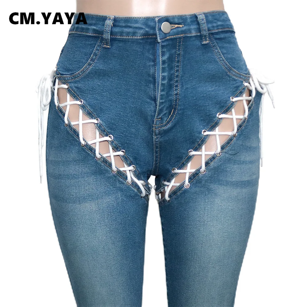 CM.YAYA Denim Pants Women Retro Drawstring Lace Up Hole Jeans Ripped Pencil Trousers Street Skinny High Waist Lady Pants