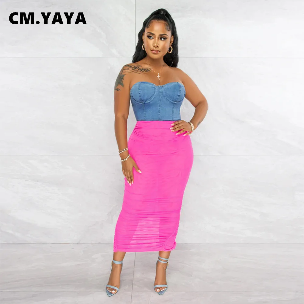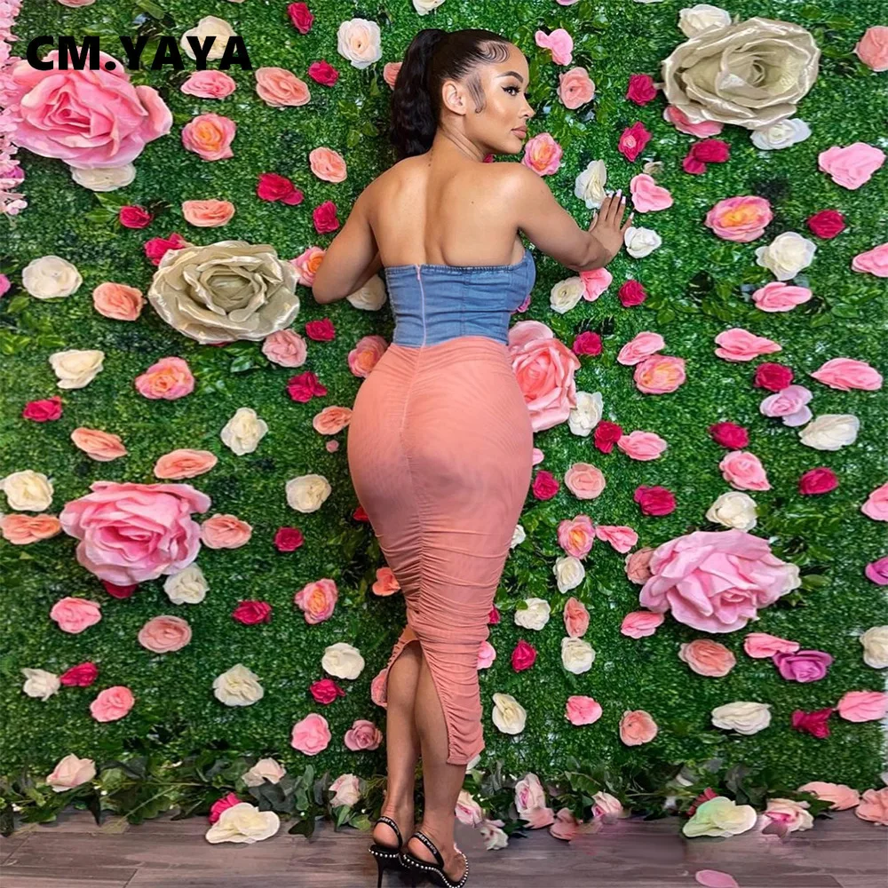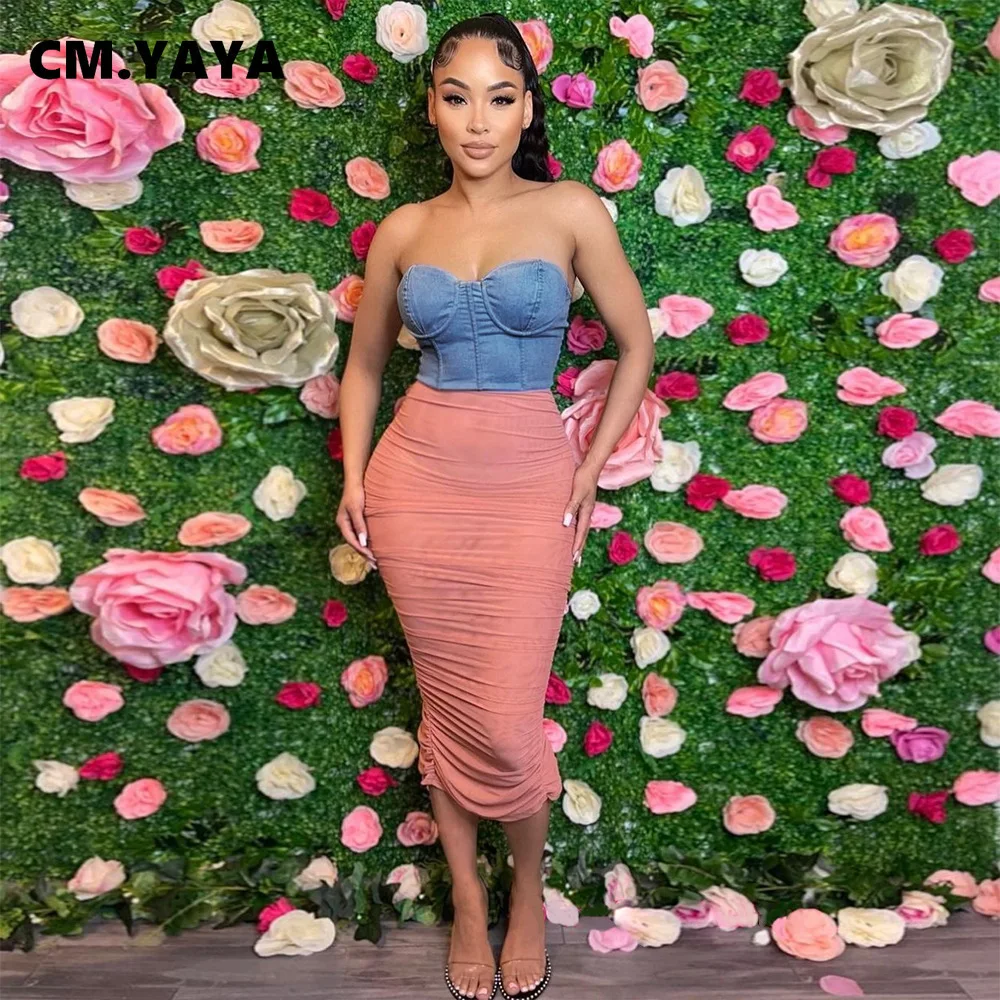 CM.YAYA Denim Patchwork Strapless High Waist Tunic Ruched Bodycon Midi Dress Women 2022 Sexy Party Club Jean Sleeveless Dresses