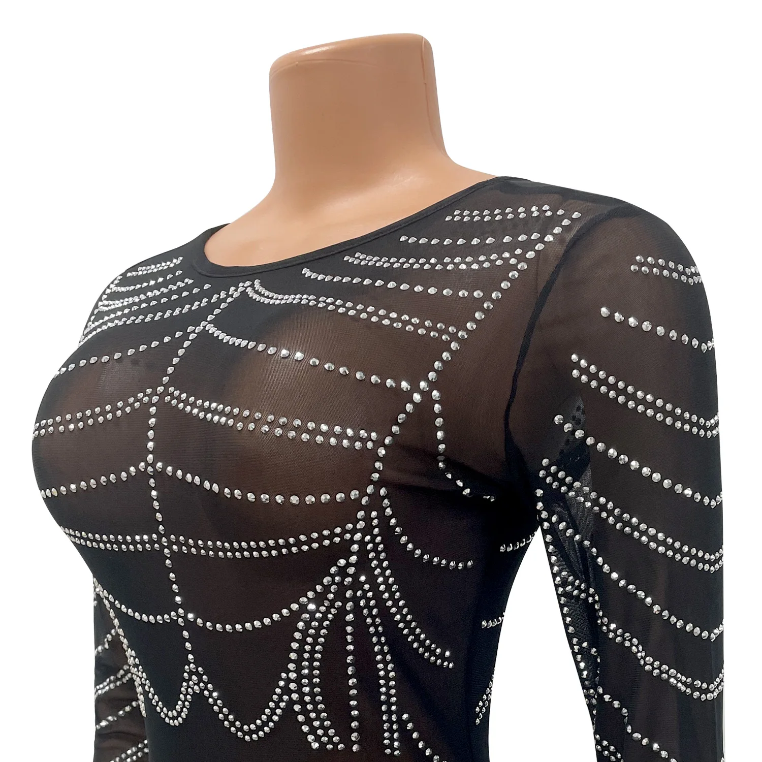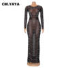 CM.YAYA Diamonds Hot Rhinestones Mesh See Though Long Sleeve Split Back Maxi Long Black Prom Party Dress for Women Vestidos