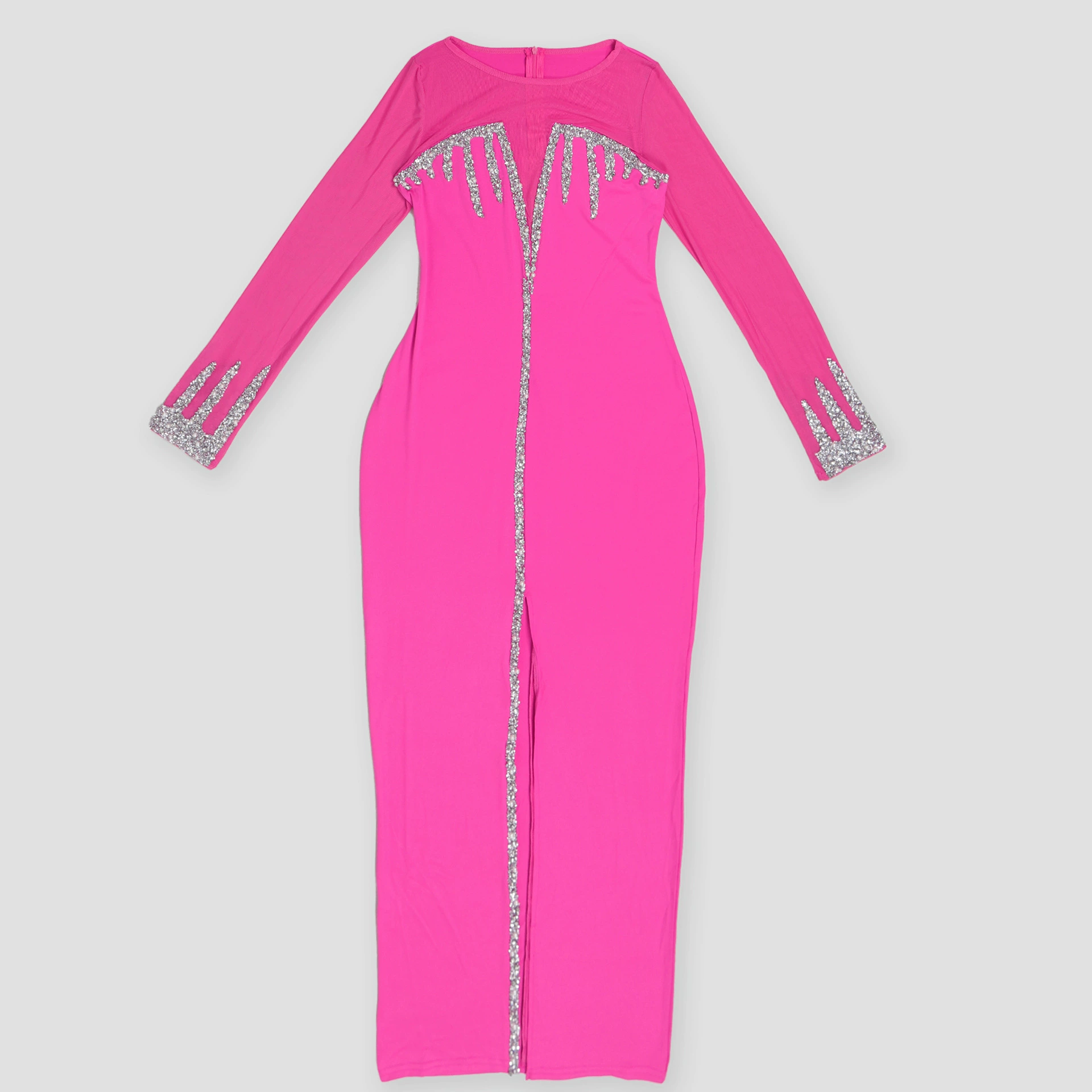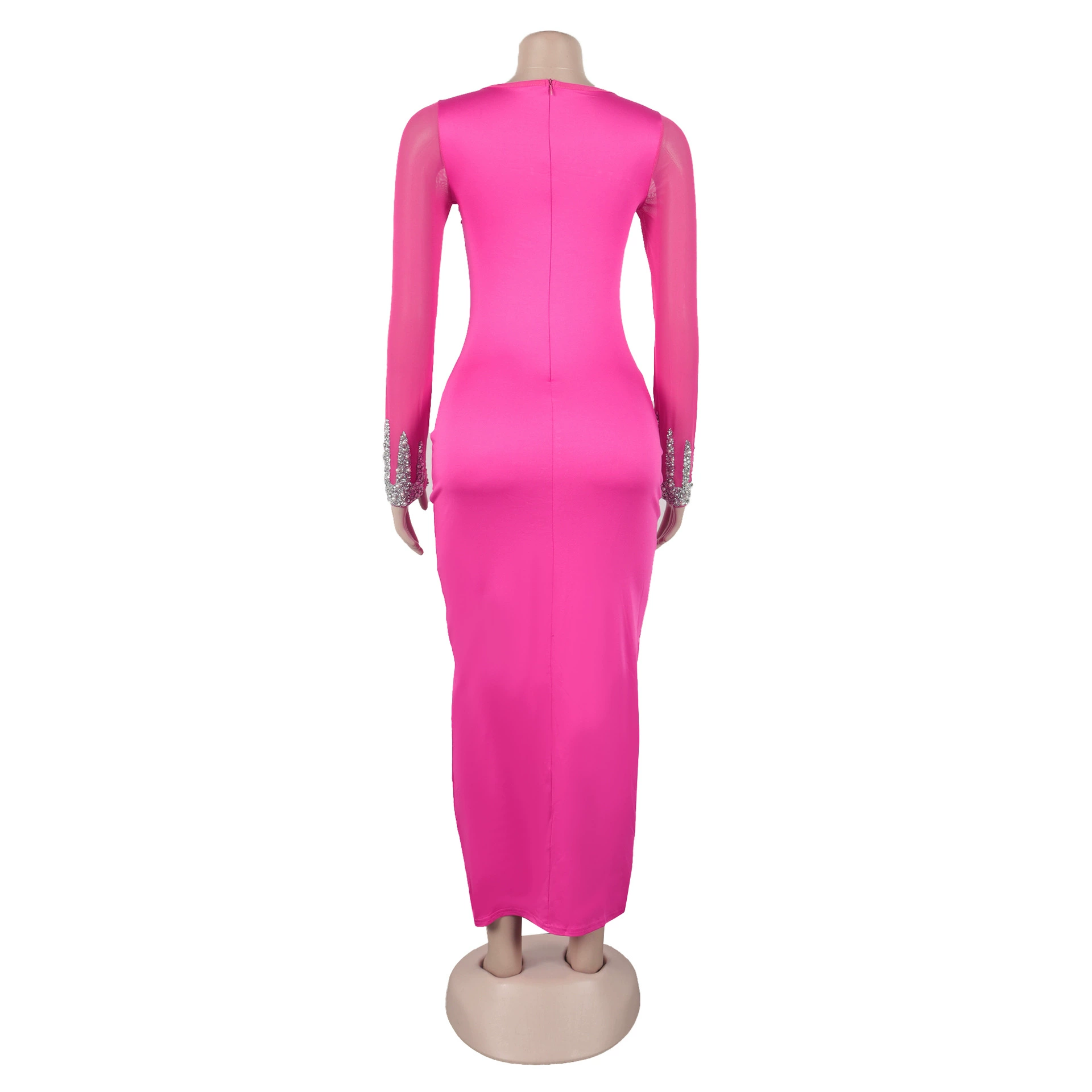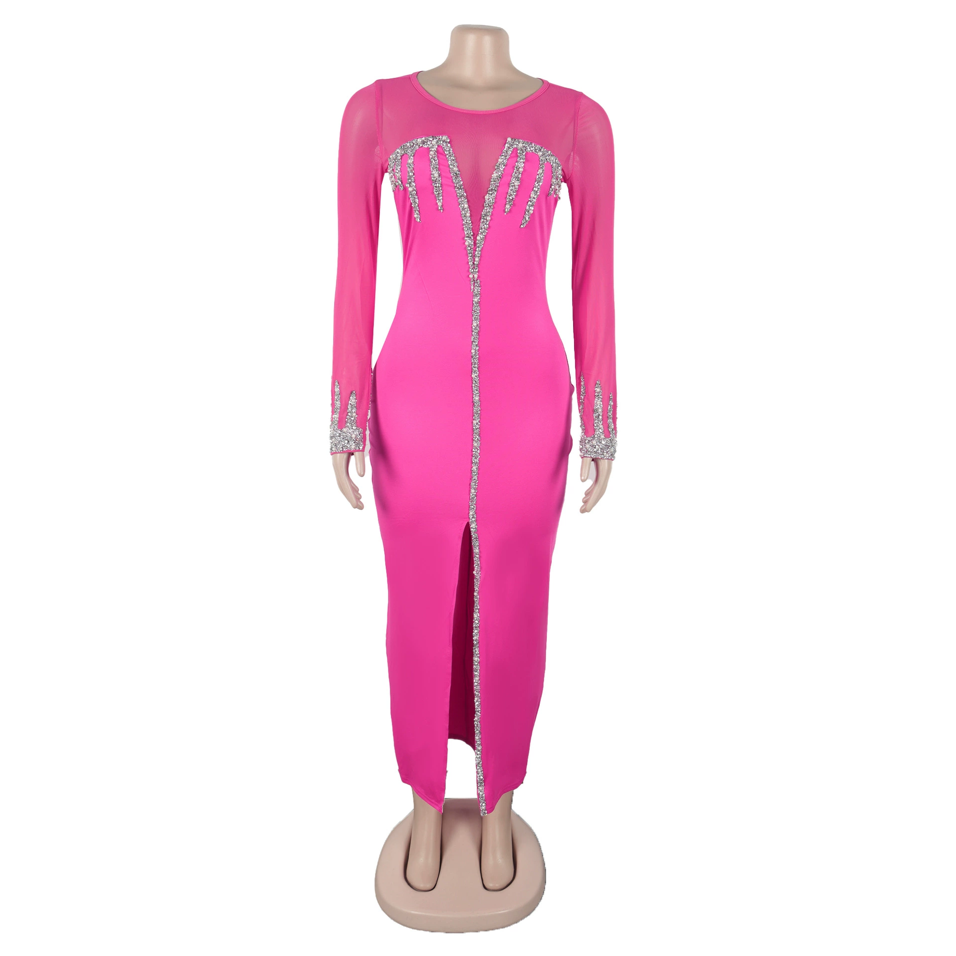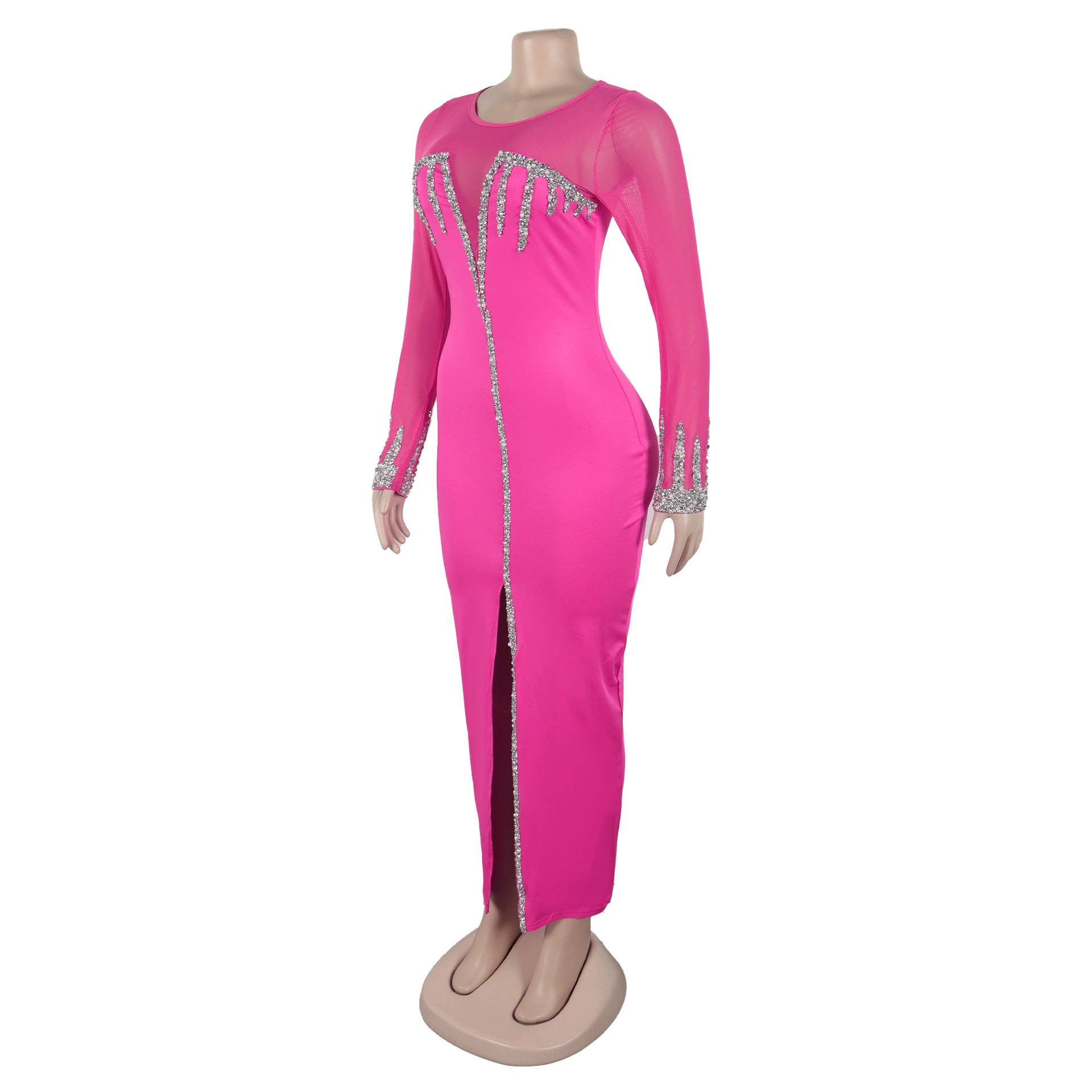 CM.YAYA Diamonds Hot Rhinestones O-neck Women Mesh Full Sleeve Long Dress 2025 High Split Party Night Evening Prom Maxi Dresses