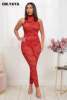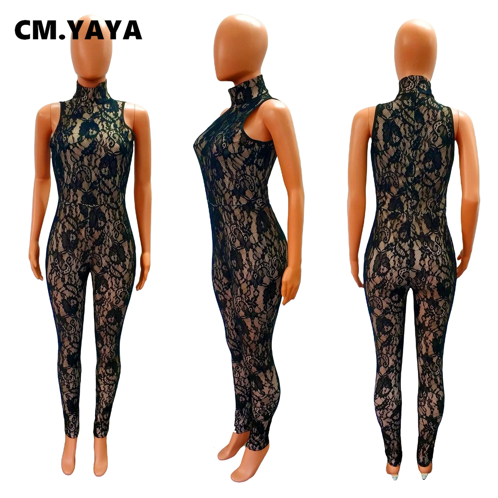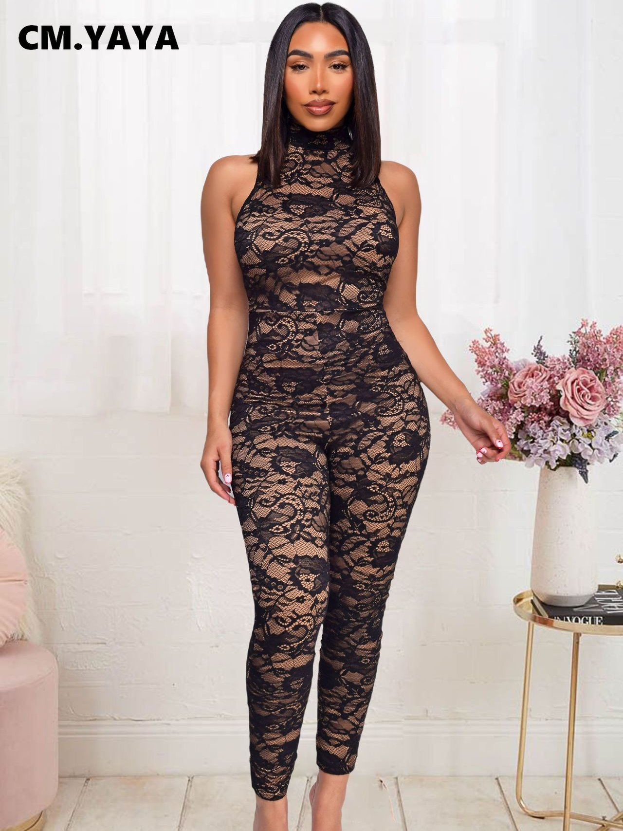 CM.YAYA Elegant Lace Floral Women Sleeveless Bodycon Jumpsuit 2022 Summer Office Lady Chic Sexy Party One Piece Overall Playsuit