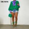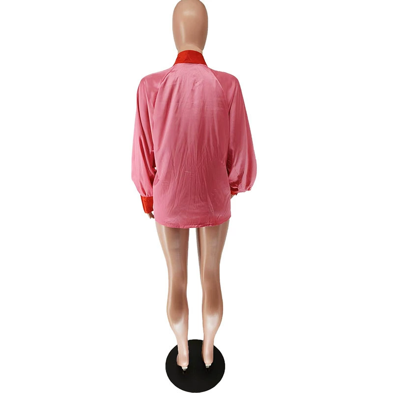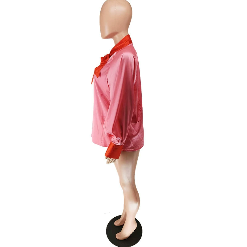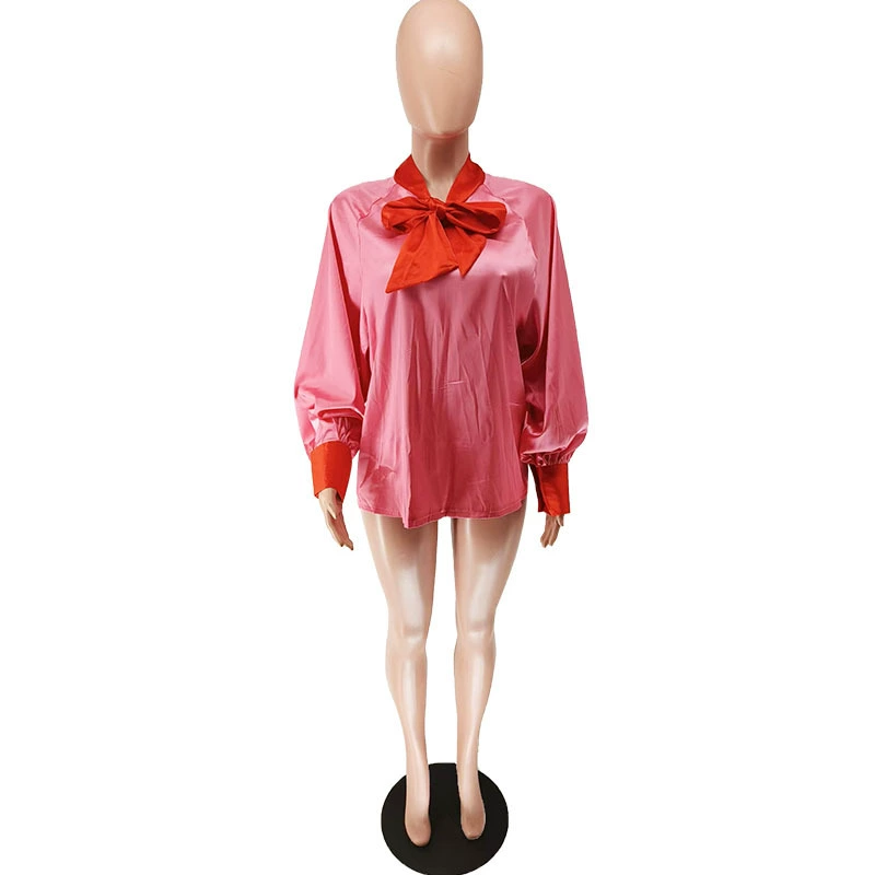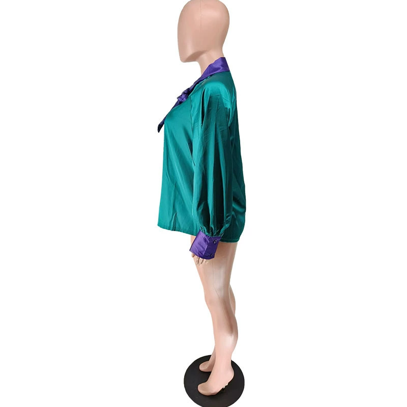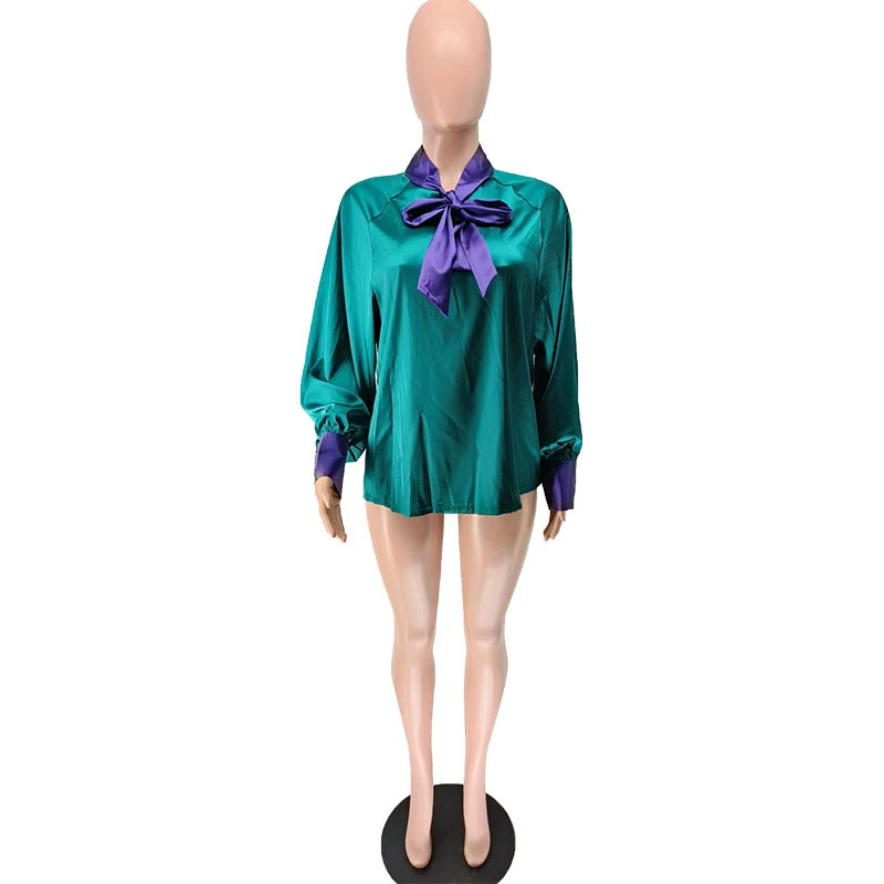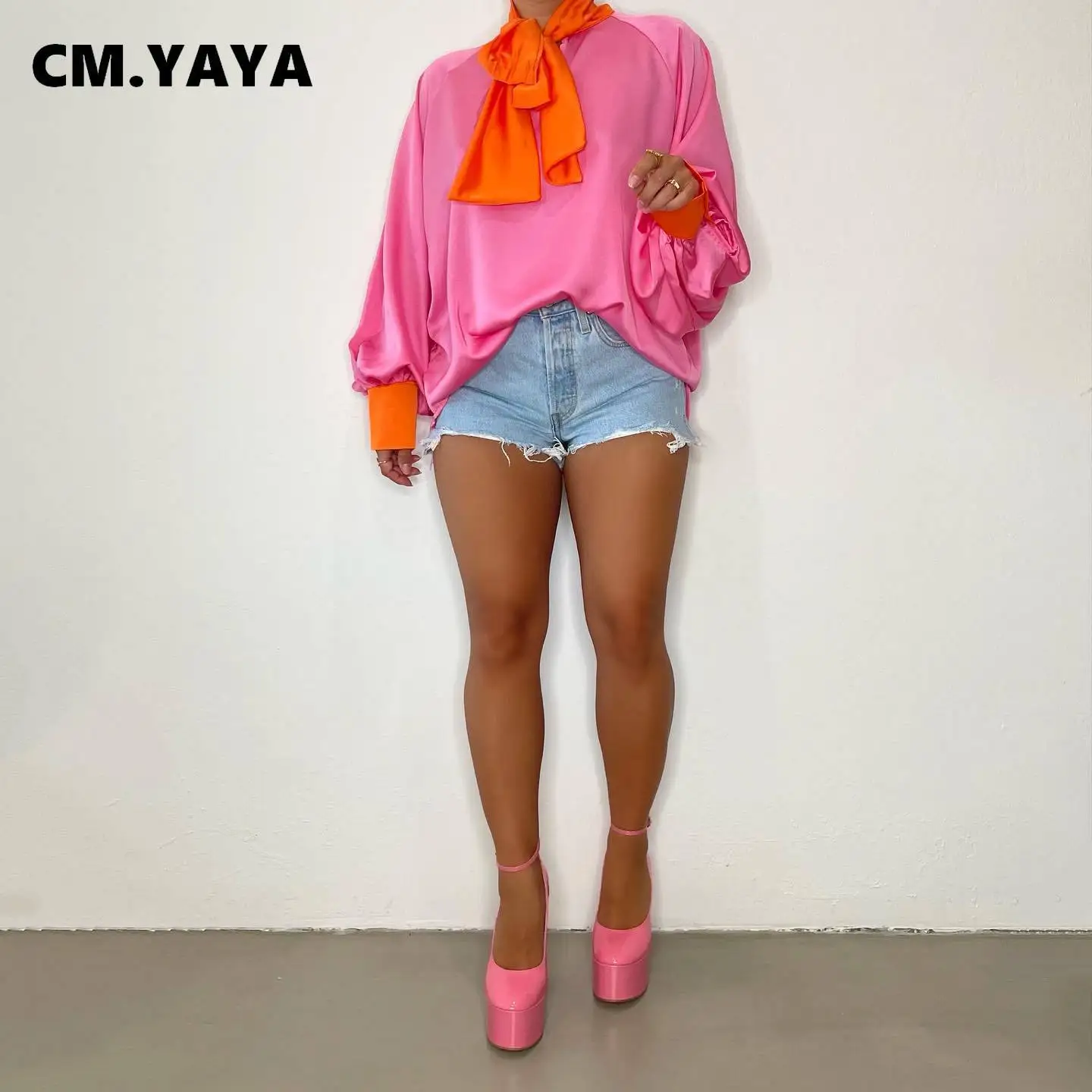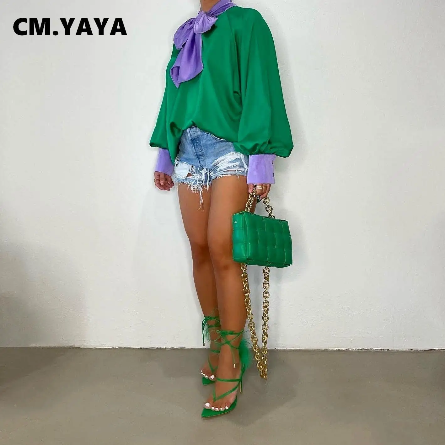 CM.YAYA Elegant Women Bow Neck Lantern Long Sleeve Patchwork Satin Blouse Top for 2022 Streetwear Chic Green Pink Shirt Tops