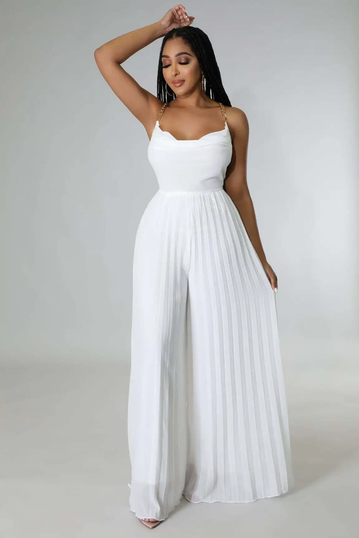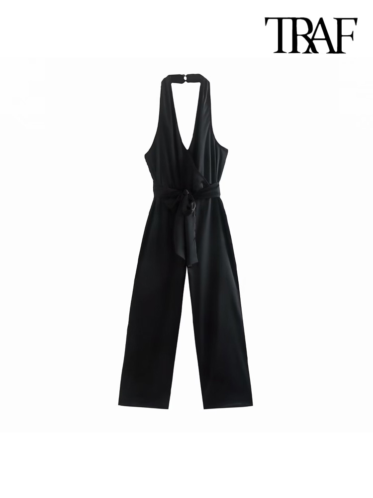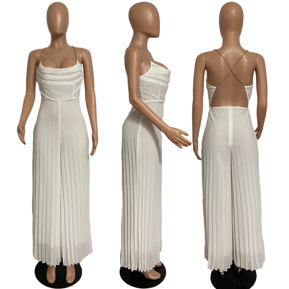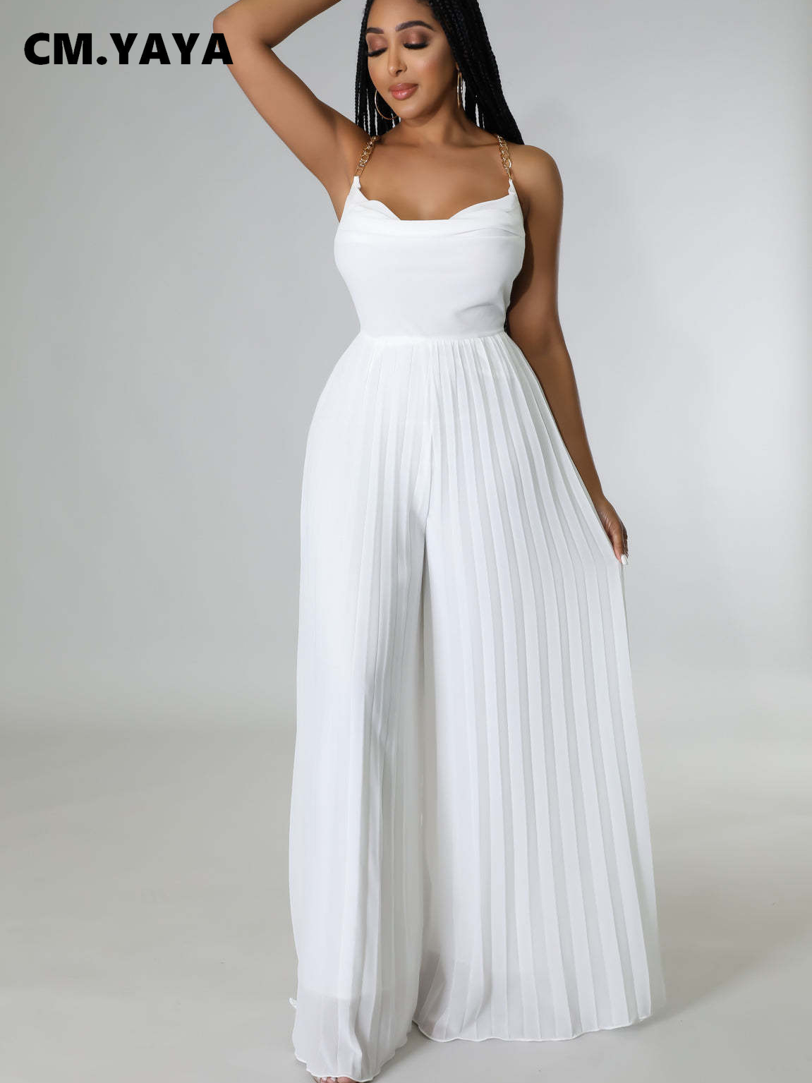 CM.YAYA Elegant Women Halter Neck Backless High Waist Pleated Loose Jumpsuit Chic Streetwear Party Wide Leg Straight Playsuit