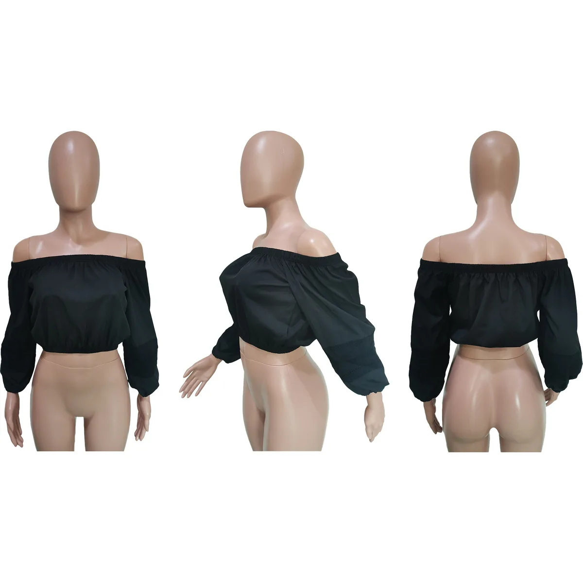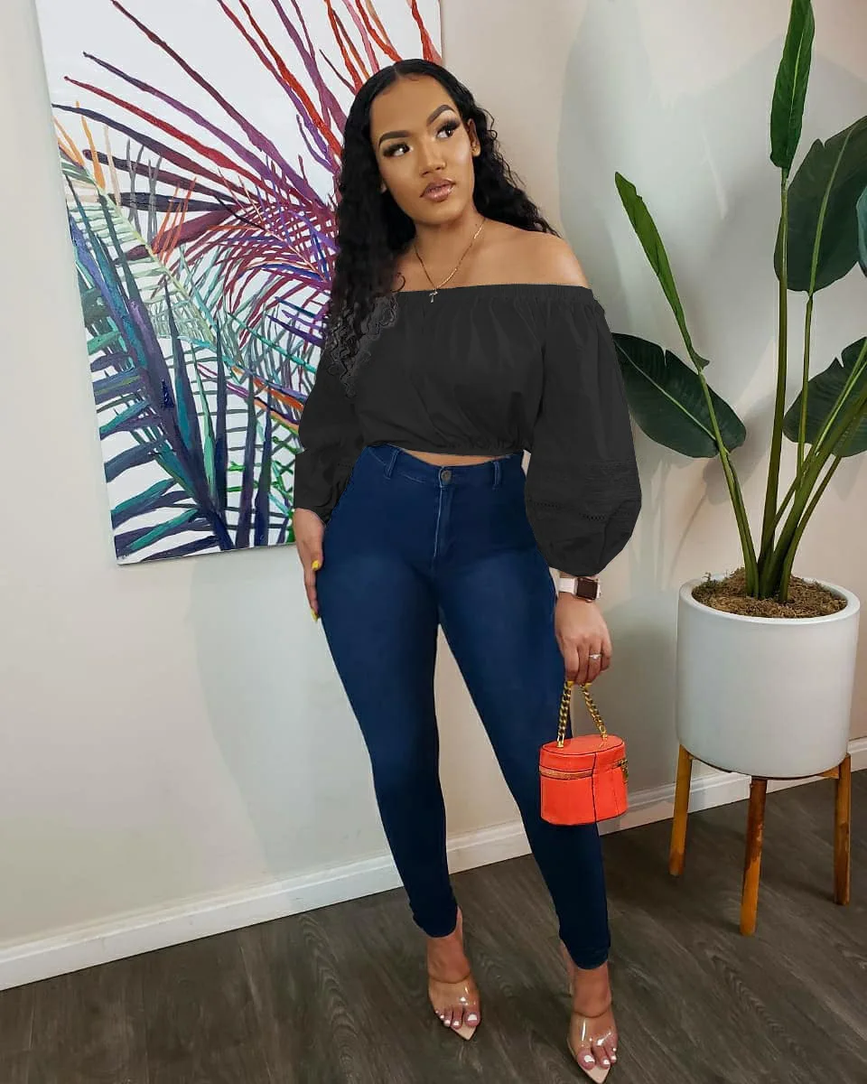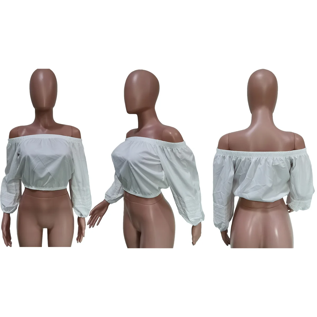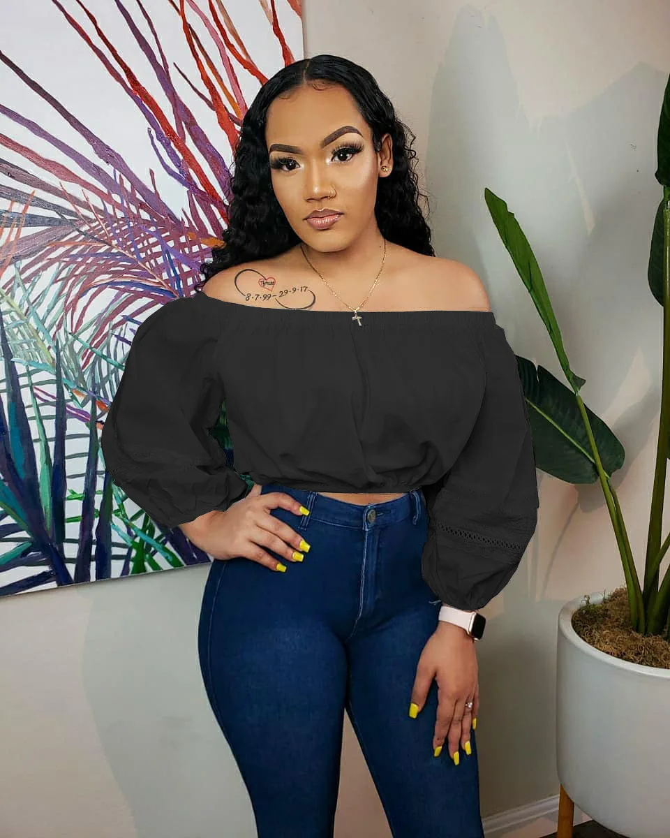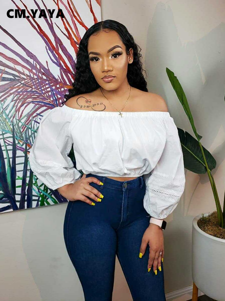 CM.YAYA Elegant Women Off Shoulder Lace Patchwork Lantern Long Sleeve White Black Mini Blouse Shirt Tops